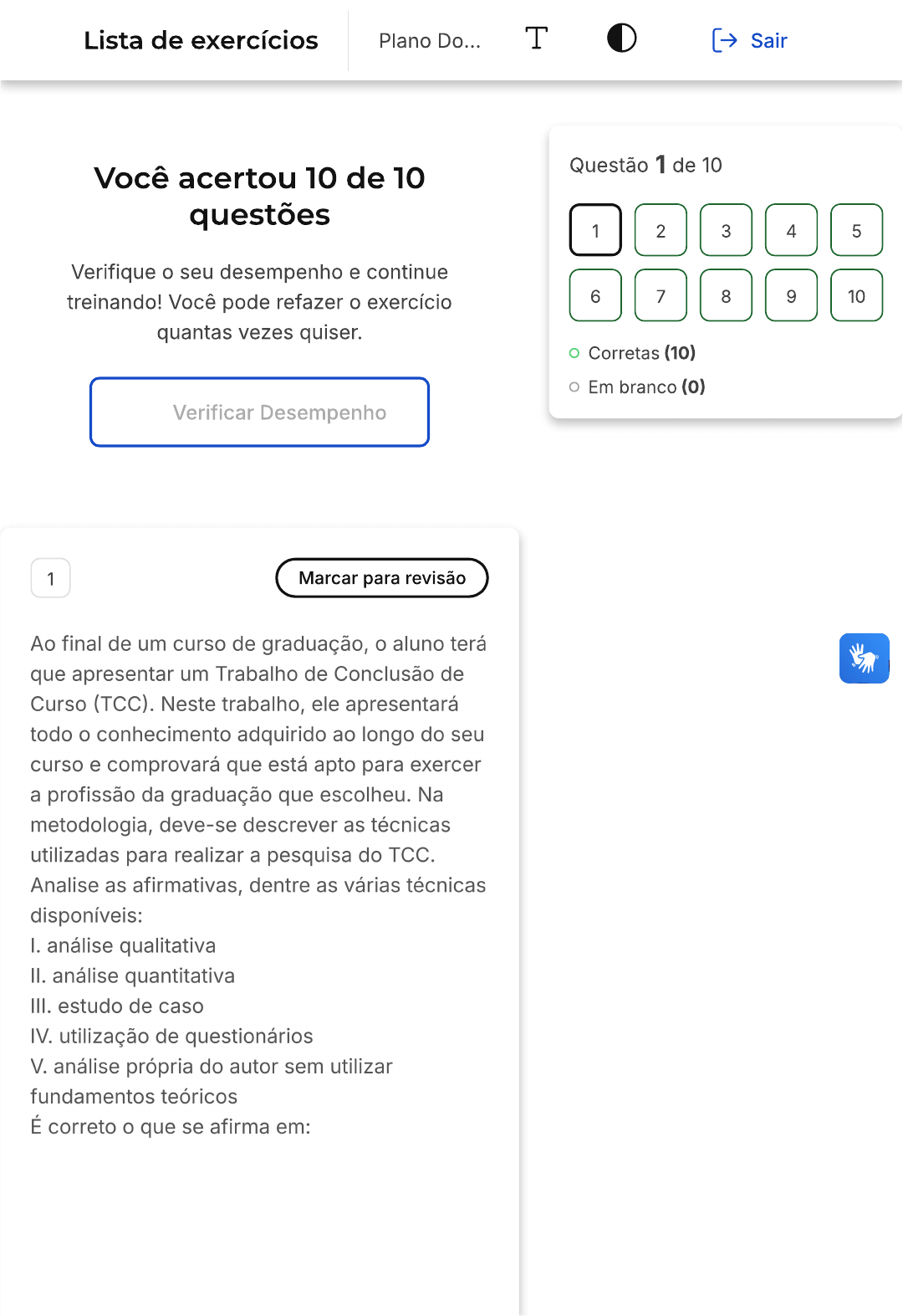 Lista de exercícios Plano Do... T Sair Questão 1 de 10 Você acertou 10 de 10 questões 1 2 3 4 5 Verifique o seu desempenho e continue treinando! Você pode refazer o exercício 6 7 8 9 10 quantas vezes quiser. Corretas (10) Em branco (0) Verificar Desempenho 1 Marcar para revisão Ao final de um curso de graduação, o aluno terá que apresentar um Trabalho de Conclusão de Curso (TCC). Neste trabalho, ele apresentará todo o conhecimento adquirido ao longo do seu curso e comprovará que está apto para exercer a profissão da graduação que escolheu. Na metodologia, deve-se descrever as técnicas utilizadas para realizar a pesquisa do TCC. Analise as afirmativas, dentre as várias técnicas disponíveis: I. análise qualitativa II. análise quantitativa III. estudo de caso IV. utilização de questionários V. análise própria do autor sem utilizar fundamentos teóricos É correto o que se afirma em:A I, II, III e IV. B I, III, IV e V. C I, e IV. D III, IV e V. E I, II, III, IV e V. Resposta correta Parabéns, você selecionou a alternativa correta. Confira o gabarito comentado! Gabarito Comentado Na metodologia de um Trabalho de Conclusão de Curso (TCC), é fundamental indicar quais serão os procedimentos e as técnicas utilizados na pesquisa. Entre as técnicas mais comuns estão a análise qualitativa, a análise quantitativa, a utilização de questionários e o estudo de caso. Todas essas técnicas devem ser fundamentadas em teorias existentes, o que invalida a opção V, que sugere uma análise própria do autor sem utilizar fundamentos teóricos. Portanto, a alternativa correta é a A, que inclui as técnicas I, II, III e IV.2 Marcar para revisão Ao final de um curso de graduação, o aluno terá que apresentar um Trabalho de Conclusão de Curso (TCC). Neste trabalho, ele apresentará todo o conhecimento adquirido ao longo do seu curso e comprovará que está apto para exercer a profissão da graduação que escolheu. De acordo com as normas ABNT voltadas para o desenvolvimento de um TCC, analise as afirmativas sobre todas as fontes abaixo que podem servir como referência bibliográfica para um TCC e como devem ter a formatação descrita de acordo com o tipo: I. Constituição federal ou estadual- Exemplo de referência: BRASIL, Lei. II. Legislação comum- Exemplo: BRASIL. Lei n° X.XXX, de XX de mês de ANO. Função da lei. Diário Oficial da União, Brasília, DF, V. XX, n. XX, data de publicação do diário onde a lei foi divulgada. Seção, páginas. III. Artigo de revista- Exemplo: SOBRENOME, nome abreviado. Título do artigo. Título da Revista, (abreviado ou não) Local de Publicação, Número do Volume, Número do Páginas inicial-final, mês e ano. IV. Tese- Exemplo: SOBRENOME, nome. Título: subtítulo. Ano de apresentação. Número de folhas ou volumes. (Categoria e área de concentração) - Instituição, Local, ano da defesa. V. Livro com um autor- Exemplo: Nome Abreviado. Título: subtítulo (se houver). Edição (se houver). Local de publicação: Editora, data de publicação da obra. É correto o que se afirma em:A II, III, IV e V são verdadeiras B Apenas e III são verdadeiras C I, III, IV e V são verdadeiras D I, II, III e V são verdadeiras E Apenas e II são verdadeiras Resposta correta Parabéns, você selecionou a alternativa correta. Confira o gabarito comentado! Gabarito Comentado De acordo com a Norma ABNT para TCC, a Constituição federal ou estadual pode ser uma referência bibliográfica do TCC, mas a formatação correta para essa referência é: BRASIL. Constituição (1988). Constituição da República Federativa do Brasil. Brasília, DF: Senado Federal: Centro Gráfico, 1988. Página. As outras fontes bibliográficas corretas e seus respectivos formatos são: Legislação comum, Artigo de revista, Tese e Livro (de um ou mais autores). Portanto, as afirmativas II, III, IV e V estão corretas, o que corresponde à alternativa A.3 Marcar para revisão Ao final de um curso de graduação, o aluno terá que apresentar um Trabalho de Conclusão de Curso (TCC). Neste trabalho, ele apresentará todo o conhecimento adquirido ao longo do seu curso e comprovará que está apto para exercer a profissão da graduação que escolheu. número de páginas obrigatório para um TCC é: A Entre 15 e 30 páginas B Menos de 35 páginas Entre 10 e 25 páginas, excluindo-se os C elementos pré-textuais Acima de 25 páginas, incluindo D elementos textuais e pré-textuais Não há um número de páginas E obrigatório Resposta correta Parabéns, você selecionou a alternativa correta. Confira o gabarito comentado! Gabarito Comentado A resposta correta é a alternativa E. Não existe um número mínimo ou máximo de páginas estipulado para um Trabalho de Conclusão de Curso (TCC). que é realmente importante é que o conteúdo apresentado seja claro, coerente ecompleto, contendo todos os elementos pré-textuais e textuais necessários. Além disso, é fundamental que o trabalho esteja de acordo com as normas da ABNT. Portanto, a quantidade de páginas pode variar de acordo com a complexidade do tema abordado e a profundidade da pesquisa realizada pelo aluno. 4 Marcar para revisão Ao final de um curso de graduação, o aluno terá que apresentar um Trabalho de Conclusão de Curso (TCC). Neste trabalho, ele apresentará todo o conhecimento adquirido ao longo do seu curso e comprovará que está apto para exercer a profissão da graduação que escolheu. A Norma ABNT é fundamental para a formatação do TCC. Analise as afirmativas sobre a Norma ABNT para TCC: I. As normas ABNT para TCC ajudam a organizar as informações e estruturá-las dentro do trabalho; II. As recomendações da ABNT são importantes nos trabalhos de pesquisa pois criam um padrão compreendido internacionalmente; III. O conhecimento científico formatado segundo as normas técnicas traz confiabilidade e segurança aos pesquisadores e demais leitores; IV. As Normas ABNT para TCC pod