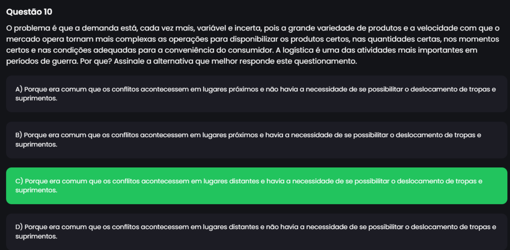 Questão 10 O problema é que a demanda está, cada vez mais, variável e incerta, pois a grande variedade de produtos e a velocidade com que mercado opera tornam mais complexas as operações para disponibilizar os produtos certos, nas quantidades certas, nos momentos certos e nas condições adequadas para a conveniência do consumidor. A logística é uma das atividades mais importantes em períodos de guerra. Por que? Assinale a alternativa que melhor responde este questionamento. A) Porque era comum que os conflitos acontecessem em lugares próximos e não havia a necessidade de se possibilitar deslocamento de tropas e suprimentos. B) Porque era comum que os conflitos acontecessem em lugares próximos e havia a necessidade de se possibilitar deslocamento de tropas e suprimentos. c) Porque era comum que os conflitos acontecessem em lugares distantes e havia a necessidade de se possibilitar deslocamento de tropas e suprimentos. D) Porque era comum que os conflitos acontecessem em lugares distantes e não havia a necessidade de se possibilitar deslocamento de tropas e suprimentos.Questão 9 A diferenciação pelas suas características físicas e tecnológicas está mais difícil e é mais rapidamente copiada. O exemplo dos carros populares no Brasil e dos automóveis que usam mais de um tipo de combustível provam esta tendência. O ciclo de vida dos produtos está cada vez menor devido às mudanças frequentes no perfil de consumo devido Qual conceito que preenche corretamente esta lacuna? A) Aos novos entrantes. B) Aos valores da empresa. c) Aos fornecedores. D) exigências dos consumidores. E) À globalização.Questão 8 Os produtos estão se tornando cada vez mais semelhantes no ponto de vista dos clientes. A atualização de tecnologias, processos produtivos mais eficientes e eficazes e acesso a fornecedores que garantam insumos de qualidade, são fatos que permitem que os fabricantes de um mesmo produto estejam em um mesmo nível. Isso leva as empresas a buscarem que? A) Padronização. B) Liderança em custo. c) Clientes. D) Fornecedores. E) Diferenciação.Questão 7 A visão sobre a logística mudou recentemente, antes era vista como despesa para as empresas, hoje ela é conhecida como forma de redução de custos e uma possibilidade de agregar valor. Tanto a logística, quanto desempenham um papel importantíssimo para maximização da lucratividade da empresa. Marque a alternativa que melhor preencheria esta lacuna. A) A gestão de estoques. B) O relacionamento com cliente. c) A gestão de materiais. D) posicionamento estratégico. E) A vantagem competitiva.Questão 6 A atividade logística e de gestão de materiais da empresa é essencial para as organizações. Além disso, ao atuarmos em uma economia globalizada, esses processos se tornam em fatores críticos de sucesso para qualquer tipo de negócio, pois são essas atividades que possibilitarão atendimento das demandas de nossos clientes. O que isso quer dizer? A) processo logístico e de gestão de materiais eficaz entregam valor para cliente. B) O processo logístico e de gestão de materiais eficaz causam a divisão entre departamentos. c) O processo logístico e de gestão de materiais eficaz melhoram relacionamento interno. D) O processo logístico e de gestão de materiais eficaz aumentam a lucratividade. E) O processo logístico e de gestão de materiais eficaz melhoram apenas a atividade de transporte.Questão 4 Nas empresas a utilização das e O reconhecimento do seu potencial de criar sobre os concorrentes é bem mais recente. Assim, de acordo com que foi visto no decorrer da unidade, assinale a alternativa que preenche corretamente as lacunas. A) Ferramentas logísticas, vantagens competitivas. B) Vantagens competitivas, criação de valor. c) Vantagens competitivas, ferramentas logísticas. D) Criação valor, vantagens competitivas. E) Ferramentas logísticas, criação de valor.Questão 1 O produto certo, no lugar certo, na hora certa, parte de uma das definições de logística, tem se tornado uma preocupação do marketing para garantir a satisfação do cliente e prover um nível de serviço superior. A atividade logística e de gestão de estoques passou a ser vista como: A) Fonte de complexidade. B) Fonte de boa gestão. c) Fonte de recursos. D) Fonte de competitividade. E) Fonte de conflitos internos.