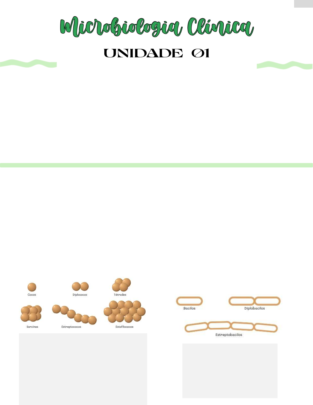 1 Resumo feito por Wanessa Mello Unidade 1 – Tópico 1: Introdução a bacteriologia clínica Microrganismos: A maioria é benéfica, e apenas uma pequena parcela é patogênica. Estima-se que existam cerca de 10 milhões de bactérias, mas apenas algumas centenas são patogênicas. Microbioma: As bactérias estão presentes em todos os ambientes, incluindo o corpo humano, onde compõem o microbioma, essencial para a saúde. Aplicações das Bactérias: Produção de alimentos (queijos, iogurtes), bebidas (cervejas, vinhos), antibióticos (penicilina) e vacinas. Desequilíbrio do Microbioma: Pode levar a infecções endógenas (causadas por microrganismos já presentes no corpo) ou exógenas (introduzidos externamente). Seres microscópicos: Bactérias, fungos, vírus e parasitos. Bactérias São seres procariontes (unicelulares simples, não possuem membrana nuclear, mitocôndrias, complexo de Golgi e sem retículo endoplasmático), reprodução é assexuada por divisão binária; São classificadas conforme a morfologia (cocos, bacilos, flageladas, espiroquetas, vibrios) e técnicas de coloração, como a Coloração de Gram (que diferencia bactérias Gram-positivas e Gram-negativas) e a Coloração de Ziehl-Neelsen (usada para identificar bactérias álcool-ácido-resistentes, como as micobactérias causadoras de tuberculose e lepra). Morfologia Bacteriana Cocos: são arredondados, podendo apresentar arranjos variados, como: isolados, diplococos, tretacocos, sarcinas, estreptococos e estafilococos. Dicas para diferenciar: Cocos: únicos e simples Diplococos: cocos em dupla Tétrade: cocos em grupos de quatro Sarcinas: grupos de oito cocos que formam um cubo Estreptococos: cocos em cadeia Estafilococos: cocos agrupados como cachos de uva Bacilos: se apresentam em formato mais alongado, se assemelhando a um bastão ou bastonetes, possuem menor número de agrupamentos, comparado aos cocos. Dicas para diferenciar: Bacilos: únicos e simples Diplobacilos: bacilos em dupla Estreptobacilos: bacilos em cadeia 2 Resumo feito por Wanessa Mello Outras: Ainda existem as bactérias em formato de espirilos. Não são retas, apresentam uma ou mais curvaturas. Dicas para diferenciar Vibrião: são bastões curvos, lembra uma vírgula Espirilo: se assemelham a um saca-rolhas, apresenta corpo rígido. Um apêndice externo permite sua locomoção Espiroquetas: formato helicoidal flexível, se movimentam a partir de filamentos axiais Estrutura Bacteriana Cápsula: Revestimento polipeptídico, gelatinoso, que dificulta a fagocitose e permite maior aderência às células do hospedeiro Fímbrias e pilus: São tipo "pelinhos" mais curtos que os flagelos que facilitam a aderência das células às superfícies. Presentes principalmente nas bactérias gram-negativas. Não estão relacionados a motilidade Flagelo: Responsável pela mobilidade da célula, as bactérias que tem um único flagelo são chamadas monotríquias e as com inúmeros flagelos são denominadas peritríquias Parede celular: Envolve a membrana plasmática, apresenta peptideoglicano Membrana plasmática: Reveste o citoplasma, é seletivamente permeável e possui enzimas para reações metabólicas Citoplasma: Componente líquido presente no interior da membrana plasmática, composto principalmente de água Nucleoide: É onde está contido o DNA do cromossomo bacteriano Ribossomos: Pequenos corpos granulares onde ocorre a síntese proteica, formado por rRNA e proteína 3 Resumo feito por Wanessa Mello Difença da Pede Celul das Bactérias Gram-Positivas vs Gram-Negativas Passo a passo da técnica de Coloração de Gram: 1°) Consiste em fixar a bactéria na lâmina. Para isso, adiciona-se uma gota de solução fisiológica a 0,85% e mistura-se com uma amostra de bactéria coletada com uma alça bacteriológica. Em seguida, a lâmina é passada na chama até a solução secar, preparando-a para a coloração. 2°) O cristal violeta é o primeiro corante utilizado, aplicado na lâmina por 1 minuto e depois lavado com água corrente. Ele se liga aos peptidoglicanos da parede celular, colorindo intensamente as bactérias Gram positivas, que possuem uma camada espessa desse composto. 3°) O segundo corante, o lugol, é aplicado na lâmina por 1 minuto para fixar o cristal violeta na parede bacteriana, sendo em seguida lavado com água corrente. 4°) A descoloração é realizada com álcool etílico (99,5º GL), aplicado várias vezes até que o corante não se desprenda mais. As Gram positivas permanecem roxas, enquanto as Gram negativas, com menos peptidoglicano, perdem a coloração. Na etapa final, utiliza-se Safranina ou fucsina para colorir as Gram negativas. 5°) O último corante, Safranina ou fucsina, é aplicado na lâmina por 30 segundos, seguida de lavagem com água corrente e secagem natural. As lâminas devem ser observadas com a objetiva de 100x, utilizando uma gota de óleo de imersão para melhor clarificação. O que permite a diferenciação entre Gram positivas (Gram +) e Gram negativas (Gram -) é a permeabilidade na parede das bactérias. As bactérias Gram positivas retêm o cristal violeta devido à espessa parede de peptidoglicanos (mureína) (polímero constituído por açúcares e aminoácidos que originam uma espécie de malha na região exterior à membrana celular das bactérias) e por esta razão as bactérias deste grupo coram de roxo. 4 Resumo feito por Wanessa Mello Gram Positivas As bactérias Gram positivas possuem diversas camadas de peptidoglicano, de forma que a estrutura apresenta-se rígida e espessa. Além disso, as bactérias Gram-positivas incluem ácidos teicoicos, que são constituídos principalmente de álcool e fosfato. Por conta dos grupos fosfatos presentes nos ácidos teicoicos, que possuem carga negativa, é possível ligar e regular o movimento de íons positivos para dentro e para fora da célula. Esses ácidos também podem impedir a fissura extensa da parede e a provável lise celular. As 