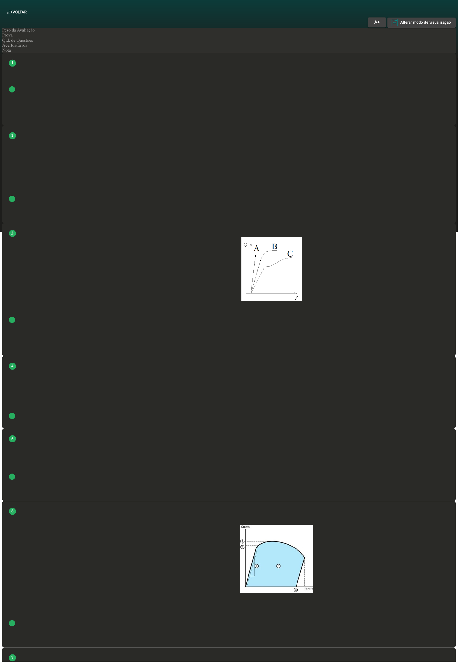 Prova Impressa GABARITO | Avaliação I - Individual (Cod.:1023983) Peso da Avaliação 2,00 Prova 95575293 Qtd. de Questões 10 Acertos/Erros 10/0 Nota 10,00 Com a execução de ensaios mecânicos em materiais podemos determinar diversas de suas propriedades. Com relação às propriedades mecânicas, podemos destacar a resistência mecânica, a ductilidade, a tenacidade e a resiliência. Com base na tenacidade, assinale a alternativa CORRETA: A É a capacidade que um material tem de sofrer uma deformação não permanente. B É capacidade do material de absorver energia de deformação antes da fratura. C Trata-se da capacidade de um material em sofrer deformação permanente quando submetido a um esforço mecânico. D É a quantidade de trabalho realizado em uma solicitação que irá levar o material à fratura. Quando um material sob tensão se encontra no regime elástico, a relação entre a tensão aplicada e a deformação (elástica) é matematicamente representada pela Lei de Hooke. Com relação a essa definição, analise as sentenças a seguir: I- A relação entre a tensão aplicada e a deformação, no regime elástico, é linear. Essa relação é válida somente no regime elástico. II- A inclinação da curva no regime elástico é representada pelo Módulo de Elasticidade. III- A relação entre a tensão aplicada e a deformação elástica é representada por uma função do tipo logarítmica, cujos coeficientes representam a taxa de encruamento do material. Assinale a alternativa CORRETA: A As sentenças II e III estão corretas. B Somente a sentença III está correta. C As sentenças I e II estão corretas. D Somente a sentença II está correta. A partir da medição da variação de tensão e deformação é obtido o diagrama de tensão x deformação de um material. A figura a seguir ilustra de forma esquemática um diagrama Tensão-Deformação para três materiais diferentes (A, B e C), para as mesmas condições de temperatura e velocidade de carregamento. Com base no exposto, assinale a alternativa CORRETA: A Os materiais B e C não sofrem deformação plástica antes da ruptura. B O material A possui a maior rigidez dentre os materiais apresentados. C O material A possui o menor módulo de elasticidade dentre os materiais apresentados. D O material B é o mais rígido dentre os materiais apresentados. A resistência dos materiais é, na verdade, um conjunto de capítulos, divididos em função do tipo de esforço que possa vir a comprometer a peça ou estrutura em questão. Existem alguns tipos de esforços que geram tensões. Sobre o Esforço de Compressão, assinale a alternativa CORRETA: A Esforço que tende a cortar ou cisalhar o corpo/estrutura em questão. Trata-se de um esforço transversal (perpendicular ao eixo) e a tensão correspondente é a tensão tangencial. B Esforço que tende a esticar ou alongar o corpo/estrutura em questão. Trata-se de um esforço axial (ao longo do eixo) e a tensão correspondente é a tensão normal. C Esforço que tende a flexionar ou encurvar uma viga/eixo em questão. Trata-se de um esforço normal e a tensão correspondente é a tensão normal. D Esforço que tende a “empurrar” ou encurtar o corpo/estrutura em questão. Trata-se também de um esforço axial (ao longo do eixo) e a tensão correspondente é a tensão normal. A resiliência é uma característica que define a capacidade de um determinado material absorver energia de impacto. Sabemos que é importante não confundir resiliência com rigidez ou resistência. Sobre o exposto, assinale a alternativa INCORRETA: A Rigidez é a capacidade de um corpo de resistir às deformações. B Resistência é a capacidade de um corpo de resistir à ação de forças. C Os materiais de pequena resiliência são chamados tenazes, enquanto os de grande resiliência são chamados frágeis. D Resiliência é a resistência aos choques. O conhecimento das propriedades mecânicas é vital para que um engenheiro, ou profissional especializado, possa tomar a decisão acertada a respeito dos materiais utilizados em um determinado projeto. Neste contexto, analisando o gráfico em anexo, assinale a alternativa CORRETA: FONTE: SHACKELFORD, James F. Introduction to materials science for engineers. Upper Saddle River: Pearson, 2016. p. 155. A Os números 2 e 3 são, respectivamente, a tensão máxima e a tensão de ruptura. B O número 1 é conhecido como limite de proporcionalidade. C O número 4 diz respeito à ductibilidade do material. D O número 5 representa a resiliência do material. Consiste em uma aplicação da lei de Hooke à resistência dos materiais, relacionando tensão x deformação.Sobre o exposto, assinale a alternativa CORRETA: VOLTAR A+ Alterar modo de visualização 1 2 3 4 5 6 7 A Força normal. B Força tangencial. C Módulo de elasticidade. D Carga intermitente. A diagrama tensão x deformação do latão (liga de cobre e zinco) é apresentado na figura em anexo. A partir dessa curva tensão deformação, qual a variação no comprimento, em mm, de um corpo de prova originalmente com 250 mm submetido a tensão de tração de 345 MPa (ponto A), assinale a alternativa CORRETA: FONTE: CALLISTER, William D.; RETHWISCH, David G. Materials science and engineering: an introduction. New York: Wiley, 2018. p. 165. A 15. B 0,06. C 2,4. D 4,16. Considere dois materiais distintos, denominados "X" e "Y", cujas curvas de tensão vs. deformação estão demonstradas na figura. Sobre as características desses materiais, analise as sentenças a seguir: I- O material Y apresenta maior resistência mecânica que o material X. II- O material X apresenta menor tenacidade do que o material Y. III- O material X tem maior ductilidade do que o material Y. Assinale a alternativa CORRETA: A As sentenças I e III estão corretas. B As sentenças II e III estão corretas. C As sentenças I e II estão corretas. D Somente a sentença II está correta. O estudo das propriedades mec