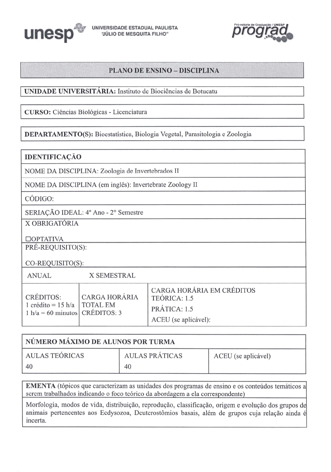 Pró-reitoria de Graduação / UNESP UNIVERSIDADE ESTADUAL PAULISTA unesp DE MESQUITA FILHO" prograd PLANO DE ENSINO - DISCIPLINA UNIDADE UNIVERSITÁRIA: Instituto de Biociências de Botucatu CURSO: Ciências Biológicas - Licenciatura DEPARTAMENTO(S) Bioestatística, Biologia Vegetal, Parasitologia e Zoologia IDENTIFICAÇÃO NOME DA DISCIPLINA: Zoologia de Invertebrados II NOME DA DISCIPLINA (em inglês): Invertebrate Zoology II CÓDIGO: SERIAÇÃO IDEAL: 4° Ano - 2° Semestre X OBRIGATÓRIA OPTATIVA PRÉ-REQUISITO(S): CO-REQUISITO(S): ANUAL X SEMESTRAL CARGA HORÁRIA EM CRÉDITOS CRÉDITOS: CARGA HORÁRIA TEÓRICA: 1.5 1 crédito = 15 h/a TOTAL EM PRÁTICA: 1.5 1 h/a = 60 minutos CRÉDITOS: 3 ACEU (se aplicável): NÚMERO MÁXIMO DE ALUNOS POR TURMA AULAS TEÓRICAS AULAS PRÁTICAS ACEU (se aplicável) 40 40 EMENTA (tópicos que caracterizam as unidades dos programas de ensino e os conteúdos temáticos a serem trabalhados indicando o foco teórico da abordagem a ela correspondente) Morfologia, modos de vida, distribuição, reprodução, classificação, origem e evolução dos grupos de animais pertencentes aos Ecdysozoa, Deuterostômios basais, além de grupos cuja relação ainda é incerta.OBJETIVOS (ao término da disciplina, o aluno deverá ser capaz de) Treinar o aluno de modo que, no final da disciplina, ele possa comparar os grupos Ecdysozoa (Nematomorpha, Nematoda, Scalidophora, Onychophora, Tardigrada, Artrhopoda), Chaetognatha, Echinodermata e Hemichordata, quanto à morfologia de cada grupo e a sua relação com hábitos de vida do animal ou como ela reflete a origem evolutiva do grupo. Os demais assuntos serão, sempre que possível, abordados tendo em vista a filogenia dos grupos envolvidos, mostrando ao aluno, a sequência histórica da zoologia. CONTEÚDO PROGRAMÁTICO (título e discriminação das unidades programáticas) 1. Ecdysozoa: Apresentação dos argumentos biológicos para este grupamento 2. Nematomorpha: classificação, morfologia, hábitos de vida, reprodução, ciclo de vida e origem evolutiva 3. Nematoda: classificação, morfologia, hábitos de vida, reprodução, ciclo de vida e origem evolutiva 4. Scalidophora, Onychophora e Tardigrada: classificação, morfologia, hábitos de vida, reprodução, ciclo de vida e origem evolutiva 5. Artrhopoda: introdução e caracteres gerais do filo 6. Chelicerata: classificação, morfologia, hábitos de vida, reprodução, ciclo de vida e origem evolutiva 7. Crustacea: classificação, morfologia, hábitos de vida, reprodução, ciclo de vida e origem evolutiva 8. Myriapoda e Hexapoda: classificação, morfologia, hábitos de vida, reprodução, ciclo de vida e origem evolutiva 9. Chaetognatha: classificação, morfologia, hábitos de vida, reprodução, ciclo de vida e origem evolutiva 10. Echinodermata: classificação, morfologia, hábitos de vida, reprodução, ciclo de vida e origem evolutiva 11. Hemichordata: classificação, morfologia, hábitos de vida, reprodução, ciclo de vida e origem evolutiva 12. Avaliações METODOLOGIA DO ENSINO Aula Expositiva (modalidade teórica) Prática de Laboratório realizada pelo professor e alunos (modalidade prática) Prática de Campo realizada pelo professor e alunos (modalidade prática) Exercício de grupo realizado pelos alunos (modalidade Apresentação oral (modalidade outras) AÇÕES EXTENSIONISTAS (conforme Resolução Unesp n° 75/2020) Não se aplica. BIBLIOGRAFIA BÁSICA (apresentar a bibliográfica preferencialmente conforme Norma ABNT 6023/2018) BARNES, R. D. Zoologia de Invertebrados. São Paulo: Livraria Roca Ltda, 1984. 1179 p. BARNES, R. S. K.; P. CALOW; P.J. W. OLIVE; D.W. GOLDING & J. I. SPICER. Os invertebrados: uma nova síntese. 2a. Ed. Atheneu, 2008, 592p. BRUSCA, R. C. & G. J. BRUSCA. Invertebrados. Ed. Guanabara Koogan, 2. ed. 2007. 1092p. FRANSOZO, A. & NEGREIROS-FRANSOZO (organizadores) Zoologia de Invertebrados. Editora Roca, Grupo GEN, 2016, xvii + 661 p.HICKMAN, C.P.; ROBERTS, L.S.; KEEN, EISENHOUR, D.J.; LARSON, A; L'ANSON, H. Princípios Integrados de Zoologia. 15.ed. Rio de Janeiro: Editora Guanabara Koogan, 2013. 951p. MEGLITSCH, P. A. Invertebrate Zoology. New York: Oxford Univ. Press, 1973. 906 p. RIBEIRO-COSTA, C.S. & R.M. ROCHA. Invertebrados Manual de aulas práticas. Ed. Holos, 2003. 226p. RUSSEL-HUNTER, W. D. Biologia dos Invertebrados superiores. São Paulo: Edusp, 1971. 269p. SHERMAN, I. E. & V. G. SHERMAN. The invertebrate: function and forms. New York: Mc Millan Co., 1978. 334 p. BIBLIOGRAFIA COMPLEMENTAR (apresentar a bibliográfica preferencialmente conforme Norma ABNT 6023/2018) AMORIN, D. S. Elementos básicos de sistemática filogenética. São Paulo: Soc. Brasileira de Entomologia, 1994. 314p. CONN, D. B. Atlas of invertebrate reproduction and development. New York: A. John Wiley & Sons, Inc. Publication, 1991. 252p. FUTUYMA, D. J. Biologia evolutiva. Ribeirão Preto: Soc. Brasileira de Genética, 2. ed. 1992. 253p. KAESTNER, A. Invertebrate Zoology. New York: Interscience Publ. vol 2, 3, 1968 and 1970. 396p. MATHES, E. Guia de trabalhos práticos de Zoologia. Coimbra: Atlântida Ed. 1969. 523p. MENDES, J. C. Paleontologia Geral. 2 ed. Rio de Janeiro: Livros Técnicos e Científicos, 1982. 368p. STACHOVITSCH, M. The invertebrates. An illustrated glossary. New York: A. John Wiley & Sons, Inc. Publ., 1992. 676p. CRITÉRIOS DE AVALIAÇÃO DA APRENDIZAGEM Resolução Unesp 106/2012, alterada pelas Resoluções 23/2013 e 75/2016 (notadamente quanto à recuperação) PROVAS: Teórica = T1 (peso 1); T2 (peso 1) Relatórios de aulas práticas = R (peso 1) M T1+T2+R = maior ou igual a 5 = Aprovado 3 PROGRAMA DE RECUPERAÇÃO PROCEDIMENTOS E INSTRUMENTOS PARA RECUPERAÇÃO Os alunos que apresentarem dificuldades de acompanhamento da disciplina e/ou baixo rendimento nas avaliações ao longo do semestre terão oportunidade de realizar a recuperação. O conteúdo programático para a recuperação será o mesmo abordado na disci