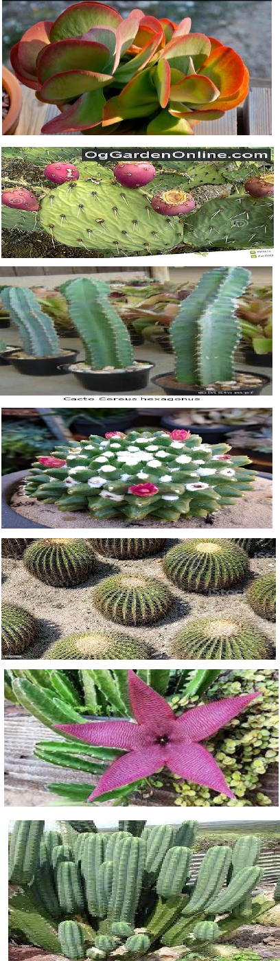 Cacto-Elefante Nome Científico: Opuntia spp. Cacto-Pera Nome Científico: Opuntia ficus-indica Cacto-Coluna Nome Científico: Cereus spp. Cacto-Bola-de-Neve Nome Científico: Mammillaria spp. Cacto-BarriL Nome Científico: Echinocactus grusonii Cacto-Estrela Nome Científico: Astrophytum spp. Cacto-Órgão de São Pedro Nome Científico: Trichocereus pachanoi Cacto Saguaro Nome Científico: Carnegiea gigantea Cacto-Peixe-Pedra Nome Científico: Astrophytum asterias Cacto-Dedo-de-Dama Nome Científico: Echinocereus spp. Cacto-Echinopsis Nome Científico: Echinopsis spp. Cacto-Rabo-de-Macaco Nome Científico: Cleistocactus spp. Cacto-Parafuso Nome Científico: Myrtillocactus spp. Cacto-Cholla Nome Científico: Cylindropuntia spp. Cacto-Lobivia Nome Científico: Lobivia spp.