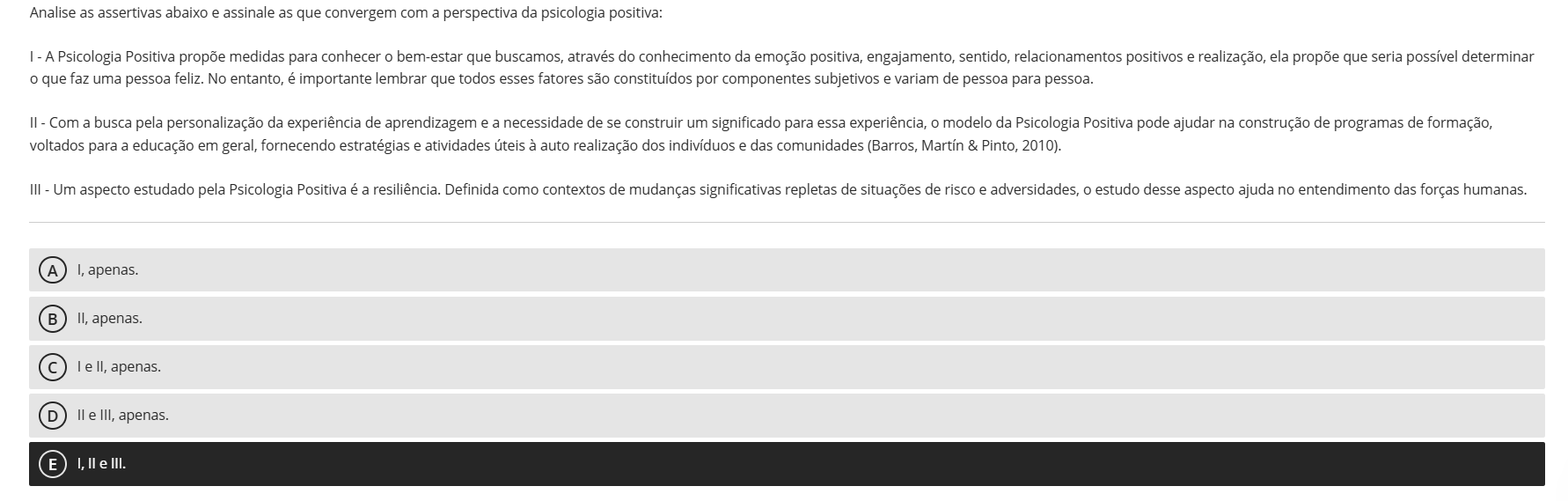 Analise as assertivas abaixo e assinale as que convergem com a perspectiva da psicologia positiva: A Psicologia Positiva propõe medidas para conhecer bem-estar que buscamos, através do conhecimento da emoção positiva, engajamento, sentido, relacionamentos positivos e realização, ela propõe que seria possível determinar que faz uma pessoa feliz. No entanto, é importante lembrar que todos esses fatores são constituídos por componentes subjetivos e variam de pessoa para pessoa. II - Com a busca pela personalização da experiência de aprendizagem e a necessidade de se construir um significado para essa experiência, modelo da Psicologia Positiva pode na construção de programas de formação, voltados para a educação em geral, fornecendo estratégias e atividades úteis à auto realização dos indivíduos e das comunidades (Barros, & Pinto, 2010). III Um aspecto estudado pela Psicologia Positiva é a resiliência. Definida como contextos de mudanças significativas repletas de situações de risco e adversidades, estudo desse aspecto ajuda no entendimento das forças humanas. A I, apenas. B II, apenas. C I e II, apenas. D II e III, apenas. E I, II III.