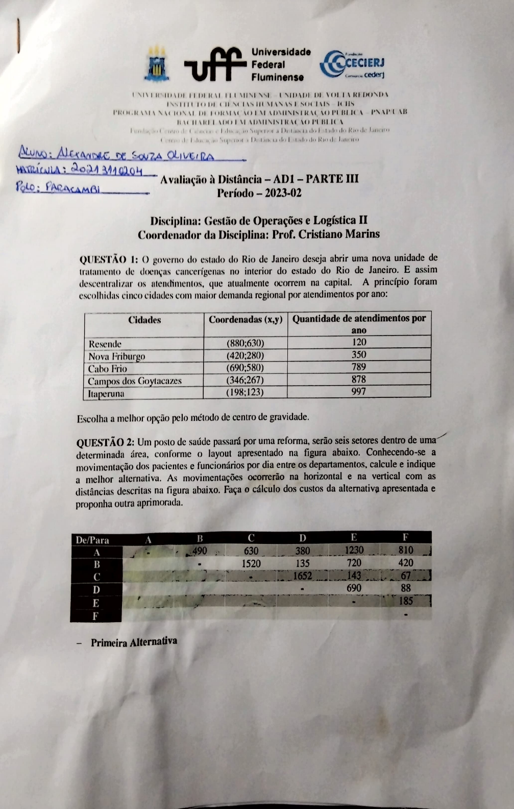 folo; fACAAMOL Cabo Frio QUESTÃO 1: 0 governo do estado do Rio de anciro descja abrir uma nova unidade de tratamento de docnças cancerígenas no interior do estado do Rio de Janeiro. E assim descentralizar os atenhmentos, que atualmente ocorrem na capital. A princípio foram escolhidas cinco cidades com maior demanda regional por atendimentos por ano: Resende Nova Friburgo Itaperuna De/Para A IROGUAMANACIONL DETOoRMACAOIM ADMINISTKAÇ oPBLICA PPUAB IBAHRILADO IADMUNISTKACAOPBLICA IundaçiCeto de inc edoain Supet a Dtoa dottue do Ko de Iac Campos dos Goytacazes B UNIVHIDADL D |UMINI \SL ND\DL DL VOLLA REDOVDI D E C F Disciplina: Gestão de Operações e Logística II Coordenador da Disciplina: Prof. Cristiano Marins Cidades Avaliação à Distância � ADl - PARTE II Período - 2023-02 Universidade Federal Fluminense Escolha a melhor opção pelo método de centro de gravidade. - Primeira Alternativa B Coordenadas (x,y) Quantidade de atendimentos por 490 (880;630) (420;280) (690;580) (346;267) QUESTÃO 2: Um posto de saúde passará por uma reforma, ser�ão seis setores dentro de uma determinada área, conforme o layout apresentado na figura abaixo. Conhecendo -se a movimentação dos pacientes e funcionários por dia entre os departamentos, calcule e indique a melhor alternativa. As nmovimentações ocorrerão na horizontal e na vertical com as distâncias descritas na figura abaixo. Faça o cálculo dos custos da alternativa apresentada e proponha outra aprimorada. (198;123) 630 1520 D 380 135 ano 1652 120 350 789 878 997 E 1230 720 143 690 810 420 67 88 185 DE/PARA A C D UNIVERSD\DE LDERALLUMININSE U NID\DE DL VOLLA RLDONDA INSTWL TODE CILNCIAS IUMANASE SOCIAIS IIS P'ROGR\MACIONAL DE FORMACA0EM ADMINISTRACA) PUBLICA APU AS 20m A Tundacio Cetro de ChenoseLducacán Suptoa Dtana dolstlo do Riode Jacito Ceotto deLucaao Supeior a lDtca do stado do Rode lairO 100 180 250 300 280 A IB\CHARILAD0EMADMINISTRACAO PUBLICA D QUESTÃO 3: Uma empresa vai localizar sua fábrica na região apresentada na figura abaixo. Com os dados da tabela, em que cidade deve ela ser localizada? B 100 100 180 230 210 20m 250 C 180 100 80 100 130 B MATRIZ DE ORIGEM-DESTINO Distância em KM -X 110 E Universidade Federal Fluminense D 60m 250 80 180 50 30 180 80 E 300 CcrCIERJ 230 130 50 100 80 C F 280 CCederj 210 110 30 80 Custo Quant. R$/t.km Toneladas 5 5 3 30 40 30 10 15 25 OFF- UNVesia E FeveAL FUMNENSE AyNe- ALEkaNS DE Sov ZA QVEIMA THE 9 2018 Apple Corps Ltda. A Beatles TM Product Ao5Go0 t 44000 54440+ 3a3788+194406 34534 -cAADES 4500t 9%e00+ 454620+34426+ 234 |NoVA FRBVrG CABo FRUo X TAPERuNA RESROSTA tEATIES 444, 23 345,34 X 346 30 :Poaame S% 123 |ATENDI mENOS Pol ANO 350 997 3434 444009 %ooo S44440 3434 30373 234426 A22634 |A974o6 A-B A-c A-D A A-E A-F B-