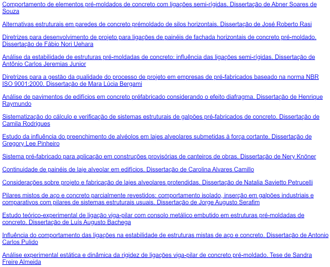 Comportamento de elementos pré-moldados de concreto com ligações semi-rígidas. Dissertação de Abner Soares de Souza Alternativas estruturais em paredes de concreto prémoldado de silos horizontais. Dissertação de José Roberto Rasi Diretrizes para desenvolvimento de projeto para ligações de painéis de fachada horizontais de concreto pré-moldado. Dissertação de Fábio Nori Uehara Análise da estabilidade de estruturas pré-moldadas de concreto: influência das ligações semi-rígidas. Dissertação de Antônio Carlos Jeremias Junior Diretrizes para a gestão da qualidade do processo de projeto em empresas de pré-fabricados baseado na norma NBR ISO 9001:2000. Dissertação de Mara Lúcia Bergami Análise de pavimentos de edifícios em concreto préfabricado considerando o efeito diafragma. Dissertação de Henrique Raymundo Sistematização do cálculo e verificação de sistemas estruturais de galpões pré-fabricados de concreto. Dissertação de Camila Rodrigues Estudo da influência do preenchimento de alvéolos em lajes alveolares submetidas à forca cortante. Dissertação de Gregory Lee Pinheiro Sistema pré-fabricado para aplicação em construções provisórias de canteiros de obras. Dissertação de Nery Continuidade de painéis de laje alveolar em edifícios. Dissertação de Carolina Alvares Camillo Considerações sobre projeto e fabricação de lajes alveolares protendidas. Dissertação de Natalia Savietto Petrucelli Pilares mistos de e concreto parcialmente revestidos: comportamento isolado, inserção em galpões industriais e comparativos com pilares de sistemas estruturais usuais. Dissertação de Jorge Augusto Serafim Estudo teórico-experimental de ligação viga-pilar com consolo metálico embutido em estruturas pré-moldadas de concreto. Dissertação de Augusto Bachega Influência do comportamento das ligações na estabilidade de estruturas mistas de aco e concreto. Dissertação de Antonio Carlos Pulido Análise experimental estática e dinâmica da rigidez de ligações viga-pilar de concreto pré-moldado. Tese de Sandra Freire Almeida