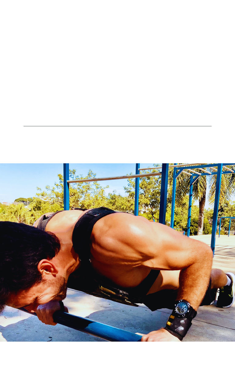 CALISTENIA COMO COMEÇAR NA LÃ DA CALISTENIA COMO MONTAR UMA ROT INA DE TRE INO DICAS E MAIS DE 150 EXERC ÍC IOS Muito prazer, eu sou o Luã, mas pode me chamar de Lã. Pratico calistenia há alguns anos e vou através deste e-book te ajudar a iniciar sua jornada na calistenia. Por muitos anos pratiquei esportes variados acompanhados de musculação em academias convencionais. Sempre tive resultados e um corpo definido e estético. Contudo, nunca me senti muito motivado. A questão de ganho de massa muscular de forma a ter medidas maiores nunca foi algo atrativo para mim. Por isso eu sempre usei a academia como forma de manutenção com várias idas e vindas. Em uma dessas academias um dos instrutores me apresentou a calistenia e após algum tempo comecei a praticar mais constantemente. Acabei deixando a academia convencional e migrando para a calistenia. Após cerca de 3 meses de treino tive uma sensação que não havia tido antes. Uma força corporal diferente. Eu tinha muitas dores musculares e nas costas e simplesmente elas sumiram. Depois disso comecei a focar e aumentar a intensidade dos treinos, iniciar a treinar exercícios mais avançados. Aos poucos fui evoluindo. SOBRE O AUTOR Hoje focado nos treinos de ganho de força para modalidade Strenght, a qual sou o 6º melhor no Brasil atualmente, tenho evoluído muito nos treinamentos e inclusive participando de campeonatos internacionais. Se você quiser ver um pouco mais da minha história e saber melhor quem sou, me procure nas redes sociais como Lã da Calistenia, tanto no Tik Tok quanto no Instagram. O que mais quero é que você tenha a mesma sensação que eu tive e que se sinta tão forte quanto pode ser. Tenho certeza de que a calistenia pode te dar este resultado e sou prova disso. Por isso, escrevi este e-book para te ajudar com a experiência que ganhei ao longo do tempo. Espero que goste e ajude a iniciar sua trilha na calistenia. Um grande abraço. Lã da Calistenia SOBRE O AUTOR Bem-vindo ao mundo da calistenia! Se você está procurando uma maneira emocionante e desafiadora de treinar seu corpo, sem a necessidade de equipamentos caros ou uma academia, a calistenia é uma ótima opção. Este e-book é um guia para iniciantes que desejam aprender os princípios básicos da calistenia e começar a treinar em casa ou em um parque próximo. Ao longo deste e-book, você encontrará informações sobre como iniciar seu treinamento de calistenia, incluindo a importância do aquecimento, os movimentos básicos que são essenciais para construir uma base sólida de força e flexibilidade. Este e-book também inclui dicas e sugestões sobre como criar um plano de treinamento efetivo, que se adapte às suas necessidades e objetivos específicos. Você aprenderá como ajustar o volume e a intensidade do seu treinamento, como incorporar exercícios de mobilidade e como estabelecer metas alcançáveis que o manterão motivado e comprometido com sua rotina de treinamento. INTRODUÇÃO 03 Embora a calistenia possa parecer intimidante no início, este guia cuidadosamente elaborado irá ajudá-lo a superar qualquer desafio e a se tornar mais forte, mais flexível e mais saudável em pouco tempo. Se você está pronto para experimentar um novo estilo de vida e desafiar seu corpo de uma maneira completamente nova, este e- book é o ponto de partida perfeito para sua jornada de calistenia. Então, comece a se preparar para uma jornada emocionante e desafiadora com a calistenia! INTRODUÇÃO 04 O aquecimento é uma parte fundamental do treinamento de calistenia bem como para qualquer outro esporte. É um processo essencial para preparar o corpo para a atividade física intensa que está por vir. Ao aquecer, você pode aumentar a circulação sanguínea e a temperatura corporal, o que ajuda a preparar os músculos, tendões e articulações para o treino. 05 UM AQUECIMENTO DE QUALIDADE EVITA LESÕES E PROPORCIONA UM TREINO MAIS EFICAZ. Aquecer antes do treinamento de calistenia pode ajudar a prevenir lesões, melhorar o desempenho e aumentar a flexibilidade. A falta de aquecimento pode causar tensão nos músculos e tendões, o que pode levar a lesões e desconforto. Além disso, um bom aquecimento pode ajudar a melhorar a mobilidade das articulações e a amplitude dos movimentos, o que pode aumentar a eficácia dos exercícios de calistenia. AQUECIMENTO Uma opção é começar com um aquecimento cardiovascular leve, como uma corrida ou pulos de corda, para aumentar a frequência cardíaca e a circulação sanguínea. Em seguida, pode- se realizar alguns exercícios de mobilidade articular, como alongamentos dinâmicos e rotações de braços e pernas, para melhorar a amplitude dos movimentos e reduzir a rigidez articular. Outra opção é incorporar alguns exercícios específicos de calistenia em progressões mais fáceis no aquecimento, como flexões de braço modificadas, agachamentos e pranchas. Isso ajuda a preparar os músculos para os exercícios de progressões mais difíceis de calistenia que você fará mais tarde no treinamento, ao mesmo tempo em que melhora a mobilidade e a flexibilidade. 06 AQUECIMENTO Montar uma rotina de treino de calistenia pode parecer intimidador para iniciantes, mas é mais fácil do que você pensa. Para começar, é importante definir seus objetivos e nível de condicionamento físico atual. A partir daí, você pode criar uma rotina de treinamento personalizada que atenda às suas necessidades e ajude a alcançar seus objetivos de forma eficaz. COMO MONTAR UMA ROTINA DE TREINO 07 O primeiro passo para montar uma rotina de treino de calistenia é definir seus objetivos. Você quer aumentar sua força, resistência, flexibilidade ou perder peso? Compreender seus objetivos de fitness pode ajudar a criar uma rotina de treino eficaz e personalizada. 08 DEFININDO SEUS OBJETIVOS AVALIANDO SEU NÍVEL DE CONDICIONAMENTO FÍSICO O próximo passo é avaliar seu nível de condicionamento físico atual. Comece