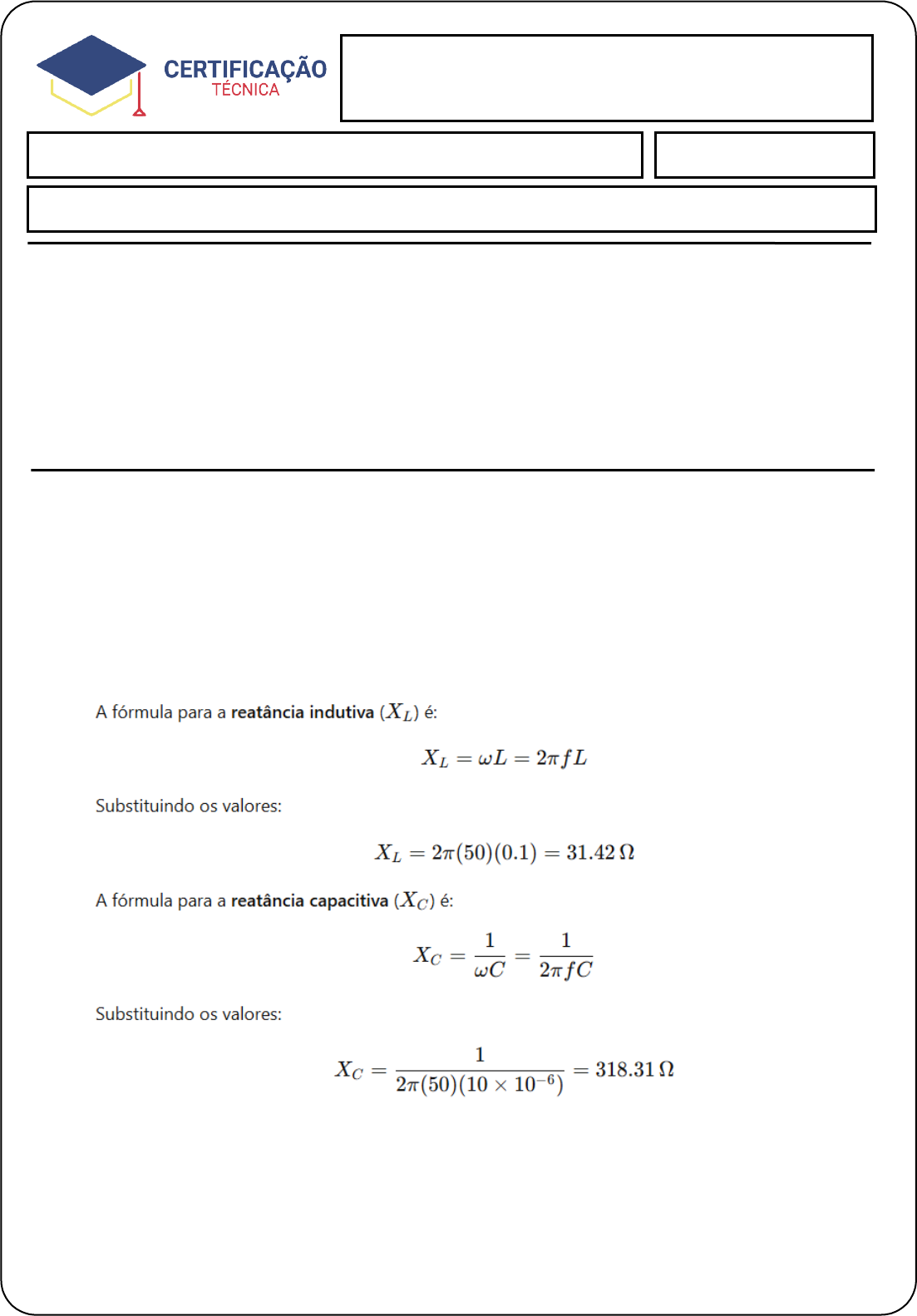 Eletricidade III - SG - AUT Aluno (a): Mellanie Kalianny Paiva Martins Data: 21/ 03 / 2025__. Avaliação Final INSTRUÇÕES: · Esta Avaliação contém questões, totalizando 10 (dez) pontos. · Você deve preencher dos dados no Cabeçalho para sua identificação · Nome / Data de entrega · As respostas devem ser digitadas abaixo de cada pergunta. · Ao terminar, grave o arquivo com o nome Avaliação Pesquisa/Prática. · Envio o arquivo pelo sistema. Considere um circuito RLC em paralelo alimentado por uma fonte de corrente alternada com frequência de 50 Hz e uma tensão de pico de 220 V. Os valores dos componentes são: · Resistor R=100 Ω · Indutor L=100 mH · Capacitor C=10 μF 1. Calcule a reatância indutiva (XL) e a reatância capacitiva (XC) do circuito. 2. Determine a impedância total (Z total) do circuito e a corrente de pico (I pico). 3. Calcule a tensão de pico sobre o resistor (VR, pico), a tensão de pico sobre o indutor (VL, pico), e a tensão de pico sobre o capacitor (VC, pico). 4. Encontre o fator de potência (FP) e o ângulo de fase (ϕ) entre a tensão da fonte e a corrente total no circuito. · Reatância indutiva (XL) = 31.42 Ω · Reatância capacitiva (XC) = 318.31 Ω · Impedância total (Ztotal) = 32.91 Ω · Corrente de pico (Ipico) = 6.68 A · Tensão de pico sobre todos os componentes: 220 V · Ângulo de fase (φ) = 70.78° · Fator de potência (FP) = 0.329 Atividade Prática image4.png image5.png image6.png image7.jpeg image1.png image2.png image3.png
