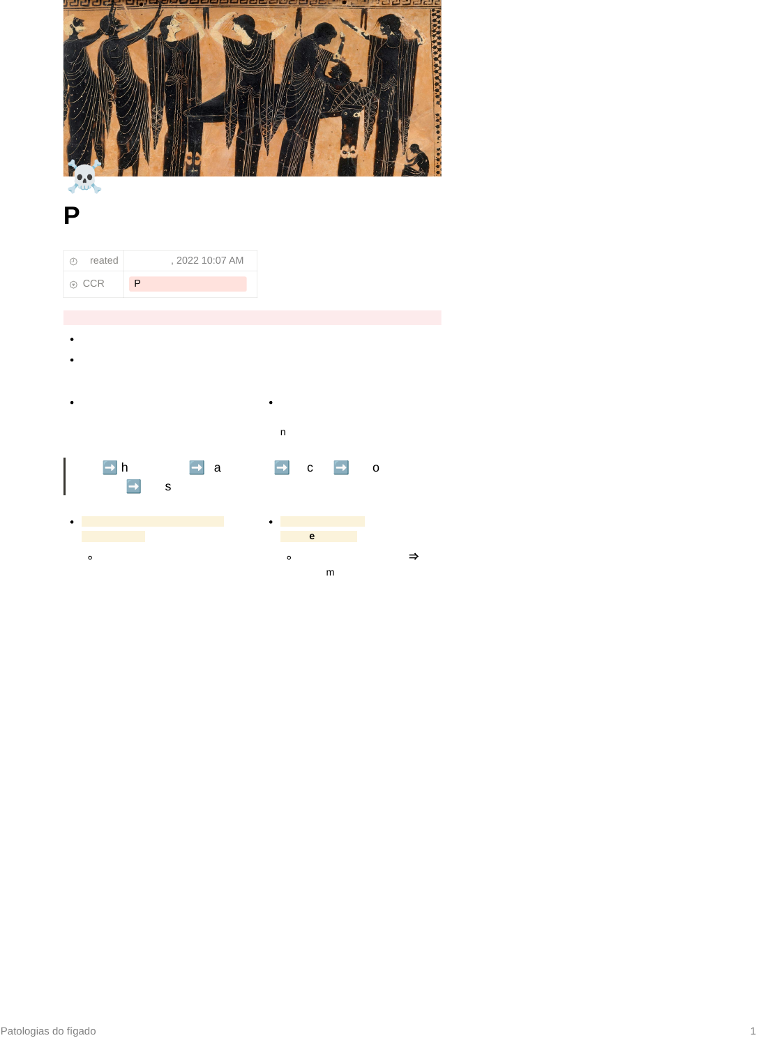 Patologias do fígado 1 ☠ Patologias do fígado Created CCR PATOLOGIA ESPECIAL Estrutura fígado normal Aspectos macro Lóbulo: vênula hepática terminal+ e espaço porta (ductos+linfáticos, ramos da veia porta e artéria hepática) Hepatócitos se arranjam em placas separados pelos sinusoides Hepatócitos da região centro- lobular → recebem menos oxigênio normalmente (fisiologicamente) Bile ➡ hepatócitos ➡ canalículos ➡ ductos ➡ductos intrahep maiores ➡ intestino BILE = possui bilirrubina, sais biliares, água É produzida no hepatócito → na parede faz canalículos → Vesícula biliar ➡ armazenamento Colestase/estase biliar ⇒ problema; pode ter icterícia @July 21, 2022 10:07 AM Patologias do fígado 2 ductos biliares → ductos intrahep. maiores → intestino hepática ou pós-hepática dependende de onde está a obstrução Funções do fígado METABÓLICA Proteínas Síntese de ptn plasmáticas e fatores da coagulação Desaminação de aminoácidos Conversão de amônia em ureia Carboidratos Síntese de glicose Síntese de glicogênio Lipídios Síntese de lipoproteínas Conversão de ácidos graxos em cetonas Biotransformação Hormônios e medicamentos/drogas Hidroxilação, oxido/redução e conjugação (glicuronatos, sulfatos) Excretória Produção e excreção de bile Bilirrubina Colesterol Ácidos biliares Outros Armazenamento Glicogênio Lipídios Patologias do fígado 3 Aminoácidos Vitaminas Ferro e outros minerais Fígado sofre degeneração gordurosa com facilidade → sempre tá chegando lipídios e ácidos graxos Disfunção/insuficiência hepática (IH) Manifestação = 75% lesado Se for crônico (com cicatrização) não tem como reverter Lesão ultrapassa capacidade regeneração Sinais semelhantes independente da causa → difícil definir causa Desenvolvimento lento (demora a mostrar sinais) Quadro agudo: grave, mas pode dar pra curar o animal Cirrose hepática: fígado infiltrado por fibrose → tec. conjuntivo fibroso IH = perda da função normal em consequência de dano agudo ou crônico Fígado possui alta capacidade de regeneração Alterações e consequências da insuficiência hepática (IH) Lesão hepática é diferente de insuficiência; mas se tem insuficência tem lesão ICTERÍCIA ⇒ acúmulo de bilirrubina nos tecidos; quanto + bilirrubina mais amarelado Degradação hemoglobina → bilirrubina → circula ligada à albumina → hepatócitos é conjugada ao ácido glicurônico → ⬆ icterícia pré-hepática = hemólise Produção excessiva Patologias do fígado 4 secretada na bili → TGI → urinobilinogênio → oxidado em estercobilina (cor fezes) → reabsorvido e reexcretado na bile FISIOLÓGICO → acontece o tempo todo; sempre vai ter hemácias velhas Degrada + hemácias = ⬆bilirrubina Redução na tomada, conjugação ou secreção (hepático) Redução escoamento (colestase = parada do fluxo) pode ser: intra-hepática (canalículos, ductos parenquimatosos); extra- hepática/pós-hepática (obstrução do colégano) Direcionamento do exame de acordo com a suspeita GATO COM ICTERÍCIA ⇒ atentar para LIPIDOSE HEPÁTICA CÃO COM ICTERÍCIA ⇒ atentar para LEPTOSPIROSE BOVINOS ⇒ doenças hemolíticas como ANAPLASMOSE, BABESIOSE ENCEFALOPATIA HEPÁTICA = depressão, alterações comportamentais, alterações da consciência, distúrbios motores, ataques convulsivos, e coma AMÔNIA = acumulada na circulação = tóxica p/ vários tecidos como SNC Fígado não está realizando sua função Exarcebação após dieta rica em PTN Amônia vem do metabolismo de PTN Ciclo ureia prejudicado SISTEMA PORTA-HEPÁTICO COMUNICA C/ CIRC. SISTÊMICA Ñ passa ou passa mto pouco pelo fígado Mecanismo = ciclo ureia prejudicado/doenças crônicas (fibrose) AMÔNIA NO S.N = espongiose, vacúolos Distúrbios metabólicos Principalmente quadros agudos → Tendências hemorrágicas Sinusoides ⇒ pequenos vasos no Patologias do fígado 5 hemorragia (diátese hemorrágica) fígado Quadros de hemorragia associados às lesões extensas de necrose Lesão endotelial = cascata de coagulação EQUIMOSE/VÍBICE = esgota fatores de coagulação HIPOALBUMINEMIA Ascite - doença hepática crônica Se o animal morre de aguda não da tempo de ter ascite Aumento pressão portal → + líquido Alterações vasculares e hemodinâmicas Hipertensão portal Desvio portossistêmico Ascite FOTOSSENSIBILIZAÇÃO HEPATÓGENA Lesão de pele resultante da ativação de pigmentos fotodinâmicos pela luz ultravioleta dos raios solares CLOROFILA → RÚMEN → FILOERITRINA → FÍGADO → VESÍCULA BILIAR Problema hepático → não consegue eliminar filoeritrina, molécula fica acumulada nos tecidos Molécula fotodinâmica = se o animal pegar sol vai ter queimaduras tipo de sol → lesões de pele Anomalias do desenvolvimento e achados incidentais Causas: Cistos congênitos ⇒ formação do fígado; estruturas normalmente circulares, revestido por membrana e conteúdo líquido Afeta se 75% do fígado estiver cístico Patologias do fígado 6 Deslocamento hepático (post- mortem causado por timpanismo) Lipidose de tensão (áreas pálidas bem demarcadas do fígado) ➡ bovinos, grande porte Franjas fibrosas (superfície em contato com diafragma) (equino) → não tem explicação; mto frequente Telangiectasia ➡ dilatação dos sinusoides; faltou cordão de hepatócitos na formação do fígado e sinusoide dilatou HISTOLOGICAMENTE ➡ cordão de hepatócitos e sinusoides dilatados cheios de sangue Distúrbios circulatórios e vasculares → relacionados ao fígado Congestão aguda x crônica AGUDA = discreto aumento de vol., sangue flui normalmente ao corte; acentuação padrão lobular mto discreta CRÔNICA = aumento difuso e bordas arredondadas lobos hepáticos; leva à hipóxia persistentes nas áreas centro-lobulares FÍGADO X ANEMIA Anemia aguda grave independemente da causa pode gerar degeneração paracentral ou centrolobular, até mesmo necrose dos