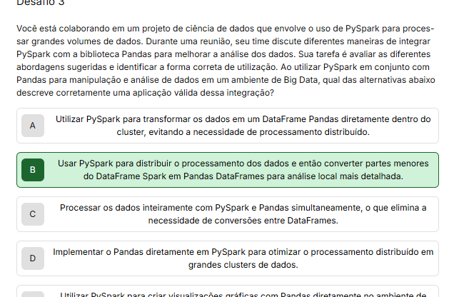 3 Você está colaborando em um projeto de ciência de dados que envolve uso de PySpark para proces- sar grandes volumes de dados. Durante uma reunião, seu time discute diferentes maneiras de integrar PySpark com a biblioteca Pandas para melhorar a análise dos Sua tarefa é avaliar as diferentes abordagens sugeridas e identificar a forma correta de utilização. Ao utilizar PySpark em conjunto com Pandas para manipulação e análise de dados em um ambiente de Big Data, qual das alternativas abaixo descreve corretamente uma aplicação válida dessa integração? Utilizar PySpark para transformar os dados em um DataFrame Pandas diretamente dentro do A cluster, evitando a necessidade de processamento Usar PySpark para distribuir o processamento dos dados e então converter partes menores do DataFrame Spark em Pandas DataFrames para analise local mais detalhada. Processar os dados inteiramente com PySpark e Pandas simultaneamente, que elimina a C necessidade de conversões entre Implementar Pandas diretamente em PySpark para otimizar processamento distribuído em D grandes clusters de dados. de