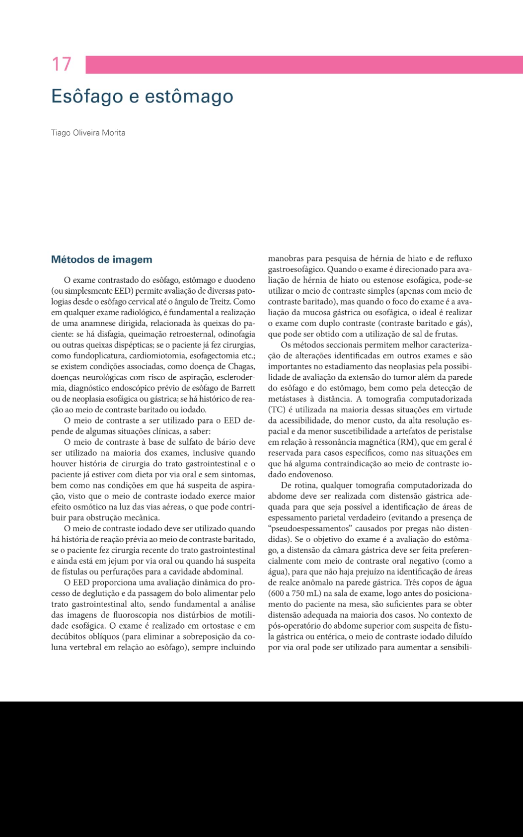 17 Esôfago e estômago Tiago Oliveira Morita Métodos de imagem manobras para pesquisa de hérnia de hiato e de refluxo Quando o exame é direcionado para ava- exame contrastado do esôfago, estômago e duodeno liação de hérnia de hiato ou estenose esofágica, pode-se (ou simplesmente EED) permite avaliação de diversas pato- utilizar o meio de contraste simples (apenas com meio de logias desde o esôfago cervical até o ângulo de Treitz. Como contraste baritado), mas quando o foco do exame é a ava- em qualquer exame radiológico, é fundamental a realização liação da mucosa gástrica ou esofágica, ideal é realizar de uma anamnese dirigida, relacionada às queixas do pa- o exame com duplo contraste (contraste baritado e gás), ciente: se há disfagia, queimação retroesternal, odinofagia que pode ser obtido com a utilização de sal de frutas. ou outras queixas dispépticas; se o paciente já fez cirurgias, Os métodos seccionais permitem melhor caracteriza- como fundoplicatura, cardiomiotomia, esofagectomia etc.; ção de alterações identificadas em outros exames e são se existem condições associadas, como doença de Chagas, importantes no estadiamento das neoplasias pela possibi- doenças neurológicas com risco de aspiração, escleroder- lidade de avaliação da extensão do tumor além da parede mia, diagnóstico endoscópico prévio de esôfago de Barrett do esôfago e do estômago, bem como pela detecção de ou de neoplasia esofágica ou gástrica; se há histórico de rea- metástases à distância. A tomografia computadorizada ção ao meio de contraste baritado ou iodado. (TC) é utilizada na maioria dessas situações em virtude meio de contraste a ser utilizado para EED de- da acessibilidade, do menor custo, da alta resolução es- pende de algumas situações clínicas, a saber: pacial e da menor suscetibilidade a artefatos de peristalse meio de contraste à base de sulfato de bário deve em relação à ressonância magnética (RM), que em geral é ser utilizado na maioria dos exames, inclusive quando reservada para casos específicos, como nas situações em houver história de cirurgia do trato gastrointestinal e o que há alguma contraindicação ao meio de contraste io- paciente já estiver com dieta por via oral e sem sintomas, dado endovenoso. bem como nas condições em que há suspeita de aspira- De rotina, qualquer tomografia computadorizada do ção, visto que meio de contraste iodado exerce maior abdome deve ser realizada com distensão gástrica ade- efeito osmótico na luz das vias aéreas, o que pode contri- quada para que seja possível a identificação de áreas de buir para obstrução mecânica. espessamento parietal verdadeiro (evitando a presença de meio de contraste iodado deve ser utilizado quando "pseudoespessamentos" causados por pregas não disten- há história de reação prévia ao meio de contraste baritado, didas). Se o objetivo do exame é a avaliação do estôma- se o paciente fez cirurgia recente do trato gastrointestinal go, a distensão da câmara gástrica deve ser feita preferen- e ainda está em jejum por via oral ou quando há suspeita cialmente com meio de contraste oral negativo (como a de fístulas ou perfurações para a cavidade abdominal. água), para que não haja prejuízo na identificação de áreas EED proporciona uma avaliação dinâmica do pro- de realce anômalo na parede gástrica. Três copos de água cesso de deglutição e da passagem do bolo alimentar pelo (600 a 750 mL) na sala de exame, logo antes do posiciona- trato gastrointestinal alto, sendo fundamental a análise mento do paciente na mesa, são suficientes para se obter das imagens de fluoroscopia nos distúrbios de motili- distensão adequada na maioria dos casos. No contexto de dade esofágica. o exame é realizado em ortostase e em pós-operatório do abdome superior com suspeita de fístu- decúbitos oblíquos (para eliminar a sobreposição da co- la gástrica ou entérica, o meio de contraste iodado diluído luna vertebral em relação ao esôfago), sempre incluindo por via oral pode ser utilizado para aumentar a sensibili-570 TRATADO DE RADIOLOGIA GASTROINTESTINAL dade do método. contraste iodado endovenoso pode ser administrado a um volume de 1,5 mL/kg com fluxo de 4 mL/s, sendo importante a aquisição de uma fase arterial do abdome superior e uma fase portal do abdome superior e da pelve. Quando for feita aquisição do tórax, esta pode ser feita na mesma fase portal em uma aquisição única. Anatomia do esôfago esôfago tem a função de conduzir o bolo alimentar da faringe até o estômago e constitui uma estrutura tubular que se inicia na região cervical no plano do músculo crico- faríngeo (aproximadamente no nível de C5-C6), apresenta um segmento torácico mais extenso ao longo do mediasti- no posterior, em localização anterolateral direita em rela- ção à aorta descendente, e um curto segmento no abdome superior no plano da transição esofagogástrica. A parede esofágica possui as camadas mucosa, sub- mucosa e muscular própria e, diferentemente das demais porções do tubo digestivo, não há uma camada serosa verdadeira, mas apenas uma fina camada de tecido con- juntivo, o que facilita a disseminação de neoplasias e in- fecções para os tecidos adjacentes. A mucosa é composta por epitélio escamoso estratificado, que apresenta poucas glândulas em comparação com o resto do tubo digestivo. A camada muscular própria possui dois componentes, um mais externo com fibras longitudinais e outro mais interno com fibras circunferenciais, e a musculatura no terço superior (especialmente no esôfago cervical) é constituída de músculo estriado e nos dois terços inferio- res de músculo liso. Impressões extrínsecas normais podem ser obser- vadas no esofagograma no plano do arco aórtico, do Figura 1 Imagem de esofagograma em incidência lateral oblíqua brônquio-fonte esquerdo e do átrio esquerdo. Alguma