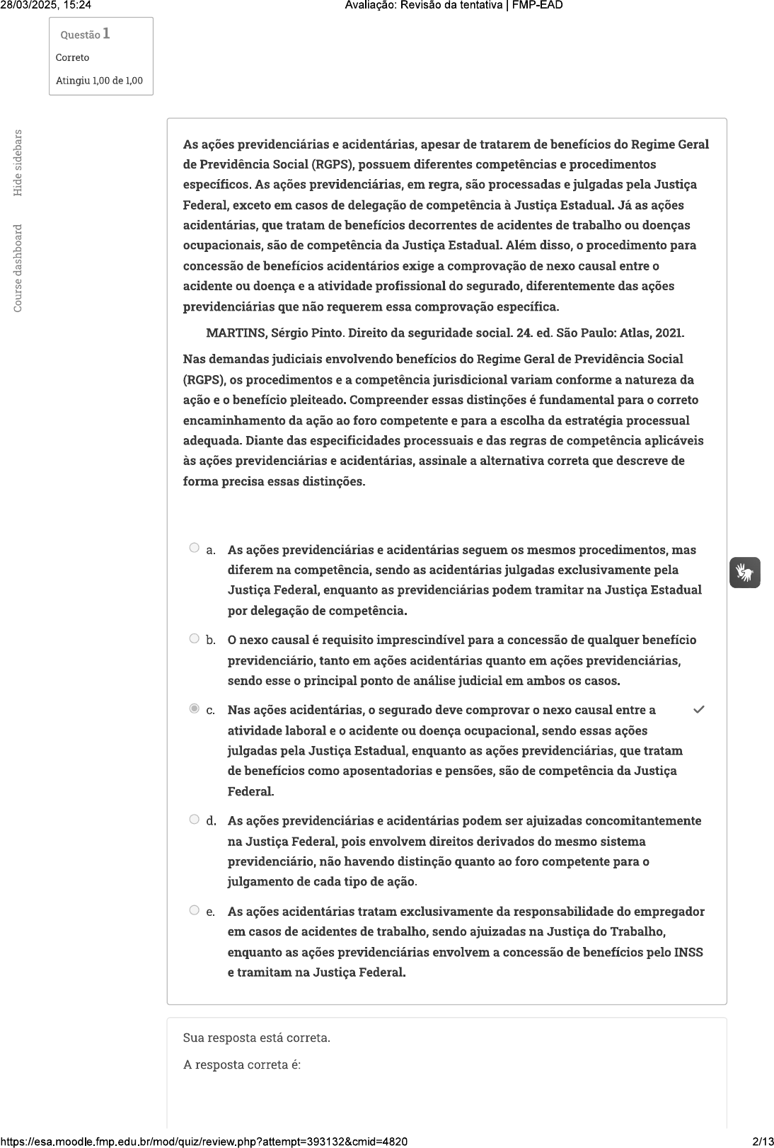 28/03/2025, 15:24 Avaliação: Revisão da tentativa FMP-EAD Questão 1 Correto Atingiu 1,00 de 1,00 As ações previdenciárias e acidentárias, apesar de tratarem de benefícios do Regime Geral de Previdência Social (RGPS), possuem diferentes competências e procedimentos específicos. As ações previdenciárias, em regra, são processadas e julgadas pela Justiça Federal, exceto em casos de delegação de competência à Justiça Estadual. Já as ações acidentárias, que tratam de benefícios decorrentes de acidentes de trabalho ou doenças ocupacionais, são de competência da Justiça Estadual. Além disso, o procedimento para concessão de benefícios acidentários exige a comprovação de nexo causal entre o acidente ou doença e a atividade profissional do segurado, diferentemente das ações previdenciárias que não requerem essa comprovação específica. MARTINS, Sérgio Pinto. Direito da seguridade social. 24. ed. São Paulo: Atlas, 2021. Nas demandas judiciais envolvendo benefícios do Regime Geral de Previdência Social (RGPS), os procedimentos e a competência jurisdicional variam conforme a natureza da ação e o benefício pleiteado. Compreender essas distinções é fundamental para o correto encaminhamento da ação ao foro competente e para a escolha da estratégia processual adequada. Diante das especificidades processuais e das regras de competência aplicáveis às ações previdenciárias e acidentárias, assinale a alternativa correta que descreve de forma precisa essas distinções. a. As ações previdenciárias e acidentárias seguem os mesmos procedimentos, mas diferem na competência, sendo as acidentárias julgadas exclusivamente pela Justiça Federal, enquanto as previdenciárias podem tramitar na Justiça Estadual por delegação de competência. b. o nexo causal é requisito imprescindível para a concessão de qualquer benefício previdenciário, tanto em ações acidentárias quanto em ações previdenciárias, sendo esse o principal ponto de análise judicial em ambos os casos. Nas ações acidentárias, o segurado deve comprovar o nexo causal entre a atividade laboral e o acidente ou doença ocupacional, sendo essas ações julgadas pela Justiça Estadual, enquanto as ações previdenciárias, que tratam de benefícios como aposentadorias e pensões, são de competência da Justiça Federal. d. As ações previdenciárias e acidentárias podem ser ajuizadas concomitantemente na Justiça Federal, pois envolvem direitos derivados do mesmo sistema previdenciário, não havendo distinção quanto ao foro competente para o julgamento de cada tipo de ação. e. As ações acidentárias tratam exclusivamente da responsabilidade do empregador em casos de acidentes de trabalho, sendo ajuizadas na Justiça do Trabalho, enquanto as ações previdenciárias envolvem a concessão de benefícios pelo INSS e tramitam na Justiça Federal. Sua resposta está correta. A resposta correta é: 2/1328/03/2025, 15:24 Avaliação: Revisão da tentativa FMP-EAD Nas ações acidentárias, o segurado deve comprovar o nexo causal entre a atividade laboral e o acidente ou doença ocupacional, sendo essas ações julgadas pela Justiça Estadual, enquanto as ações previdenciárias, que tratam de benefícios como aposentadorias e pensões, são de competência da Justiça Federal. 3/1328/03/2025, 15:24 Avaliação: Revisão da tentativa FMP-EAD Questão 2 Correto Atingiu 1,00 de 1,00 A legislação brasileira prevê que as questões previdenciárias podem ser julgadas tanto pela Justiça Comum Federal quanto pelos Juizados Especiais Federais (JEFs), dependendo de critérios específicos. Enquanto a Justiça Comum Federal lida com matérias mais complexas e valores mais altos, os Juizados Especiais Federais foram criados com o objetivo de garantir celeridade e simplificação em processos de menor valor, respeitando o limite máximo estabelecido para ações de competência dos JEFs. Contudo, além da questão dos valores, há outras distinções quanto aos procedimentos, à admissibilidade de provas, aos recursos e à tramitação dos processos. MARTINS, Sérgio Pinto. Direito da seguridade social. 24. ed. São Paulo: Atlas, 2021. No âmbito do Direito Previdenciário, os processos podem tramitar tanto na Justiça Comum Federal quanto nos Juizados Especiais Federais (JEFs), de acordo com certas condições e regras procedimentais. Essas instâncias judiciais apresentam diferenças significativas no que diz respeito à tramitação dos processos, à complexidade das matérias, ao valor da causa e às possibilidades de recurso. Considerando essas diferenças entre a Justiça Comum Federal e os Juizados Especiais Federais em matéria previdenciária, assinale a alternativa que descreve corretamente essas distinções. a. A Justiça Comum Federal e os Juizados Especiais Federais compartilham a mesma competência sobre causas previdenciárias, sendo a escolha da via processual feita livremente pelo segurado, independentemente do valor da causa ou da complexidade do tema. b. Os Juizados Especiais Federais têm competência exclusiva para julgar causas previdenciárias de qualquer valor, desde que o segurado opte por uma tramitação mais célere e com menos formalidades, incluindo a dispensa da produção de provas periciais. C. A Justiça Comum Federal é competente para causas previdenciárias que envolvem valores superiores ao teto estabelecido para os Juizados Especiais Federais, bem como para ações mais complexas que demandem maior instrução probatória, como a realização de perícias. d. As decisões proferidas nos Juizados Especiais Federais não admitem qualquer tipo de recurso ao Tribunal Regional Federal, sendo a única instância possível de recurso a Turma Recursal dos próprios Juizados Especiais. e. A competência dos Juizados Especiais Federais em matéria previdenciária é limitada apenas aos casos em que não há controvérsia jurídica, sendo vedada a tra