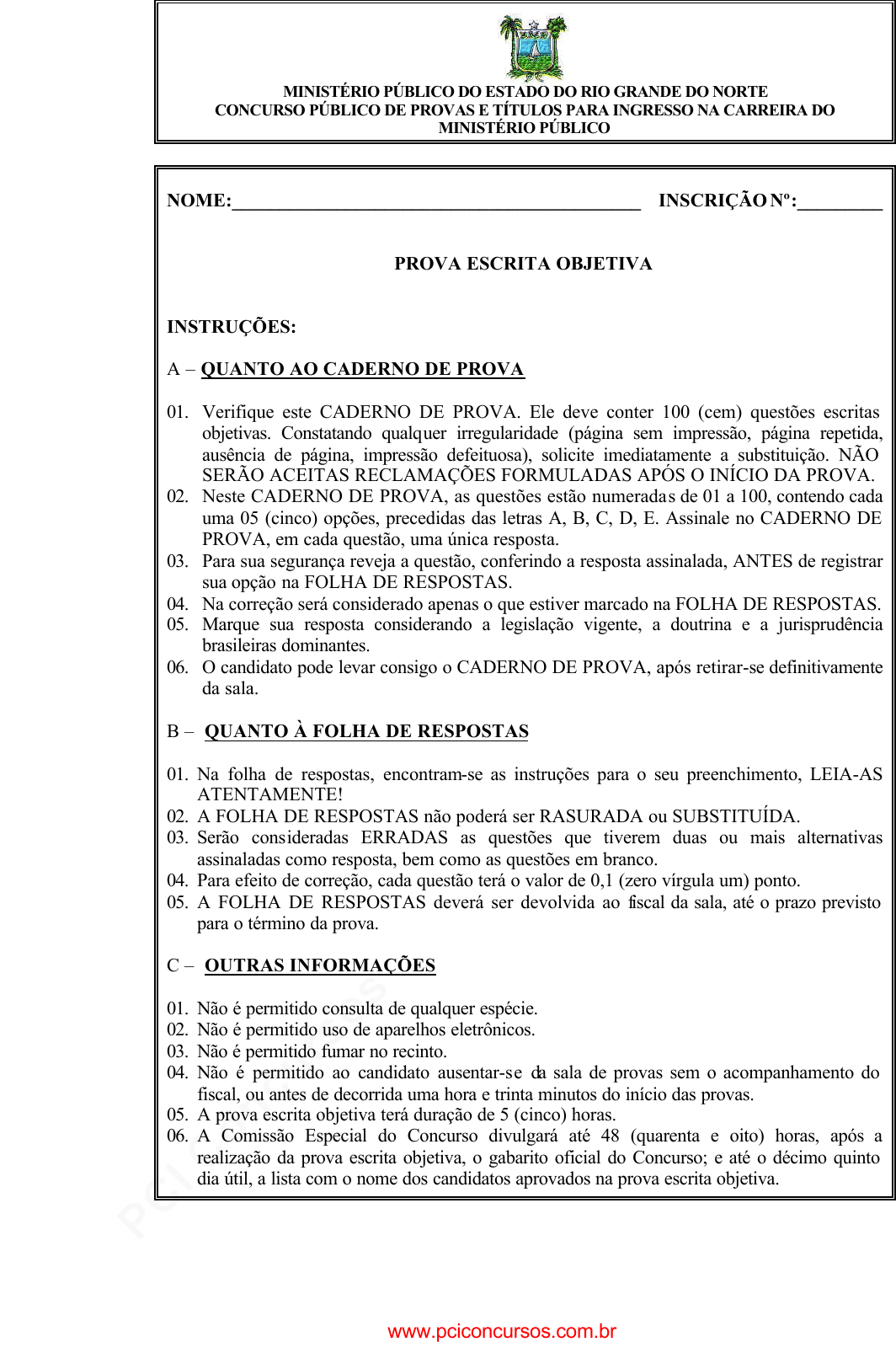 pcimarkpci MjgwNDowMjE0Ojg4ZTE6NjdkZTphNGFkOmVmZmY6ZmU1YjozNDQ3:VGh1LCAyNyBNYXIgMjAyNSAwMDoyODowMSAtMDMwMA== www.pciconcursos.com.br MINISTÉRIO PÚBLICO DO ESTADO DO RIO GRANDE DO NORTE CONCURSO PÚBLICO DE PROVAS E TÍTULOS PARA INGRESSO NA CARREIRA DO MINISTÉRIO PÚBLICO NOME:___________________________________________ INSCRIÇÃO Nº:_________ PROVA ESCRITA OBJETIVA INSTRUÇÕES: A – QUANTO AO CADERNO DE PROVA 01. Verifique este CADERNO DE PROVA. Ele deve conter 100 (cem) questões escritas objetivas. Constatando qualquer irregularidade (página sem impressão, página repetida, ausência de página, impressão defeituosa), solicite imediatamente a substituição. NÃO SERÃO ACEITAS RECLAMAÇÕES FORMULADAS APÓS O INÍCIO DA PROVA. 02. Neste CADERNO DE PROVA, as questões estão numeradas de 01 a 100, contendo cada uma 05 (cinco) opções, precedidas das letras A, B, C, D, E. Assinale no CADERNO DE PROVA, em cada questão, uma única resposta. 03. Para sua segurança reveja a questão, conferindo a resposta assinalada, ANTES de registrar sua opção na FOLHA DE RESPOSTAS. 04. Na correção será considerado apenas o que estiver marcado na FOLHA DE RESPOSTAS. 05. Marque sua resposta considerando a legislação vigente, a doutrina e a jurisprudência brasileiras dominantes. 06. O candidato pode levar consigo o CADERNO DE PROVA, após retirar-se definitivamente da sala. B – QUANTO À FOLHA DE RESPOSTAS 01. Na folha de respostas, encontram-se as instruções para o seu preenchimento, LEIA-AS ATENTAMENTE! 02. A FOLHA DE RESPOSTAS não poderá ser RASURADA ou SUBSTITUÍDA. 03. Serão consideradas ERRADAS as questões que tiverem duas ou mais alternativas assinaladas como resposta, bem como as questões em branco. 04. Para efeito de correção, cada questão terá o valor de 0,1 (zero vírgula um) ponto. 05. A FOLHA DE RESPOSTAS deverá ser devolvida ao fiscal da sala, até o prazo previsto para o término da prova. C – OUTRAS INFORMAÇÕES 01. Não é permitido consulta de qualquer espécie. 02. Não é permitido uso de aparelhos eletrônicos. 03. Não é permitido fumar no recinto. 04. Não é permitido ao candidato ausentar-se da sala de provas sem o acompanhamento do fiscal, ou antes de decorrida uma hora e trinta minutos do início das provas. 05. A prova escrita objetiva terá duração de 5 (cinco) horas. 06. A Comissão Especial do Concurso divulgará até 48 (quarenta e oito) horas, após a realização da prova escrita objetiva, o gabarito oficial do Concurso; e até o décimo quinto dia útil, a lista com o nome dos candidatos aprovados na prova escrita objetiva. www.pciconcursos.com.br pcimarkpci MjgwNDowMjE0Ojg4ZTE6NjdkZTphNGFkOmVmZmY6ZmU1YjozNDQ3:VGh1LCAyNyBNYXIgMjAyNSAwMDoyODowMSAtMDMwMA== www.pciconcursos.com.br 1 DIREITO PENAL 01. Com relação à reincidência, pode-se afirmar: I - revoga o sursis, obrigatoriamente em caso de condenação irrecorrível por crime doloso e facultativamente na hipótese de crime culposo ou contravenção; II - em qualquer caso impede que se inicie o cumprimento da pena em regime semi-aberto ou aberto; III - revoga o livramento condicional obrigatoriamente em caso de condenação irrecorrível a pena privativa de liberdade e facultativamente na hipótese de crime ou contravenção quando aplicada pena que não seja privativa de liberdade; IV - aumenta o prazo de prescrição da pretensão executória, porém não interrompe seu curso; V - revoga a reabilitação quando o reabilitado for definitivamente condenado, como reincidente, a pena que não seja a de multa. A) I, II e V estão corretas B) I, III e IV estão corretas C) I, III e V estão corretas D) II, IV e V estão corretas E) II, III e IV estão corretas 02. Julgue as afirmações seguintes atribuindo-lhes V (verdadeiro) ou F (falso), assinalando a alternativa que contenha a seqüência correta: I - haverá aumento de pena no delito de modificar ou alterar o funcionário público sistema de informações ou programa de informática sem autorização ou solicitação de autoridade competente, quando a conduta delituosa resultar dano para a Administração Pública ou para o administrado; II – uma servidora municipal ao subtrair, em proveito próprio, um computador da secretaria da escola da qual era merendeira comete peculato impróprio; III – ao mesmo tempo e em face do mesmo fato, são incompossíveis a existência do crime de concussão e o de corrupção ativa; IV - no peculato culposo, a reparação voluntária e integral do dano ao erário público, antes do recebimento da denúncia, é causa de diminuição de pena, em razão do arrependimento posterior; V – o funcionário público pratica o delito de exercício funcional ilegalmente antecipado ou prolongado quando, após ciência da publicação do ato de sua aposentadoria, continua a exercer suas funções sem autorização. A) V V V V F B) V F V V V C) V F V F F D) F V F V V E) V V V F F 03. Com relação à medida de segurança, pode-se afirmar: I - terá tempo de duração indeterminado, perdurando enquanto persistir a periculosidade do agente; II - o tempo da prisão provisória e o de internação em hospital de custódia e tratamento psiquiátrico não serão computados na contagem do prazo mínimo para a realização de perícia médica; III - o prazo mínimo para a realização da perícia médica deverá ser de 1 (um) a 3 (três) anos; www.pciconcursos.com.br pcimarkpci MjgwNDowMjE0Ojg4ZTE6NjdkZTphNGFkOmVmZmY6ZmU1YjozNDQ3:VGh1LCAyNyBNYXIgMjAyNSAwMDoyODowMSAtMDMwMA== www.pciconcursos.com.br 2 IV - terá prazo de duração determinado pelo juiz na sentença, devendo ser considerado o prazo da pena mínima cominada ao crime; V – o sistema vicariante, adotado pela reforma penal de 1984, impede a aplicação da medida de segurança para os imputáveis considerados real ou presumidamente perigosos. A) I, II e V estão corretas B) I, III e V estão corretas C) II, III e IV estão corretas D) I, II e IV estão