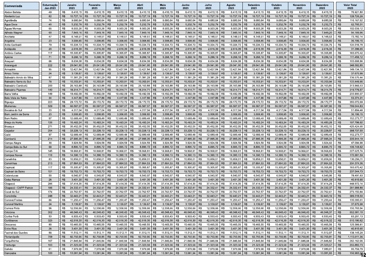 Conveniada Enturmação Janeiro Fevereiro Março Abril Maio Junho Julho Agosto Setembro Outubro Novembro Dezembro Valor Total Jan-2023 2023 2023 2023 2023 2023 2023 2023 2023 2023 2023 2023 2023 2023 Abdon Batista 49 R$ 6.410,15 R$ 6.410,15 R$ 6.410,15 R$ 6.410,15 R$ 6.410,15 R$ 6.410,15 R$ 6.410,15 R$ 6.410,15 R$ 6.410,15 R$ 6.410,15 R$ 6.410,15 R$ 6.410,15 R$ 76.921,80 Abelardo Luz 82 R$ 10.727,19 R$ 10.727,19 R$ 10.727,19 R$ 10.727,19 R$ 10.727,19 R$ 10.727,19 R$ 10.727,19 R$ 10.727,19 R$ 10.727,19 R$ 10.727,19 R$ 10.727,19 R$ 10.727,19 R$ 128.726,28 Agrolândia 74 R$ 9.680,64 R$ 9.680,64 R$ 9.680,64 R$ 9.680,64 R$ 9.680,64 R$ 9.680,64 R$ 9.680,64 R$ 9.680,64 R$ 9.680,64 R$ 9.680,64 R$ 9.680,64 R$ 9.680,58 116.167,62 Água Doce 40 R$ 5.232,78 R$ 5.232,78 R$ 5.232,78 R$ 5.232,78 R$ 5.232,78 R$ 5.232,78 R$ 5.232,78 R$ 5.232,78 R$ 5.232,78 R$ 5.232,78 R$ 5.232,78 R$ 5.232,73 R$ 62.793,31 Águas Mornas 65 R$ 8.503,26 R$ 8.503,26 R$ 8.503,26 R$ 8.503,26 R$ 8.503,26 R$ 8.503,26 R$ 8.503,26 R$ 8.503,26 R$ 8.503,26 R$ 8.503,26 R$ 8.503,26 R$ 8.503,26 R$ 102.039,12 Alfredo Wagner 60 R$ 7.849,16 R$ 7.849,16 R$ 7.849,16 R$ 7.849,16 R$ 7.849,16 R$ 7.849,16 R$ 7.849,16 R$ 7.849,16 R$ 7.849,16 R$ 7.849,16 R$ 7.849,16 R$ 7.849,20 R$ 94.189,96 Anchieta 47 R$ 6.148,51 R$ 6.148,51 R$ 6.148,51 R$ 6.148,51 R$ 6.148,51 R$ 6.148,51 R$ 6.148,51 R$ 6.148,51 R$ 6.148,51 R$ 6.148,51 R$ 6.148,51 R$ 6.148,53 R$ 73.782,14 Angelina 23 R$ 3.008,85 R$ 3.008,85 R$ 3.008,85 R$ 3.008,85 R$ 3.008,85 R$ 3.008,85 R$ 3.008,85 R$ 3.008,85 R$ 3.008,85 R$ 3.008,85 R$ 3.008,85 R$ 3.008,80 R$ 36.106,15 Anita Garibaldi 79 R$ 10.334,73 R$ 10.334,73 R$ 10.334,73 R$ 10.334,73 R$ 10.334,73 R$ 10.334,73 R$ 10.334,73 R$ 10.334,73 R$ 10.334,73 R$ 10.334,73 R$ 10.334,73 R$ 10.334,75 R$ 124.016,78 Anitápolis 20 R$ 2.616,39 R$ 2.616,39 R$ 2.616,39 R$ 2.616,39 R$ 2.616,39 R$ 2.616,39 R$ 2.616,39 R$ 2.616,39 R$ 2.616,39 R$ 2.616,39 R$ 2.616,39 R$ 2.616,36 R$ 31.396,65 Antônio Carlos 117 R$ 15.305,87 R$ 15.305,87 R$ 15.305,87 R$ 15.305,87 R$ 15.305,87 R$ 15.305,87 R$ 15.305,87 R$ 15.305,87 R$ 15.305,87 R$ 15.305,87 R$ 15.305,87 R$ 15.305,85 R$ 183.670,42 Apiúna 71 R$ 9.288,18 R$ 9.288,18 R$ 9.288,18 R$ 9.288,18 R$ 9.288,18 R$ 9.288,18 R$ 9.288,18 R$ 9.288,18 R$ 9.288,18 R$ 9.288,18 R$ 9.288,18 R$ 9.288,14 R$ 111.458,12 Araquari 66 R$ 8.634,08 R$ 8.634,08 R$ 8.634,08 R$ 8.634,08 R$ 8.634,08 R$ 8.634,08 R$ 8.634,08 R$ 8.634,08 R$ 8.634,08 R$ 8.634,08 R$ 8.634,08 R$ 8.634,08 R$ 103.608,96 Ararangua 222 R$ 29.041,90 R$ 29.041,90 R$ 29.041,90 R$ 29.041,90 R$ 29.041,90 R$ 29.041,90 R$ 29.041,90 R$ 29.041,90 R$ 29.041,90 R$ 29.041,90 R$ 29.041,90 R$ 29.041,95 R$ 348.502,85 Armazém 95 R$ 12.427,84 R$ 12.427,84 R$ 12.427,84 R$ 12.427,84 R$ 12.427,84 R$ 12.427,84 R$ 12.427,84 R$ 12.427,84 R$ 12.427,84 R$ 12.427,84 R$ 12.427,84 R$ 12.427,86 R$ 149.134,10 Arroio Trinta 24 R$ 3.139,67 R$ 3.139,67 R$ 3.139,67 R$ 3.139,67 R$ 3.139,67 R$ 3.139,67 R$ 3.139,67 R$ 3.139,67 R$ 3.139,67 R$ 3.139,67 R$ 3.139,67 R$ 3.139,61 R$ 37.675,98 Balneário Arroio do Silva 87 R$ 11.381,29 R$ 11.381,29 R$ 11.381,29 R$ 11.381,29 R$ 11.381,29 R$ 11.381,29 R$ 11.381,29 R$ 11.381,29 R$ 11.381,29 R$ 11.381,29 R$ 11.381,29 R$ 11.381,25 R$ 136.575,44 Balneário Barra do Sul 78 R$ 10.203,91 R$ 10.203,91 R$ 10.203,91 R$ 10.203,91 R$ 10.203,91 R$ 10.203,91 R$ 10.203,91 R$ 10.203,91 R$ 10.203,91 R$ 10.203,91 R$ 10.203,91 R$ 10.203,94 R$ 122.446,95 Balneário 200 R$ 26.163,88 R$ 26.163,88 R$ 26.163,88 R$ 26.163,88 R$ 26.163,88 R$ 26.163,88 R$ 26.163,88 R$ 26.163,88 R$ 26.163,88 R$ 26.163,88 R$ 26.163,88 R$ 26.163,85 R$ 313.966,53 Balneário 140 R$ 18.314,71 R$ 18.314,71 R$ R$ 18.314,71 R$ 18.314,71 R$ 18.314,71 R$ 18.314,71 R$ 18.314,71 R$ 18.314,71 R$ 18.314,71 R$ 18.314,71 R$ 18.314,76 R$ 219.776,57 Barra Velha 149 R$ 19.492,09 R$ 19.492,09 R$ 19.492,09 R$ 19.492,09 R$ 19.492,09 R$ 19.492,09 R$ 19.492,09 R$ 19.492,09 R$ 19.492,09 R$ 19.492,09 R$ 19.492,09 R$ 19.492,08 R$ 233.905,07 Bela Vista do Toldo 34 R$ 4.447,86 R$ 4.447,86 R$ 4.447,86 R$ 4.447,86 R$ 4.447,86 R$ 4.447,86 R$ 4.447,86 R$ 4.447,86 R$ 4.447,86 R$ 4.447,86 R$ 4.447,86 R$ 4.447,85 R$ 53.374,31 Biguaçu 223 R$ 29.172,72 R$ 29.172,72 R$ 29.172,72 R$ 29.172,72 R$ 29.172,72 R$ 29.172,72 R$ 29.172,72 R$ 29.172,72 R$ 29.172,72 R$ 29.172,72 R$ 29.172,72 R$ 29.172,77 R$ 350.072,69 Blumenau 509 R$ 66.587,07 R$ 66.587,07 R$ 66.587,07 R$ 66.587,07 R$ 66.587,07 R$ 66.587,07 R$ 66.587,07 R$ 66.587,07 R$ 66.587,07 R$ 66.587,07 R$ 66.587,07 R$ 66.587,06 R$ 799.044,83 Bocaina do Sul 33 R$ 4.317,04 R$ 4.317,04 R$ 4.317,04 R$ 4.317,04 R$ 4.317,04 R$ 4.317,04 R$ 4.317,04 R$ 4.317,04 R$ 4.317,04 R$ 4.317,04 R$ 4.317,04 R$ 4.317,04 R$ 51.804,48 Bom Jardim da Serra 23 R$ 3.008,85 R$ 3.008,85 R$ 3.008,85 R$ 3.008,85 R$ 3.008,85 R$ 3.008,85 R$ 3.008,85 R$ 3.008,85 R$ 3.008,85 R$ 3.008,85 R$ 3.008,85 R$ 3.008,80 R$ 36.106,15 Bom Retiro 97 R$ 12.689,48 R$ 12.689,48 R$ 12.689,48 R$ 12.689,48 R$ 12.689,48 R$ 12.689,48 R$ 12.689,48 R$ 12.689,48 R$ 12.689,48 R$ 12.689,48 R$ 12.689,48 R$ 12.689,49 R$ 152.273,77 Braço do Norte 126 R$ 16.483,24 R$ 16.483,24 R$ 16.483,24 R$ 16.483,24 R$ 16.483,24 R$ 16.483,24 R$ 16.483,24 R$ 16.483,24 R$ 16.483,24 R$ 16.483,24 R$ 16.483,24 R$ 16.483,28 R$ 197.798,92 Brusque 271 R$ 35.452,05 R$ 35.452,05 R$ 35.452,05 R$ 35.452,05 R$ 35.452,05 R$ 35.452,05 R$ 35.452,05 R$ 35.452,05 R$ 35.452,05 R$ 35.452,05 R$ 35.452,05 R$ 35.452,10 R$ 425.424,65 Caçador 254 R$ 33.228,13 R$ 33.228,13 R$ 33.228,13 R$ 33.228,13 R$ 33.228,13 R$ 33.228,13 R$ 33.228,13 R$ 33.228,13 R$ 33.228,13 R$ 33.228,13 R$ 33.228,13 R$ 33.228,07 R$ 398.737,50 Caibi 97 R$ 12.689,48 R$ 12.689,48 R$ 12.689,48 R$ 12.689,48 R$ 12.689,48 R$ 12.689,48 R$ 12.689,48 R$ 12.689,48 R$ 12.689,48 R$ 12.689,48 R$ 12.689,48 R$ 12.689,49 R$ 152.273,77 Camboriú 214 R$ 27.995,35 R$ 27.995,35 R$ 27.995,35 R$ 27.995,35 R$ 27.995,35 R$ 27.995,35 R$ 27.995,35 R$ 27.995,35 R$ 27.995,35 R$ 27.995,35 R$ 27.995,35 R$ 27.995,34 R$ 335.944,19 Campo Alegre 30 R$ 3.924,58 R$ 3.92