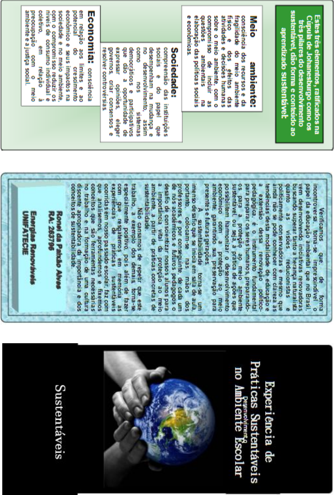 Estes três elementos, ratificados na Verificamos de forma toma-se impre o Cúpula de Johanesburgo como os papel da educação ambiental que no Brasil, três pilares do desenvolvimento vem desenvolvendo iniciativas renovadoras sustentável, dão forma e conteúdo ao buscando superar tanto a herança naturalista aprendizado quanto as visões reducionistas e politicamente conservadoras e mesmo que ainda não se pode conhecer com clareza as tendências desta modalidade de educação e Experiência de a extensão dessa renovação Meio ambiente: é instrumento fundamental Práticas Sustentáveis consciência dos recursos e da para preparar os seres humanos, preparando- fragilidade do meio ambiente os para a proteção ao meio ambiente no Ambiente Escolar ou seja, à de ações que físico e dos efeitos das atividades e decisões humanas possibilitem harmonizar o desenvolvimento econômico com a proteção ao meio sobre o meio ambiente, com o ambiente, garantindo sua preservação para compromisso de incluir as presentes e futuras questões ambientais na A sustentabilidade torna-se um elaboração das políticas sociais imenso de safio que se inicia em sala de aula, e portanto, colocam-se nas mãos dos professores, e por de cada um Sociedade: de nos acadêmicos e futuros pedagogos o compreensão das instituições desafio de conscientizar nossos alunos para sociais e do papel que a importância vital da proteção ao meio desempenham na mudança e ambiente, a partir de práticas concretas de no desenvolvimento, assim como nos sistemas Não cansamos de repetir que este democráticos e participativos a exemplo dos demais torna-se que dão a oportunidade de especialmente positivo, pois além de fazer expressar opiniões, eleger com que resgatemos em memória as governos, criar consensos e de práticas sustentáveis resolver ocorridas em nosso passado faz com que analisemos, aprofundemos e fixemos Economia: consciência conceitos que são ferramentas necessárias no trabalho e na formação de uma cultura em relação aos limites e ao discente apropriadora da importância e dos potencial do crescimento conceitos de econômico e seus impactos na sociedade e no meio ambiente, Ronel da Alves Sustentáveis com o compromi sso reduzir os níveis de consumo individual e RA: 263796 coletivo, em relação à preocupação com o meio Energias ambiente e a justiça social. UNIFATECIEDESENVOLVIMENTO INTRODUZINDO o "PENSAR Benefícios da Horta Escolar SUSTENTAVEL NO AMBIENTE Propor uso de garrafas pet para cercar a hortz e explicar os Aliar exemplos práticos conceitos benefícios da reutilização de ensinados em sala de aula uma maneira de materiais para preservação do meio facilitar 0 aprendizado e aumentar 0 interesse dos dos diferentes formatos de social Para aproximar nossas crianças deste canteiros, pode-se falar sobre as formas tão rico e que tanto tem a nos ensinar e cujo conhecimento não consta nos livros escolares, o nome da planta pode ganhar desenvolvimento traçar um planejamento que também a versão em inglês e, assim, sustentável propicie a sensação de estarem da aumentar o vocabulário dos alunos natureza Elas poderão aprender de nesse econômico ambiental brincadeiras e atividades A horta pode ser um bom tema para ser proposto na hora da Os alunos vão perceber importância da água para o desenvolvimento e sobrevivência das plantas e entenderão melhor a necessidade da preservação dos recursos naturais;