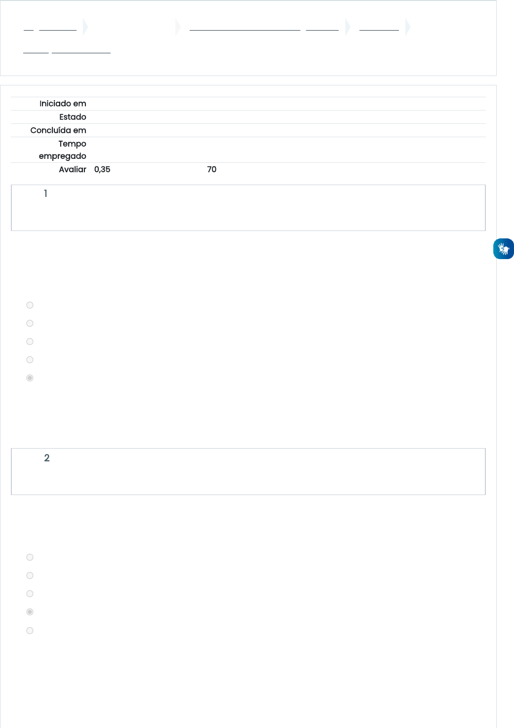 21/04/2023, 14:37 Avaliação - Unidade II: Revisão da tentativa https://ambienteonline.uninga.br/mod/quiz/review.php?attempt=2089785&cmid=532720 1/5 Página inicial Minhas disciplinas 2023/2 - Fundamentos da Agricultura UNIDADE II Avaliação - Unidade II Iniciado em sexta, 21 abr 2023, 14:05 Estado Finalizada Concluída em sexta, 21 abr 2023, 14:33 Tempo empregado 28 minutos 45 segundos Avaliar 0,35 de um máximo de 0,50(70%) Questão 1 Completo Atingiu 0,05 de 0,05 Questão 2 Completo Atingiu 0,05 de 0,05 A inovação nas técnicas produtivas, a mecanização e a utilização de insumos para melhorar a produtividade e diminuir as perdas por causas naturais provocaram significativos impactos no meio ambiente. São impactos ambientais decorrentes da produção agrícola, exceto: a. desmatamento b. contaminação do solo c. poluição da água d. assoreamento e. reutilização da água A resposta correta é: reutilização da água As máquinas agrícolas são projetadas para realizar integralmente ou coadjuvar a execução da operação agrícola. As máquinas agrícolas são divididas em grupos, sendo que pertencem ao Grupo 01 as máquinas para: a. transporte, elevação e manuseio. b. semeadura, plantio ou transplante. c. aplicação de defensivos. d. Preparo do solo. e. colheita. A resposta correta é: Preparo do solo. https://ambienteonline.uninga.br/ https://ambienteonline.uninga.br/course/view.php?id=19810 https://ambienteonline.uninga.br/course/view.php?id=19810§ion=3 https://ambienteonline.uninga.br/mod/quiz/view.php?id=532720 21/04/2023, 14:37 Avaliação - Unidade II: Revisão da tentativa https://ambienteonline.uninga.br/mod/quiz/review.php?attempt=2089785&cmid=532720 2/5 Questão 3 Completo Atingiu 0,05 de 0,05 Questão 4 Completo Atingiu 0,00 de 0,05 Assinale a alternativa correta com relação aos conceitos e às práticas de controle à erosão dos solos agrícolas: a. A erosão acentuada aumenta a capacidade produtiva das terras, normalmente levando a ganhos na produção agrícola. b. Para se reduzirem os efeitos erosivos, o agricultor deve manter e recompuser as matas nas margens de rios e riachos e ao redor de nascentes, e promover rotação de culturas no solo. c. A declividade do terreno e a composição química do solo não interferem na velocidade e potencial do processo erosivo. d. A erosão do solo na natureza normalmente não se relaciona à ação de ventos e, principalmente, da água da chuva. e. A ação antrópica, tal como o desmatamento desordenado, o monocultivo de culturas e o uso abusivo de pastoreio não possuem a capacidade de acelerar a erosão. A resposta correta é: Para se reduzirem os efeitos erosivos, o agricultor deve manter e recompuser as matas nas margens de rios e riachos e ao redor de nascentes, e promover rotação de culturas no solo. Com relação à formação dos solos, assinale a alternativa correta: a. O solo é formado a partir do intemperismo, ou seja, da decomposição ou destruição das rochas. Esse processo ocorreu no decorrer de milhões de anos pela ação do clima, da água, dos ventos e dos seres vivos a partir do acúmulo de sedimentos que caíram no planeta Terra com meteoros. b. O solo é formado a partir de processos internos do planeta Terra, como o movimento das placas tectônicas. c. O solo é exclusivamente uma consequência da ação humana sobre o espaço. d. O solo se forma a partir do processo de decomposição da rocha de origem. e. O solo se forma com mais facilidade em áreas com pouco vento, chuva, variação climática e seres vivos. A resposta correta é: O solo se forma a partir do processo de decomposição da rocha de origem. 21/04/2023, 14:37 Avaliação - Unidade II: Revisão da tentativa https://ambienteonline.uninga.br/mod/quiz/review.php?attempt=2089785&cmid=532720 3/5 Questão 5 Completo Atingiu 0,05 de 0,05 Questão 6 Completo Atingiu 0,05 de 0,05 Questão 7 Completo Atingiu 0,00 de 0,05 Formação da camada ferruginosa que se forma com o aumento de óxidos e hidróxidos de ferro e alumínio no solo. Esta camada prejudica a fertilidade do solo e as práticas agrícolas. O exposto acima refere-se a: a. compactação do solo b. laterização do solo c. lixiviação do solo d. erosão do solo e. intemperismo A resposta correta é: laterização do solo Lixiviação do solo significa: I. A lavagem do solo pelas águas das chuvas e atua mais intensamente nas regiões tropicais de clima úmido; II. A formação de uma placa metálica na superfície terrestre; III. Que é um agricultável de alto nível de produtividade. Quais estão corretas? a. Apenas II. b. Apenas II e III. c. Apenas III. d. I, II e III. e. Apenas I. A resposta correta é: Apenas I. O mais eficiente equipamento agrícola para romper camadas profundas de compactação do solo é: a. grade rotativa. b. arado de aiveca. c. subsolador. d. plaina. e. grade aradora. A resposta correta é: subsolador. 21/04/2023, 14:37 Avaliação - Unidade II: Revisão da tentativa https://ambienteonline.uninga.br/mod/quiz/review.php?attempt=2089785&cmid=532720 4/5 Questão 8 Completo Atingiu 0,05 de 0,05 Questão 9 Completo Atingiu 0,05 de 0,05 O uso de máquinas e implementos agrícolas tem como principais objetivos o aumento na eficiência e o aumento na qualidade das operações agrícolas. A padronização dessas atividades busca proporcionar, como consequência, o aumento da produtividade. Nesse contexto, assinale a afirmativa correta. a. No Brasil, não aumentar a fronteira agrícola resulta, necessariamente, em perda de produção, uma vez que a tecnologia disponível não projeta perspectivas de ampliação dos níveis de produtividade atual, para as principais atividades agropecuárias. b. Antes da existência de tratores, a tração animal era a principal força motriz na atividade agrícola, sendo utilizada para todas as atividades de preparo do solo. Além da baixa eficiência em relação ao uso de tratores, não existe nenhuma justifica