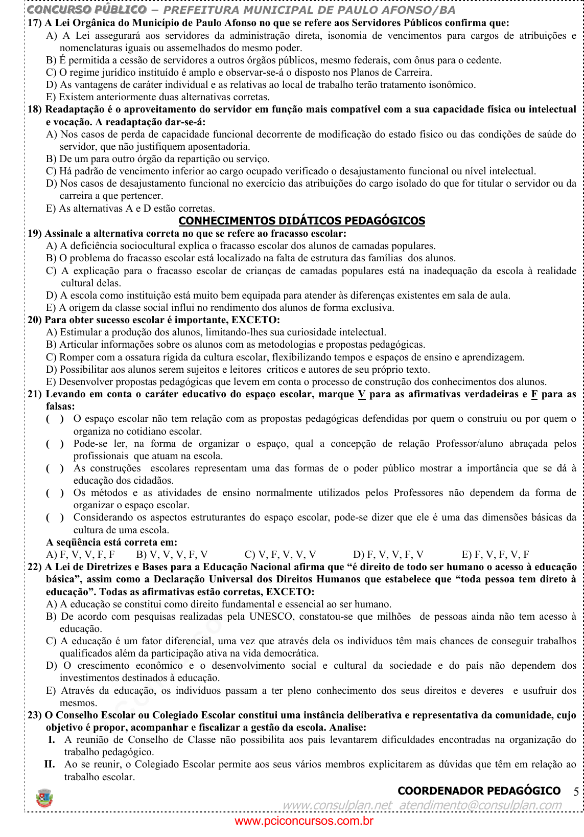 pcimarkpci MDAwMDowMDAwOjAwMDA6MDAwMDowMDAwOmZmZmY6YmZiOTphZTA5:RnJpLCAyOCBNYXIgMjAyNSAwMDoyMzoxMSAtMDMwMA== www.pciconcursos.com.br CCCOOONNNCCCUUURRRSSSOOO PPPÚÚÚBBBLLLIIICCCOOO − PREFEITURA MUNICIPAL DE PAULO AFONSO/BA COORDENADOR PEDAGÓGICO www.consulplan.net atendimento@consulplan.com 5 17) A Lei Orgânica do Município de Paulo Afonso no que se refere aos Servidores Públicos confirma que: A) A Lei assegurará aos servidores da administração direta, isonomia de vencimentos para cargos de atribuições e nomenclaturas iguais ou assemelhados do mesmo poder. B) É permitida a cessão de servidores a outros órgãos públicos, mesmo federais, com ônus para o cedente. C) O regime jurídico instituído é amplo e observar-se-á o disposto nos Planos de Carreira. D) As vantagens de caráter individual e as relativas ao local de trabalho terão tratamento isonômico. E) Existem anteriormente duas alternativas corretas. 18) Readaptação é o aproveitamento do servidor em função mais compatível com a sua capacidade física ou intelectual e vocação. A readaptação dar-se-á: A) Nos casos de perda de capacidade funcional decorrente de modificação do estado físico ou das condições de saúde do servidor, que não justifiquem aposentadoria. B) De um para outro órgão da repartição ou serviço. C) Há padrão de vencimento inferior ao cargo ocupado verificado o desajustamento funcional ou nível intelectual. D) Nos casos de desajustamento funcional no exercício das atribuições do cargo isolado do que for titular o servidor ou da carreira a que pertencer. E) As alternativas A e D estão corretas. CONHECIMENTOS DIDÁTICOS PEDAGÓGICOS 19) Assinale a alternativa correta no que se refere ao fracasso escolar: A) A deficiência sociocultural explica o fracasso escolar dos alunos de camadas populares. B) O problema do fracasso escolar está localizado na falta de estrutura das famílias dos alunos. C) A explicação para o fracasso escolar de crianças de camadas populares está na inadequação da escola à realidade cultural delas. D) A escola como instituição está muito bem equipada para atender às diferenças existentes em sala de aula. E) A origem da classe social influi no rendimento dos alunos de forma exclusiva. 20) Para obter sucesso escolar é importante, EXCETO: A) Estimular a produção dos alunos, limitando-lhes sua curiosidade intelectual. B) Articular informações sobre os alunos com as metodologias e propostas pedagógicas. C) Romper com a ossatura rígida da cultura escolar, flexibilizando tempos e espaços de ensino e aprendizagem. D) Possibilitar aos alunos serem sujeitos e leitores críticos e autores de seu próprio texto. E) Desenvolver propostas pedagógicas que levem em conta o processo de construção dos conhecimentos dos alunos. 21) Levando em conta o caráter educativo do espaço escolar, marque V para as afirmativas verdadeiras e F para as falsas: ( ) O espaço escolar não tem relação com as propostas pedagógicas defendidas por quem o construiu ou por quem o organiza no cotidiano escolar. ( ) Pode-se ler, na forma de organizar o espaço, qual a concepção de relação Professor/aluno abraçada pelos profissionais que atuam na escola. ( ) As construções escolares representam uma das formas de o poder público mostrar a importância que se dá à educação dos cidadãos. ( ) Os métodos e as atividades de ensino normalmente utilizados pelos Professores não dependem da forma de organizar o espaço escolar. ( ) Considerando os aspectos estruturantes do espaço escolar, pode-se dizer que ele é uma das dimensões básicas da cultura de uma escola. A seqüência está correta em: A) F, V, V, F, F B) V, V, V, F, V C) V, F, V, V, V D) F, V, V, F, V E) F, V, F, V, F 22) A Lei de Diretrizes e Bases para a Educação Nacional afirma que “é direito de todo ser humano o acesso à educação básica”, assim como a Declaração Universal dos Direitos Humanos que estabelece que “toda pessoa tem direto à educação”. Todas as afirmativas estão corretas, EXCETO: A) A educação se constitui como direito fundamental e essencial ao ser humano. B) De acordo com pesquisas realizadas pela UNESCO, constatou-se que milhões de pessoas ainda não tem acesso à educação. C) A educação é um fator diferencial, uma vez que através dela os indivíduos têm mais chances de conseguir trabalhos qualificados além da participação ativa na vida democrática. D) O crescimento econômico e o desenvolvimento social e cultural da sociedade e do país não dependem dos investimentos destinados à educação. E) Através da educação, os indivíduos passam a ter pleno conhecimento dos seus direitos e deveres e usufruir dos mesmos. 23) O Conselho Escolar ou Colegiado Escolar constitui uma instância deliberativa e representativa da comunidade, cujo objetivo é propor, acompanhar e fiscalizar a gestão da escola. Analise: I. A reunião de Conselho de Classe não possibilita aos pais levantarem dificuldades encontradas na organização do trabalho pedagógico. II. Ao se reunir, o Colegiado Escolar permite aos seus vários membros explicitarem as dúvidas que têm em relação ao trabalho escolar. www.pciconcursos.com.br pcimarkpci MDAwMDowMDAwOjAwMDA6MDAwMDowMDAwOmZmZmY6YmZiOTphZTA5:RnJpLCAyOCBNYXIgMjAyNSAwMDoyMzoxMSAtMDMwMA== www.pciconcursos.com.br CCCOOONNNCCCUUURRRSSSOOO PPPÚÚÚBBBLLLIIICCCOOO − PREFEITURA MUNICIPAL DE PAULO AFONSO/BA COORDENADOR PEDAGÓGICO www.consulplan.net atendimento@consulplan.com 6 III. A realização do Conselho de Escola estimula os pais a proporem formas de ajudar a escola a resolver alguns de seus problemas. IV. O Colegiado Escolar só existe enquanto está reunido. Ninguém tem autoridade especial fora do colegiado. V. O Colegiado Escolar delibera quando, pelo consenso de seus membros, toma a decisão final sobre determinado assunto ou problema. Estão corretas apenas as afirmativas: A) I, II, III, IV, V B) I, II e III C) I