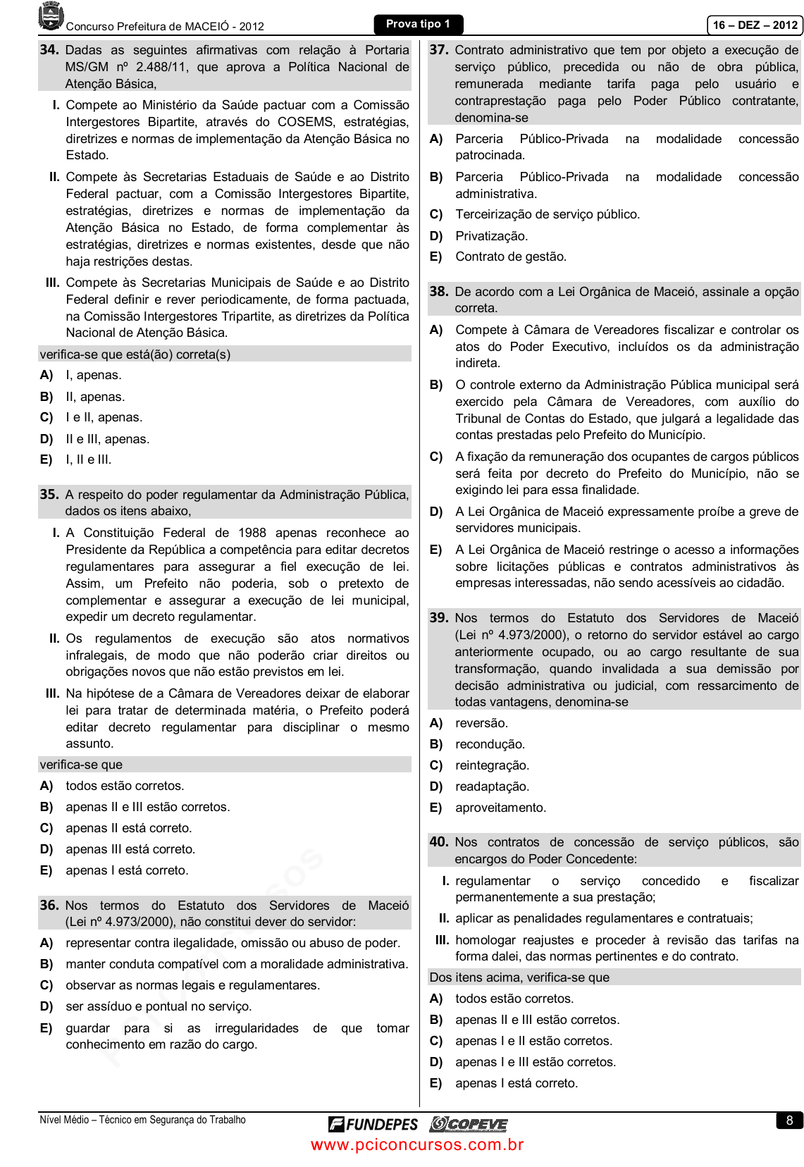 pcimarkpci MDAwMDowMDAwOjAwMDA6MDAwMDowMDAwOmZmZmY6ZDhlZTo2YjJh:RnJpLCAyOCBNYXIgMjAyNSAyMzo0Njo1NyAtMDMwMA== www.pciconcursos.com.br Nível Médio – Técnico em Segurança do Trabalho Prova tipo 1 16 – DEZ – 2012 Concurso Prefeitura de MACEIÓ - 2012 8 34. Dadas as seguintes afirmativas com relação à Portaria MS/GM nº 2.488/11, que aprova a Política Nacional de Atenção Básica, I. Compete ao Ministério da Saúde pactuar com a Comissão Intergestores Bipartite, através do COSEMS, estratégias, diretrizes e normas de implementação da Atenção Básica no Estado. II. Compete às Secretarias Estaduais de Saúde e ao Distrito Federal pactuar, com a Comissão Intergestores Bipartite, estratégias, diretrizes e normas de implementação da Atenção Básica no Estado, de forma complementar às estratégias, diretrizes e normas existentes, desde que não haja restrições destas. III. Compete às Secretarias Municipais de Saúde e ao Distrito Federal definir e rever periodicamente, de forma pactuada, na Comissão Intergestores Tripartite, as diretrizes da Política Nacional de Atenção Básica. verifica-se que está(ão) correta(s) A) I, apenas. B) II, apenas. C) I e II, apenas. D) II e III, apenas. E) I, II e III. 35. A respeito do poder regulamentar da Administração Pública, dados os itens abaixo, I. A Constituição Federal de 1988 apenas reconhece ao Presidente da República a competência para editar decretos regulamentares para assegurar a fiel execução de lei. Assim, um Prefeito não poderia, sob o pretexto de complementar e assegurar a execução de lei municipal, expedir um decreto regulamentar. II. Os regulamentos de execução são atos normativos infralegais, de modo que não poderão criar direitos ou obrigações novos que não estão previstos em lei. III. Na hipótese de a Câmara de Vereadores deixar de elaborar lei para tratar de determinada matéria, o Prefeito poderá editar decreto regulamentar para disciplinar o mesmo assunto. verifica-se que A) todos estão corretos. B) apenas II e III estão corretos. C) apenas II está correto. D) apenas III está correto. E) apenas I está correto. 36. Nos termos do Estatuto dos Servidores de Maceió (Lei nº 4.973/2000), não constitui dever do servidor: A) representar contra ilegalidade, omissão ou abuso de poder. B) manter conduta compatível com a moralidade administrativa. C) observar as normas legais e regulamentares. D) ser assíduo e pontual no serviço. E) guardar para si as irregularidades de que tomar conhecimento em razão do cargo. 37. Contrato administrativo que tem por objeto a execução de serviço público, precedida ou não de obra pública, remunerada mediante tarifa paga pelo usuário e contraprestação paga pelo Poder Público contratante, denomina-se A) Parceria Público-Privada na modalidade concessão patrocinada. B) Parceria Público-Privada na modalidade concessão administrativa. C) Terceirização de serviço público. D) Privatização. E) Contrato de gestão. 38. De acordo com a Lei Orgânica de Maceió, assinale a opção correta. A) Compete à Câmara de Vereadores fiscalizar e controlar os atos do Poder Executivo, incluídos os da administração indireta. B) O controle externo da Administração Pública municipal será exercido pela Câmara de Vereadores, com auxílio do Tribunal de Contas do Estado, que julgará a legalidade das contas prestadas pelo Prefeito do Município. C) A fixação da remuneração dos ocupantes de cargos públicos será feita por decreto do Prefeito do Município, não se exigindo lei para essa finalidade. D) A Lei Orgânica de Maceió expressamente proíbe a greve de servidores municipais. E) A Lei Orgânica de Maceió restringe o acesso a informações sobre licitações públicas e contratos administrativos às empresas interessadas, não sendo acessíveis ao cidadão. 39. Nos termos do Estatuto dos Servidores de Maceió (Lei nº 4.973/2000), o retorno do servidor estável ao cargo anteriormente ocupado, ou ao cargo resultante de sua transformação, quando invalidada a sua demissão por decisão administrativa ou judicial, com ressarcimento de todas vantagens, denomina-se A) reversão. B) recondução. C) reintegração. D) readaptação. E) aproveitamento. 40. Nos contratos de concessão de serviço públicos, são encargos do Poder Concedente: I. regulamentar o serviço concedido e fiscalizar permanentemente a sua prestação; II. aplicar as penalidades regulamentares e contratuais; III. homologar reajustes e proceder à revisão das tarifas na forma dalei, das normas pertinentes e do contrato. Dos itens acima, verifica-se que A) todos estão corretos. B) apenas II e III estão corretos. C) apenas I e II estão corretos. D) apenas I e III estão corretos. E) apenas I está correto. www.pciconcursos.com.br www.pciconcursos.com.br pcimarkpci MDAwMDowMDAwOjAwMDA6MDAwMDowMDAwOmZmZmY6ZDhlZTo2YjJh:RnJpLCAyOCBNYXIgMjAyNSAyMzo0Njo1NyAtMDMwMA== www.pciconcursos.com.br Nível Médio – Técnico em Segurança do Trabalho Prova tipo 1 16 – DEZ – 2012 Concurso Prefeitura de MACEIÓ - 2012 9 CONHECIMENTOS ESPECÍFICOS 41. Considerando a NR-16 que discorre sobre Atividades e Operações Perigosas, é correto afirmar que A) o exercício de trabalho em condições de periculosidade assegura ao trabalhador a percepção de adicional de 1/3 (um terço) incidente sobre o salário. B) o transporte de inflamáveis líquidos ou gasosos liquefeitos é considerado condição de periculosidade, independentemente da quantidade transportada. C) são considerados em atividade perigosa todos os trabalhadores que atuam no transporte de explosivos. D) não caracterizam periculosidade, para fins de percepção de adicional, trabalhadores que operam em bombas de abastecimento de gasolina. E) se inclui entre as atividades perigosas aquelas que envolvem o uso de armas de fogo. 42. Sobre o Programa de Prevenção de Riscos Ambientais (PPRA), é correto afirmar que A) a NR-9 co