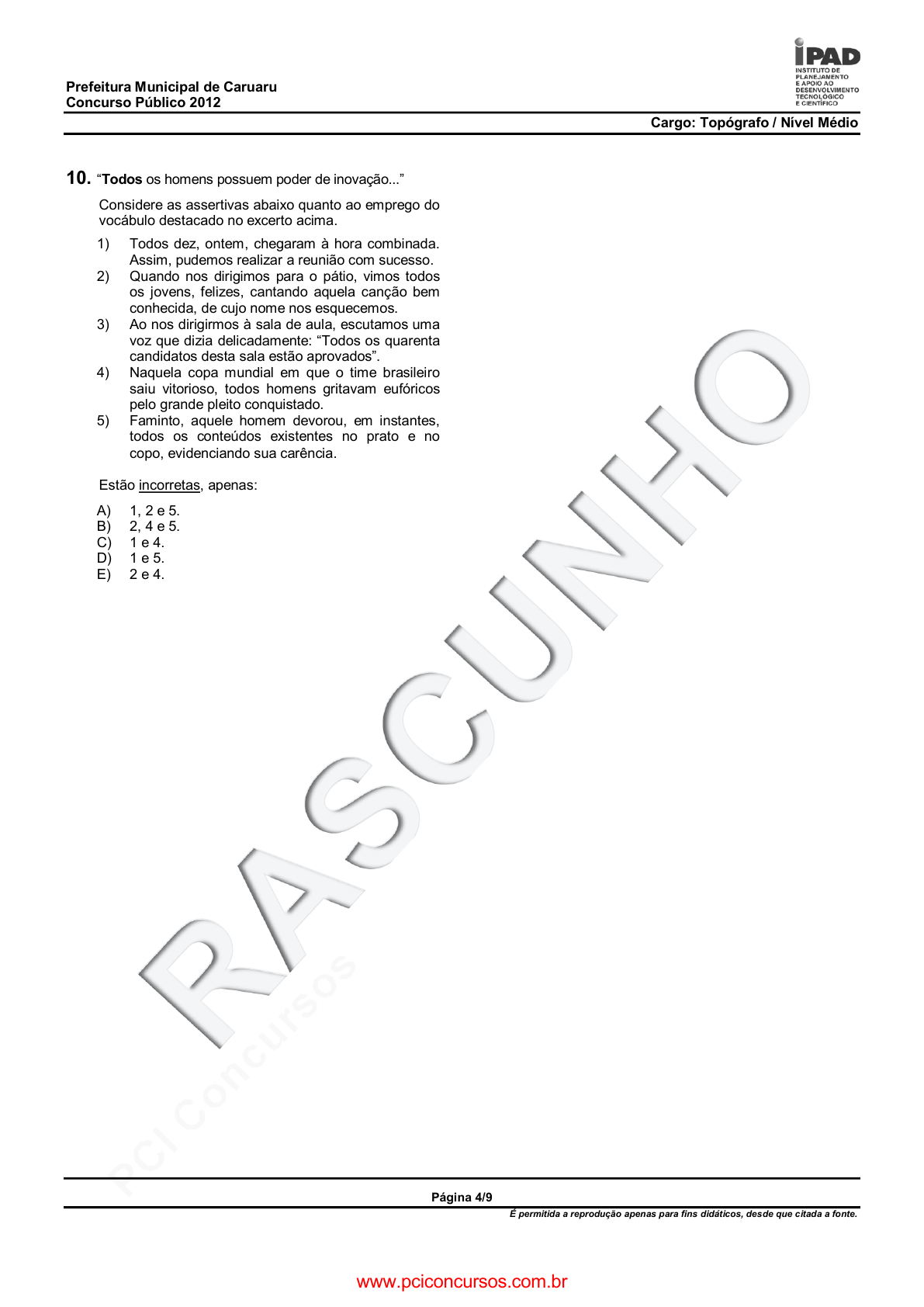 pcimarkpci MDAwMDowMDAwOjAwMDA6MDAwMDowMDAwOmZmZmY6YmZiOTphZTA5:U2F0LCAyOSBNYXIgMjAyNSAwMDozODoxMSAtMDMwMA== www.pciconcursos.com.br Prefeitura Municipal de Caruaru Concurso Público 2012 Cargo: Topógrafo / Nível Médio Página 4/9 É permitida a reprodução apenas para fins didáticos, desde que citada a fonte. 10. “Todos os homens possuem poder de inovação...” Considere as assertivas abaixo quanto ao emprego do vocábulo destacado no excerto acima. 1) Todos dez, ontem, chegaram à hora combinada. Assim, pudemos realizar a reunião com sucesso. 2) Quando nos dirigimos para o pátio, vimos todos os jovens, felizes, cantando aquela canção bem conhecida, de cujo nome nos esquecemos. 3) Ao nos dirigirmos à sala de aula, escutamos uma voz que dizia delicadamente: “Todos os quarenta candidatos desta sala estão aprovados”. 4) Naquela copa mundial em que o time brasileiro saiu vitorioso, todos homens gritavam eufóricos pelo grande pleito conquistado. 5) Faminto, aquele homem devorou, em instantes, todos os conteúdos existentes no prato e no copo, evidenciando sua carência. Estão incorretas, apenas: A) 1, 2 e 5. B) 2, 4 e 5. C) 1 e 4. D) 1 e 5. E) 2 e 4. www.pciconcursos.com.br pcimarkpci MDAwMDowMDAwOjAwMDA6MDAwMDowMDAwOmZmZmY6YmZiOTphZTA5:U2F0LCAyOSBNYXIgMjAyNSAwMDozODoxMSAtMDMwMA== www.pciconcursos.com.br Prefeitura Municipal de Caruaru Concurso Público 2012 Cargo: Topógrafo / Nível Médio Página 5/9 É permitida a reprodução apenas para fins didáticos, desde que citada a fonte. Matemática 11. Chegou ao Brasil a máquina de reciclar latinhas de refrigerante. Nela, para cada três latinhas colocadas, a pessoa recebe R$ 0,20 em dinheiro. Nessa máquina, uma pessoa que recebeu R$ 24,00 colocou A) 220 latinhas de refrigerante. B) 240 latinhas de refrigerante. C) 300 latinhas de refrigerante. D) 360 latinhas de refrigerante. E) 480 latinhas de refrigerante. 12. Em uma doação são retirados, em média, 400 ml de sangue, sendo necessárias 10 semanas entre uma doação e outra. Ao mesmo tempo, sabe-se que uma pessoa pode perder 2l de sangue sem correr riscos. Supondo que uma pessoa não respeite esse intervalo e faça doações sucessivas de 400 ml de sangue, em quantas doações ela atingiria o limite máximo? A) 2 doações. B) 4 doações. C) 5 doações. D) 6 doações. E) 8 doações. 13. Com as novas refinarias que estão sendo construídas, o Brasil será capaz de refinar, em 2020, 3,95 milhões de barris de petróleo por dia. Se em 2020 o consumo interno for de 2,8 mil barris de petróleo por dia, que excedente poderá ser exportado? A) 6,75 milhões de barris de petróleo por dia. B) 3,73 milhões de barris de petróleo por dia. C) 3,67 milhões de barris de petróleo por dia. D) 2,85 milhões de barris de petróleo por dia. E) 1,15 milhões de barris de petróleo por dia. 14. O saldo da balança comercial de um país é calculado pela diferença entre o que ele exporta e o que ele importa. Em abril, certo país exportou 7,0 bilhões de dólares e importou 9,3 bilhões de dólares. De quanto foi o saldo da balança comercial desse país em abril? A) + 2,6 bilhões de dólares. B) + 1,2 bilhões de dólares. C) – 1,2 bilhões de dólares. D) – 2,3 bilhões de dólares. E) – 2,6 bilhões de dólares. 15. Em média, 12 músicos se espremem no palco de um trio elétrico, que mede 6 m de comprimento por 3,5 m de largura. Quanto mede a área desse palco? A) 9,5 m 2 B) 12,0 m 2 C) 18,0 m 2 D) 21,0 m 2 E) 24,5 m 2 16. Recife, Fortaleza e Salvador são as três capitais do nordeste com maior número de pessoas morando sozinhas. Ao todo, essas três capitais possuem 285 mil residências com um único morador. Fortaleza tem 15 mil pessoas a mais morando sozinhas que Recife, e Salvador tem o dobro do número de pessoas morando sozinhas que Fortaleza. De acordo com esses dados, quantas pessoas moram sozinhas em Recife? A) 150 mil pessoas. B) 135 mil pessoas. C) 95 mil pessoas. D) 75 mil pessoas. E) 60 mil pessoas. 17. O helicóptero que abastece uma plataforma de petróleo em alto mar voa a uma velocidade de 225 km/h. Se a plataforma fica a 300 km da base, quanto tempo esse helicóptero leva para chegar à plataforma? A) 1h 45min B) 1h 33min C) 1h 30min D) 1h 25min E) 1h 20min 18. A expressão “beber socialmente” equivale, segundo os especialistas, ao consumo máximo diário de álcool correspondente a três doses de bebida. Uma dose de bebida equivale a uma latinha com 350 ml de cerveja ou uma taça com 90 ml de vinho ou um copo com 25 ml de uísque. De acordo com esses dados, uma lata com 350 ml de uísque corresponde a A) 12 doses de bebida. B) 14 doses de bebida. C) 18 doses de bebida. D) 25 doses de bebida. E) 35 doses de bebida. 19. Fofo e Fino almoçaram juntos, e a conta foi de 84 reais. Na hora de pagar a conta, Fofo, que consumiu o triplo de Fino, estabeleceu que cada um pagaria o valor proporcional ao seu consumo. Nessas condições, qual o valor pago por Fofo? A) 21 reais. B) 28 reais. C) 42 reais. D) 56 reais. E) 63 reais. 20. Esse mês, Rosana atrasou o pagamento da taxa extra do condomínio, que era de 200 reais. Com isso, ela deverá pagar, a mais, 5% desse valor a título de multa e 2% de juros. Ao todo, quanto Rosana deverá pagar? A) 214 reais. B) 210 reais. C) 207 reais. D) 205 reais. E) 204 reais. www.pciconcursos.com.br