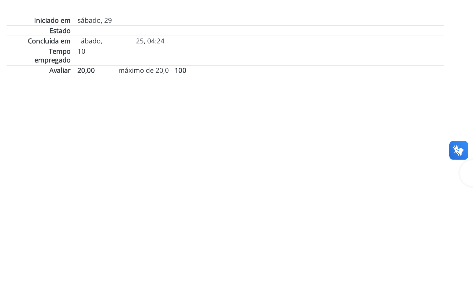 ... Iniciado em sábado, 29 mar 2025, 04:14 Estado Finalizada Concluída em sábado, 29 mar 2025, 04:24 Tempo empregado 10 minutos 29 segundos Avaliar 20,00 de um máximo de 20,00(100%) Questão 1 Correto Atingiu 4,00 de 4,00 Sobre o Sistema Mineiro de Avaliação e Equidade da Educação Pública (Simave) Complete as lacunas: O objetivo da ________________ é subsidiar dados para direcionar as ações pedagógicas que visam sanar as lacunas encontradas no processo de ensino-aprendizagem dos estudantes. As ________________ cumprem a finalidade de avaliar especificamente os conhecimentos em Língua Portuguesa e Matemática dos estudantes. Juntamente com as ________________, são aplicados os Questionários Contextuais, com objetivo de obter dados sobre o nível socioeconômico e a trajetória escolar dos estudantes, o perfil dos professores, a infraestrutura da escola e as características da gestão escolar A __________________ acontece no primeiro semestre do ano letivo e contém itens relacionados às habilidades do ano de escolaridade anterior. Avaliação Externa Diagnóstica Avaliações Externas Somativas Avaliações Externas Somativas Avaliação Externa Diagnóstica Sua resposta está correta. Questão 2 Correto Atingiu 4,00 de 4,00 A respeito da Avaliação da Fluência em Leitura, marque a afirmativa correta: a. A aplicação é realizada duas vezes ao ano. b. Sua função é aferir a capacidade de os alunos lerem, com velocidade e precisão. c. O instrumento avaliativo é composto apenas por palavras dicionarizadas. d. É uma avaliação destinada a todos os estudantes dos Anos Iniciais do Ensino Fundamental (1º ao 5º ano) Sua resposta está correta. Questão 3 Correto Atingiu 4,00 de 4,00 Sobre os Sistemas de Avaliações Educacionais, marque Verdadeiro (V) ou Falso (F), nas alternativas abaixo: ( )O Saeb proporciona uma visão abrangente da educação brasileira, fornecendo dados concretos para a implementação de políticas educacionais – em níveis local, estadual e nacional – com o objetivo de aprimorar a qualidade do ensino oferecido aos nossos alunos. ( )O Simave, o Saeb e o Pisa aplicam somente um instrumento de coleta de dados, que são os testes cognitivos. ( )São avaliações internacionais aplicadas no Brasil: PISA, PIRLS e TIMSS. ( )A cada ciclo, que dura dois anos, uma das três áreas cognitivas - Leitura, Matemática e Ciências - é o foco ou domínio principal da avaliação do Pisa. a. V,V,F,V b. V,F,V,F c. F,V,V,F d. V,V,V,F Sua resposta está correta. Questão 4 Correto Atingiu 4,00 de 4,00 Considerando as avaliações nacionais, relacione as colunas de acordo com o público-alvo de cada uma: Avaliação do Compromisso Nacional Criança Alfabetizada Avaliação do Pacto Nacional pela Recomposição das Aprendizagens Avaliação do Saeb EF - Anos Iniciais EF - Anos Finais Ensino Fundamental e Médio Sua resposta está correta. Questão 5 Correto Atingiu 4,00 de 4,00 Sobre os instrumentos normativos que regulam a avaliação educacional, marque Verdadeiro (V) ou Falso (F), nas alternativas abaixo: ( )A Resolução SEE nº 4.948/2024 estabelece as seguintes estratégias de intervenção pedagógica, baseadas nos resultados das avaliações: recomposição das aprendizagens, o reforço escolar e o agrupamento temporário. ( )A Resolução SEE nº 4.948/2024 apresenta apenas as definições e diretrizes para realização das avaliações internas. ( )A LDB estabelece como responsabilidade da União a condução do processo nacional de avaliação do desempenho escolar no ensino fundamental, médio e superior, em parceria com os sistemas de ensino ( )De acordo com a LDB avaliação deve ser contínua e cumulativa. a. F,V,V,F b. F,F,V,V c. V,V,F,V d. V,F,V,V Sua resposta está correta. https://ead.educacao.mg.gov.br/mod/resource/view.php?id=37625&forceview=1 https://ead.educacao.mg.gov.br/mod/resource/view.php?id=37625&forceview=1 https://ead.educacao.mg.gov.br/mod/resource/view.php?id=37625&forceview=1 https://ead.educacao.mg.gov.br/mod/page/view.php?id=37627&forceview=1 https://ead.educacao.mg.gov.br/mod/page/view.php?id=37627&forceview=1 https://ead.educacao.mg.gov.br/mod/page/view.php?id=37627&forceview=1