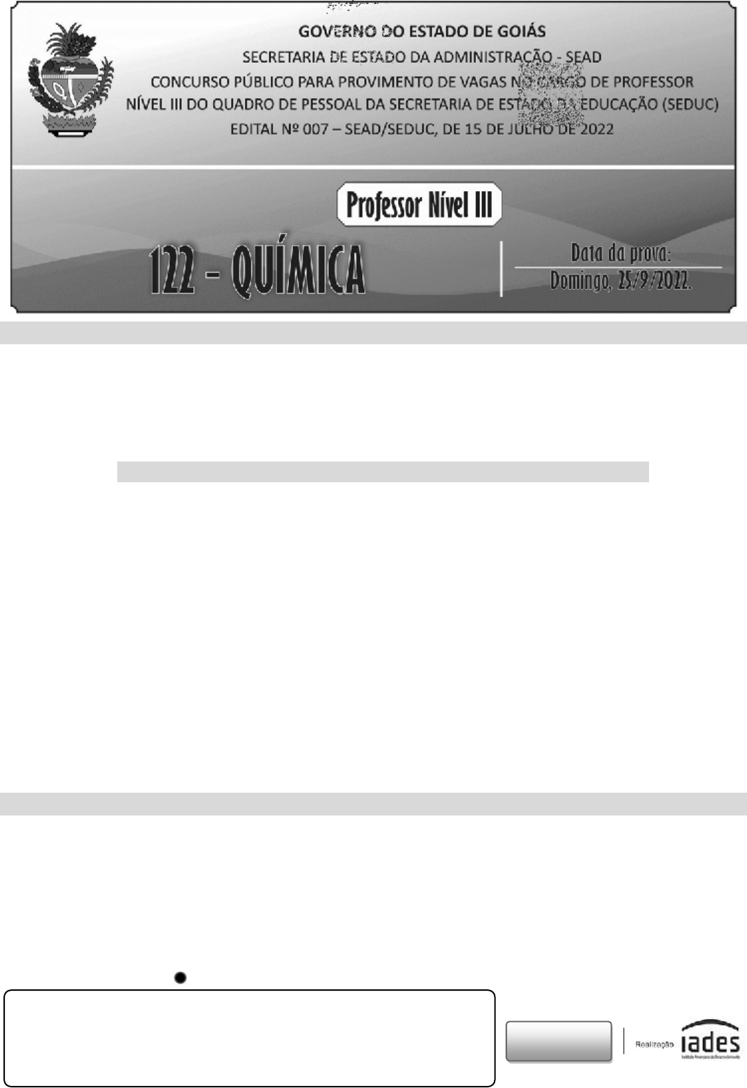 PROVA APLIC ADA Tipo “A” I N S T R U Ç Õ E S Você receberá do fiscal: o 1 (um) caderno de questões das provas objetiva e discursiva contendo 80 (oitenta) questões de múltipla escolha, com 5 (cinco) alternativas de resposta cada uma e apenas 1 (uma) alternativa correta, e 1 (uma) questão discursiva; o 1 (uma) folha de respostas personalizada da prova objetiva; e o 1 (uma) folha de texto definitivo da prova discursiva. Quando autorizado pelo fiscal do IADES, no momento da identificação, escreva no espaço apropriado da folha de respostas da prova objetiva, com a sua caligrafia usual, a seguinte frase: Aprenda com o ontem. Viva o hoje. Verifique se estão corretas a numeração das questões e a paginação do caderno de questões, bem como a codificação da folha de respostas da prova objetiva e da folha de texto definitivo da prova discursiva. Você dispõe de 5 (cinco) horas para fazer as provas objetiva e discursiva e deve controlar o tempo, pois não haverá prorrogação desse prazo. Esse tempo inclui a marcação da folha de respostas da prova objetiva e o preenchimento da folha de texto definitivo da prova discursiva. Somente 1 (uma) hora após o início das provas, você poderá entregar sua folha de respostas da prova objetiva, a folha de texto definitivo da prova discursiva e o caderno de provas, bem como retirar-se da sala. O candidato somente poderá retirar-se do local de aplicação das provas levando o caderno de provas no decurso dos últimos 75 (setenta e cinco) minutos anteriores ao término do tempo destinado à realização das provas. Após o término das provas, entregue ao fiscal do IADES a folha de respostas da prova objetiva, devidamente assinada, e a folha de texto definitivo da prova discursiva. Deixe sobre a carteira apenas o documento de identidade e a caneta esferográfica de tinta preta, fabricada com material transparente. Não é permitida a utilização de nenhum aparelho eletrônico ou de comunicação. Não é permitida a consulta a livros, dicionários, apontamentos e (ou) apostilas. Você somente poderá sair e retornar à sala de aplicação de provas na companhia de um fiscal do IADES. Não será permitida a utilização de lápis em nenhuma etapa das provas. Ao final das provas, os (as) 3 (três) últimos(as) candidatos(as) devem permanecer juntos(as) na sala, com todo o seu material, sendo somente liberados(as) quando o (a) último(a) tiver concluído as provas, entregando, simultaneamente, o cartão de resposta da prova objetiva e a folha de texto definitivo da prova discursiva. I NS T RU Ç Õ ES P A R A A S P R O V AS O B J ETI V A E D I S C UR S IV A Verifique se os seus dados estão corretos na folha de respostas da prova objetiva e na folha de texto definitivo da prova discursiva. Caso haja algum dado incorreto, comunique ao fiscal. Leia atentamente cada questão e assinale, na folha de respostas da prova objetiva, uma única alternativa. A folha de respostas da prova objetiva e a folha de texto definitivo da prova discursiva não podem ser dobradas, amassadas, rasuradas ou manchadas e nem podem conter nenhum registro fora dos locais destinados às respostas. O candidato deverá transcrever, com caneta esferográfica de tinta preta, as respostas da prova objetiva para a folha de respostas e o texto definitivo da prova discursiva para a folha de texto definitivo. A maneira correta de assinalar a alternativa na folha de respostas da prova objetiva é cobrir, fortemente, com caneta esferográfica de tinta preta, o espaço a ela correspondente. Marque as respostas assim: PROVA APLIC ADA CONCURSO PÚBLICO – SEAD/SEDUC-GO 122 – QUÍMICA TIPO “A” PÁGINA 2/18 P R O V A O B J E T I V A CONHECIMENTOS GERAIS Questões de 1 a 40 LÍNGUA PORTUGUESA Questões de 1 a 10 Texto 1 para responder às questões de 1 a 5. 1 4 7 10 13 16 19 22 25 28 31 34 A violência e as violações de direitos de meninas e meninos perpassam de muitas maneiras a escola, que pode tanto ser produtora desse fenômeno como pode ser impactada por ele. Mais de 2,8 milhões de crianças e adolescentes de 4 a 17 anos de idade estavam fora da escola no País, em 2015. Essa exclusão tem rosto e endereço: trata-se de meninas e meninos que vivem em domicílios com renda per capita de até meio salário mínimo (53%), cuja maioria é negra e possui direitos violados também em outras áreas, tais como saúde, assistência social e proteção. A exclusão escolar faz com que muitas dessas crianças e adolescentes, quando conseguem retornar para a escola, estejam em situação de atraso escolar. Quase 6,5 milhões de estudantes da educação básica pública estavam, em 2018, em distorção idade-série no País, ou seja, possuíam dois ou mais anos de atraso escolar. O perfil de vulnerabilidade se fortalece, e milhões de crianças e adolescentes ficam atados ao ciclo do fracasso escolar. Estudo do Unicef a respeito dos homicídios de adolescentes no estado do Ceará verificou que mais de 70% dos adolescentes que foram assassinados em 2015, nas sete cidades cearenses pesquisadas, estavam fora da escola há pelo menos seis meses. A evasão escolar e o baixo número de anos de estudo colaboram para a vulnerabilidade de crianças e adolescentes, o que aumenta suas chances de vitimização. Esses dados indicam a importância do papel da educação na proteção de crianças e de adolescentes contra as violências. Contudo, a educação por si só não consegue enfrentar a complexidade desse fenômeno, que reivindica a participação de diversas políticas públicas, tais como as de assistência social, saúde, segurança pública, cultura, entre outras. Disponível em: . Acesso em: 30 jul. 2022 (fragmento), com adaptações. QUESTÃO 1 _______________________ Com base na leitura do texto, acerca da violência sofrida por crianças e adolescentes, assinale a alternativa correta. (A) A escola pode ser considerada um local de produção da violência. (B) A violência é pr