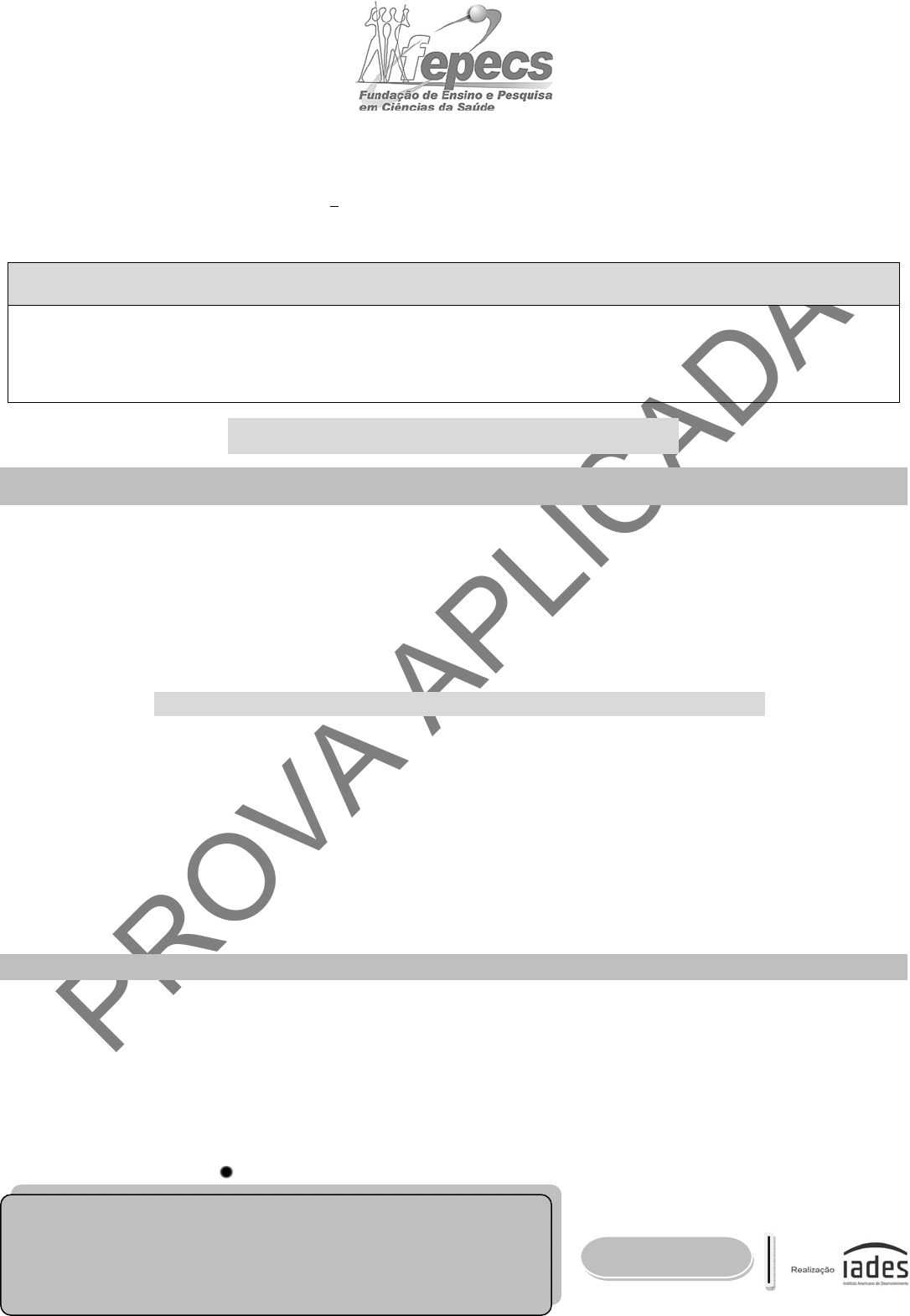 PROVA APLIC ADA Tipo “U” SECRETARIA DE ESTADO DE SAÚDE DO DISTRITO FEDERAL FUNDAÇÃO DE ENSINO E PESQUISA EM CIÊNCIAS DA SAÚDE EDITAL NORMATIVO NO 1/2020 – RP/SES-DF/2021, DE 13 DE OUTUBRO DE 2020 PROGRAMA 2 9 3 e 6 9 3 ( M S ) Multiprofissional em Urgência/Trauma Fisioterapia Data e horário da prova: domingo, 6/12/2020, às 14h. I N S T R U Ç Õ E S Você receberá do fiscal: o um caderno da prova objetiva contendo 120 (cento e vinte) itens – cada um deve ser julgado como CERTO ou ERRADO, de acordo com o(s) comando(s) a que se refere –; e o uma folha de respostas personalizada. Verifique se a numeração dos itens, a paginação do caderno da prova objetiva e a codificação da folha de respostas estão corretas. Verifique se o programa selecionado por você está explicitamente indicado nesta capa. Quando autorizado pelo fiscal do IADES, no momento da identificação, escreva, no espaço apropriado da folha de respostas, com a sua caligrafia usual, a seguinte frase: Nem vencer, nem perder, mas sim evoluir. Você dispõe de 3 (três) horas e 30 (trinta) minutos para fazer a prova objetiva, devendo controlar o tempo, pois não haverá prorrogação desse prazo. Esse tempo inclui a marcação da folha de respostas. Somente 1 (uma) hora após o início da prova, você poderá entregar sua folha de respostas e o caderno da prova e retirar-se da sala. Somente será permitido levar o caderno da prova objetiva 3 (três) horas após o início da prova. Deixe sobre a carteira apenas o documento de identidade e a caneta esferográfica de tinta preta, fabricada com material transparente. Não é permitida a utilização de nenhum tipo de aparelho eletrônico ou de comunicação. Não é permitida a consulta a livros, dicionários, apontamentos e (ou) apostilas. Você somente poderá sair e retornar à sala de aplicação da prova na companhia de um fiscal do IADES. Não será permitida a utilização de lápis em nenhuma etapa da prova. I N S T R U Ç Õ E S P A R A A P R O V A O B J E T I V A Verifique se os seus dados estão corretos na folha de respostas da prova objetiva. Caso haja algum dado incorreto, comunicar ao fiscal. Leia atentamente cada item e assinale sua resposta na folha de respostas. A folha de respostas não pode ser dobrada, amassada, rasurada ou manchada e nem pode conter registro fora dos locais destinados às respostas. O candidato deverá transcrever, com caneta esferográfica de tinta preta, fabricada com material transparente, as respostas da prova objetiva para a folha de respostas. A maneira correta de assinalar a alternativa na folha de respostas é cobrir, fortemente, com caneta esferográfica de tinta preta, fabricada com material transparente, o espaço a ela correspondente. Marque as respostas assim: PROVA APLIC ADA PROCESSO SELETIVO – RP/SES – DF/2021 293 e 693 (MS) – MULTIPROFISSIONAL EM URGÊNCIA/TRAUMA FISIOTERAPIA – TIPO “U” PÁGINA 2/9 Fisioterapia Itens de 1 a 120 A disfunção femoropatelar é uma condição patológica multifatorial que afeta principalmente as mulheres. Testes clínicos tentam elucidar as possíveis causas biomecânicas para o desenvolvimento da disfunção, visando a estratégias de tratamento com base em raciocínio clínico. Teste de agachamento unipodal (A) e teste de salto bipodal (B) MOREIRA, C. B. Educação Física, Esportes e Saúde. In: Revista Conexões. v. 17, e019003, p. 1-14, São Paulo, 2019. ISSN: 1980-9030. Considerando as imagens apresentadas e com base nos conhecimentos correlatos, julgue os itens a seguir. 1. O valgismo dinâmico exacerbado do joelho pode levar à disfunção femoropatelar por causa da rotação femoral medial e lateralização da patela. 2. Os músculos pelvitrocanterianos devem ser preferencialmente alongados durante as sessões de fisioterapia. 3. O músculo glúteo mínimo é o principal estabilizador da báscula pélvica. 4. Exercícios em cadeia cinética fechada devem ser enfatizados, sobretudo estimulando a estabilização em abdução do quadril e rotação lateral do fêmur. 5. As bandagens funcionais, como kinesio tape e McConnell, podem ser instituídas no tratamento dessas pacientes, a fim de minimizar a dor femoropatelar. Área livre Uma paciente de 78 anos de idade, osteoporótica, com história prévia de insuficiência cardíaca, sofreu uma queda em casa, que ocasionou uma fratura transmetatarsal do pé direito em nível do III, IV e V metatarsos. Ficou imobilizada com aparelho gessado por cinco semanas e utilizou cadeira de rodas como recurso auxiliar de marcha, porém a fratura ainda não estava completamente consolidada. Após esse período, ela foi indicada para um programa de reabilitação aquática. Na avaliação fisioterapêutica, a paciente referia dor grau 6 pela EVA, edema significativo em pés, tornozelos e pernas em função de insuficiência cardíaca, porém a perna direita mostrou-se com sinal de cacifo positivo, além de amplitude de movimento bastante restrita para flexoextensão e inversão – eversão do tornozelo, bem como importante hipotrofia muscular em tríceps sural. Com base nesse caso clínico e nos conhecimentos correlatos, julgue os itens a seguir. 6. O fisioterapeuta deve iniciar o programa de reabilitação aquática com a paciente em menor profundidade de imersão (nível da cintura pélvica), para que a descarga de peso auxilie no processo de consolidação da fratura. 7. A água aquecida da piscina terapêutica a 36 ºC trará benefícios cardiovasculares para essa paciente, pois a vasodilatação periférica aumentará a resistência periférica nos membros inferiores e a pré-carga cardíaca. 8. O princípio físico da água chamado “empuxo” será de grande valia para facilitar o retorno venoso nessa paciente com distúrbios cardiovasculares. 9. O Programa de Dez Pontos, preconizado pelo conceito Halliwick, é uma técnica interessante para a adaptação dessa paciente no meio aquático, haja vista que muitas pessoas