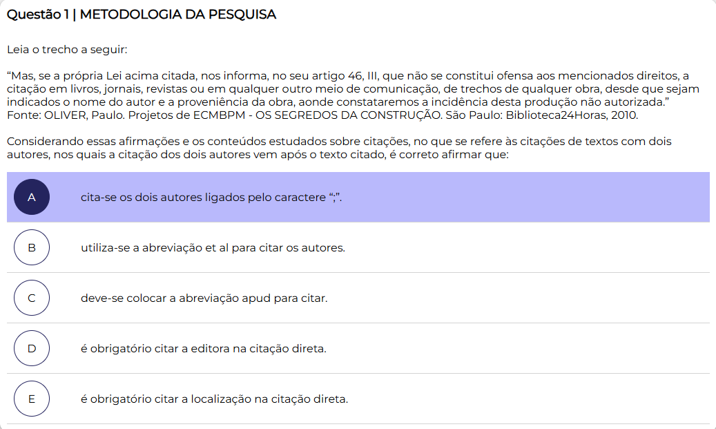 Questão 1 METODOLOGIA DA PESQUISA Leia trecho a seguir: "Mas, se a própria Lei acima citada, nos informa, no seu artigo 46, III, que não se constitui ofensa aos mencionados direitos, a citação em livros, jornais, revistas ou em qualquer outro meio de comunicação, de trechos de qualquer obra, desde que sejam indicados nome do autor e a proveniência da obra, aonde constataremos a incidência desta produção não autorizada." Fonte: OLIVER, Paulo. Projetos de ECMBPM - os SEGREDOS DA CONSTRUÇÃO. São Paulo: Biblioteca24Horas 2010. Considerando essas afirmações e os conteúdos estudados sobre citações, no que se refere às citações de textos com dois autores, nos quais a citação dos dois autores vem após texto citado, é correto afirmar que: A cita-se os dois autores ligados pelo caractere B utiliza-se a abreviação et al para citar os autores. C deve-se colocar a abreviação apud para D é obrigatório citar a editora na citação E é obrigatório citar a localização na citação direta.