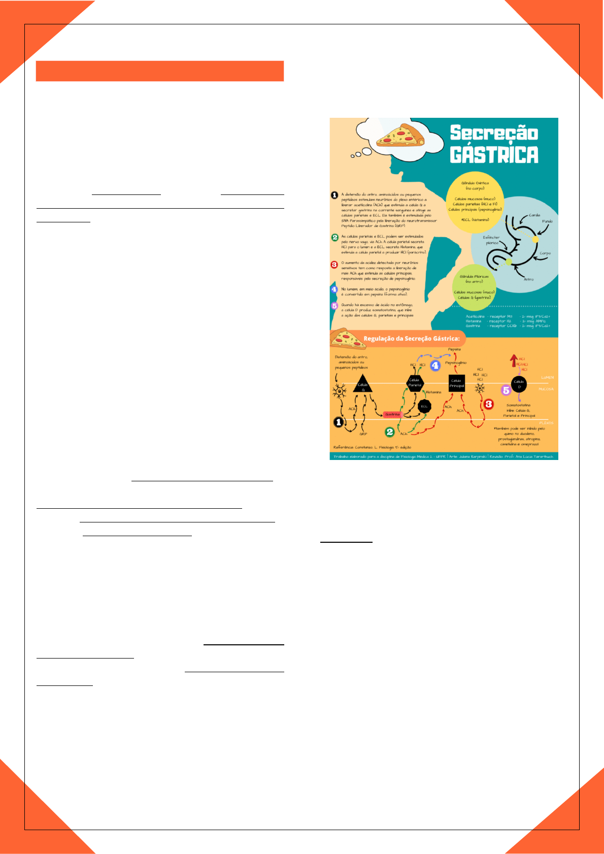 SP 1.2 – “Voltando das férias...” Rebecca Castro e Vitória Freiberger 1 Tutoria FASES DE CONTROLE NEURAL E HORMONAL: • Fase cefálica: Conceito: estímulos olfatórios, visuais e pensamentos sobre consumo de comida, que causam aumento do fluxo parassimpático excitatório neural para todo o trato gastrointestinal Esse fluxo parassimpático causa um aumento das secreções salivares, de ácido gástrico, enzimático e pancreático – as respostas aos estímulos prévios melhoram a capacidade do TGI de receber e digerir o alimento que virá. Digestão mecânica e química na boca: quando o alimento chega na boca, se encontra com a saliva que possui as funções de amolecer e lubrificar o alimento tornando-o mais fácil de deglutir. Possui amilase salivar (ptialina) e lipase lingual, função gustativa e função de defesa, pois possui a lisozima, que possui ação bacteriana e imunoglobulinas incapacitando bactérias e vírus. A digestão mecânica ocorre pelos dentes, língua e lábios – esses estímulos mecânicos e químicos (gustação), causam resposta parassimpática, pela presença do alimento na boca. Controle neural: a regulação da secreção salivar é exclusivamente neural – é estimulada tanto pela divisão simpática como pela parassimpática do SNA, porém o controle fisiológico primário das glândulas é feito pelo sistema parassimpático. Deglutição: o reflexo da deglutição inicia-se voluntariamente e depende dos receptores de estiramento na abertura da faringe. Impulsos desses receptores são recebidos por uma área no bulbo denominada centro da deglutição. A deglutição tem início quando se empurra a língua contra o palato duro, movendo o bolo alimentar em direção à faringe – dessa forma, receptores mecânicos são ativados e começa o reflexo da deglutição. 1. língua empurra o bolo alimentar contra o palato duro e a parte posterior da boca, gerando o reflexo de deglutição (nervo glossofaríngeo - IX- comunicando-se com o bulbo). 2. palato mole se eleva fechando a nasofaringe e o esfíncter esofágico superior se encontra contraído. 3. respiração é inibida para a passagem do bolo alimentar, epiglote se dobra para baixo e o esfíncter esofágico superior relaxa. 4. o bolo alimentar é transportado até o estômago pelos movimentos peristálticos e gravidade. • Fase gástrica Controle neural: estímulos mecânicos (distensão da parede) e químicos regulam a função motora gástrica por meio de vias neurais através dos reflexos vagovagais. A distensão da parede gástrica resulta na inibição da musculatura lisa na porção proximal do estômago e o subsequente reflexo de acomodação - entrada e o armazenamento do alimento com aumento da pressão intragástrica. A frequência das contrações fásicas do antro é determinada pelo marcapasso gástrico (células intersticiais de Cajal); no entanto a amplitude das contrações é regulada pela liberação de neurotransmissores pelos neurônios entéricos (reflexos), substância P e acetilcolina, que aumentam a despolarização da musculatura lisa. A maior força das contrações antrais durante a fase gástrica tentará empurrar o conteúdo gástrico em direção ao piloro, sendo que este passa mais tempo contraído e impede a saída do conteúdo, o que resulta na sua mistura e posterior liberação. SISTEMA NERVOSO ENTÉRICO SP 1.2 – “Voltando das férias...” Rebecca Castro e Vitória Freiberger 2 Digestão: no estômago, a amilase é desnaturada devido ao pH ácido – há secreção de ácido clorídrico pelas células parietais, o que ativa enzimas importantes e elimina bactérias. O pepsinogênio é convertido em pepsina em pH ácido, iniciando a digestão das proteínas no bolo alimentar em peptídeos – nesse estágio, o peristaltismo é ativado pelo SNA. • Fase intestinal: Passagem do quimo em frações controladas para o intestino delgado. O quimo (bolo alimentar ácido) passa para o duodeno. As células S presentes liberam secretina, um hormônio que atua no pâncreas para liberar bicarbonato e neutralizar a acidez do quimo proveniente do estômago. Na segunda porção do duodeno, substâncias biliares e pancreáticas contribuem para a digestão. A bile realiza a digestão dos lipídios por emulsificação, enquanto o pâncreas libera enzimas no suco pancreático para atuar em carboidratos, lipídios e proteínas – a secreção da bile é controlada principalmente pelo hormônio colecistoquinina (CCK), que é liberado em resposta à presença de alimentos no intestino delgado, especialmente quando alimentos ricos em gordura são detectados. A motilidade intestinal é estimulada pela inervação parassimpática, CCK (colecistoquinina) e pela gastrina – a absorção dos nutrientes ocorre nas vilosidades enquanto a secreção de fluidos e hormônios ocorre nas criptas. A maioria dos nutrientes absorvidos vai para os capilares sanguíneos conectados com o intestino enquanto as gorduras geralmente são transportadas pelo sistema linfático O sangue drenado do TGI vai para o fígado pelo sistema porta-hepático para ser filtrado pelos hepatócitos, que possuem isoenzimas e citocromo p450 que metabolizam os fármacos e os xenobióticos antes desses alcançarem a circulação sistêmica. Hormônios importantes: • Gastrina (secretada pelas células G) – em resposta da ingestão ou extensão do estômago, estimulando a secreção gástrica de ácido e o crescimento da mucosa gástrica. • CCK (secretada pelas células I) – em resposta aos produtos da digestão de gordura, ácidos graxos e monoglicerídeos, contrai vesícula biliar, expelindo bile para o intestino delgado e inibe a contração do estômago e também inibe o apetite. • Secretina (secretada pelas células S) - em resposta ao conteúdo gástrico ácido que é transferido do estômago ao duodeno pelo piloro, tem pequeno efeito na motilidade do trato gastrointestinal e promove a secreção pancre