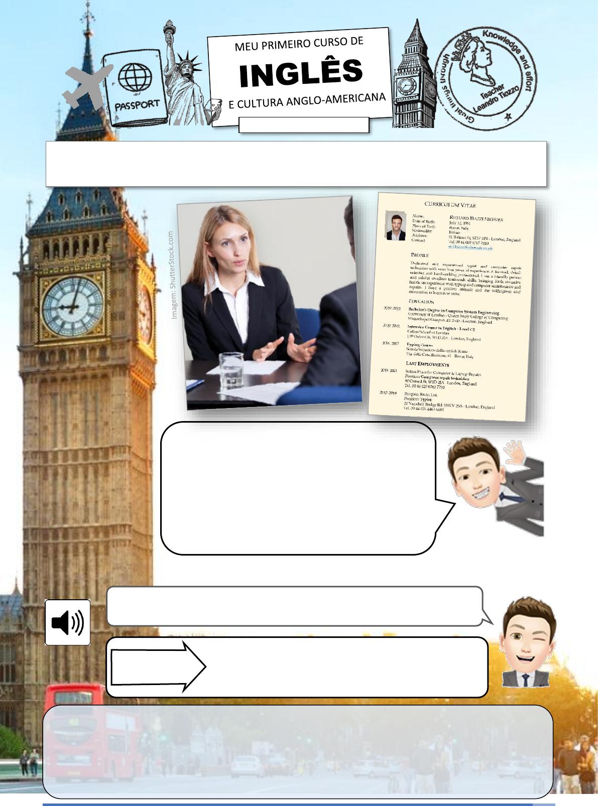 E-BOOK ISBN 978-65-00-20507-7 - MEU PRIMEIRO CURSO DE INGLÊS E CULTURA ANGLO-AMERICANA - LIVRO 3 © 2022 LEANDRO TIOZZO 23 1. LISTEN TO THE CONVERSATION AND COMPLETE THE GAPS. LESSON 14 – GETTING A JOB Lição 14 – Conseguindo um trabalho OUÇA O ÁUDIO 14.01 VERY GOOD, MR. NICHOLS, YOU DID VERY …………………………. ON YOUR TEST! I’M REALLY IMPRESSED WITH YOUR ………………………………………….! (Muito bem, Sr. Nichols, você foi muito bem no seu teste! Estou realmente impressionada com a sua habilidade!) THANK YOU, MS. COHEN! (Obrigado, Sra. Cohen!) MS. COHEN: RICHARD: Professor Leandro Tiozzo Im a g em : fa ceb o o k.co m Ouça a conversa entre o Richard e a Sra. Cohen. Complete o diálogo com as palavras faltantes conforme você ouvir no áudio ao lado. ■ABILITY (habilidade) ■WELL (bem) ■OF COURSE (claro) ■THINK (penso, acho) ■MONDAY (segunda-feira) ■MIGHT (pode) ■TOMORROW (amanhã) ■EVERYTHING (tudo) MISSING WORDS (Palavras faltantes) Olá, sou o professor Leandro, seu professor virtual! Vou ajudar você com os exercícios. Nesta lição, estudaremos o present perfect (presente perfeito). Durante as explicações, veremos que esse tempo verbal pode nos levar a cometer erros, pois é usado em situações que não existem em português. Faça os exercícios, grave os áudios solicitados e preste muita atenção. Bons estudos! E-BOOK ISBN 978-65-00-20507-7 - MEU PRIMEIRO CURSO DE INGLÊS E CULTURA ANGLO-AMERICANA - LIVRO 3 © 2022 LEANDRO TIOZZO 24 IF YOU REALLY WANT IT, THE JOB IS YOURS! (Se você realmente quiser, o trabalho é seu!) OH, YES, …………………………. . I REALLY WANT IT! (Ah, sim, claro. Quero muito!) WELL, LET ME TELL YOU MORE ABOUT THE WAY THINGS GO AROUD HERE. WE WORK HERE FROM MONDAY TO FRIDAY, FROM 9AM TO 5PM, WE DON’T WORK ……………………………. NOR DOES THE COMPANY PAY FOR IT, BUT SOME EXTRA WORK ………………..……. BE REQUESTED IN SPECIAL CASES. AH, FOR THE FIRST YEAR THE COMPANY WLL PAY YOU ONE MONTH SALARY FOR VACATION TIME. WHAT DO YOU SAY? (Bem, deixe-me informá-lo sobre como as coisas funcionam por aqui. Nós trabalhamos de segunda a sexta-feira, das 9h às 17h, não fazemos horas extras e nem a empresa paga por isso, mas alguns trabalhos extras podem ser solicitados em casos especiais. Ah, no primeiro ano, a empresa pagará a você um mês de férias. O que acha?) HMM, I ………….……. IT’S ALRIGHT. OK FOR ME! (Hmm, acho que está tudo certo. OK para mim!) I APPRECIATE THAT, MR. NICHOLS. I’M GOING TO SEND YOU FOR A MEDICAL CHECK-UP. IF ………………………......….……. IS ALRIGHT, YOU CAN START WORKING TOMORROW AT 9AM, OK? (Que bom, Sr. Nichols. O enviarei ao check-up médico. Se tudo estiver certo, você pode começar amanhã às 9h, OK?) SURE! I’LL BE HERE ……………………………………….. MORNING, MS. COHEN. THANK YOU VERY MUCH! (Claro! Estarei aqui amanhã de manhã, Sra. Cohen. Muito obrigado!) I’LL SEE YOU THEN, GOODBYE! (Nos vemos, então. Tchau!) MS. COHEN: RICHARD: MS. COHEN: RICHARD: MS. COHEN: RICHARD: MS. COHEN: OUÇA O ÁUDIO 14.02 OUÇA O ÁUDIO 14.03 E-BOOK ISBN 978-65-00-20507-7 - MEU PRIMEIRO CURSO DE INGLÊS E CULTURA ANGLO-AMERICANA - LIVRO 3 © 2022 LEANDRO TIOZZO 25 4. OFFICE OBJECTS (PART 1) USE THE WORDS BELOW TO LABEL THE OBJECTS. Ouça o áudio ao lado e depois grave a sua própria voz repetindo as palavras da caixa em inglês. Em seguida, utilize essas palavras para designar os objetos de escritório. OUÇA O ÁUDIO 14.04 GRAVE A SUA VOZ ► Desk ► Chair ► Computer ► Laptop ► Pencil ► Pencil sharpener ► Highlighter ► Hole puncher ► Network ► Wastebasket ► File ► Pen notebook mesa/escrivaninha computador ......................................... ............................................... ................................................. rede furador lixeira cadeira apontador .................................. ................................................ ................................. ................................. ..................................... caneta lápis marcador de texto arquivo .................................. ................................ ......................................... ...................................... Im agen s: Sh u tterSto ck.co m Im a g em : fa ceb o o k.co m E-BOOK ISBN 978-65-00-20507-7 - MEU PRIMEIRO CURSO DE INGLÊS E CULTURA ANGLO-AMERICANA - LIVRO 3 © 2022 LEANDRO TIOZZO 26 5. OFFICE OBJECTS (PART 2) USE THE WORDS BELOW TO LABEL THE OBJECTS. Ouça o áudio ao lado e depois grave a sua própria voz repetindo as palavras da caixa em inglês. Em seguida, utilize essas palavras para designar os objetos de escritório. OUÇA O ÁUDIO 14.05 GRAVE A SUA VOZ ► Folder ► Desktop organizer ► Drawer ► Label ► Water cooler ► Filing Cabinet ► Stamp ► Sticky note ► Stapler ► Eraser ► Paper clip ► Desk lamp rótulo/etiqueta clipe borracha nota adesiva .................................... .......................................... ......................................... ................................................... organizador de mesa gaveta carimbo grampeador .................................... .......................................... ......................................... .............................................. armário-arquivo refrigerador de água luminária de mesa pasta .......................................... .................................................. ......................................... .............................................. Im agen s: Sh u tterSto ck.co m Im a g em : fa ceb o o k.co m E-BOOK ISBN 978-65-00-20507-7- MEU PRIMEIRO CURSO DE INGLÊS E CULTURA ANGLO-AMERICANA - LIVRO 3 © 2022 LEANDRO TIOZZO 27 GRAMMAR: THE PRESENT PERFECT Im a g em : fa ceb o o k.co m E-BOOK ISBN 978-65-00-20507-7 - MEU PRIMEIRO CURSO DE INGLÊS E CULTURA ANGLO-AMERICANA - LIVRO 3 © 2022 LEANDRO