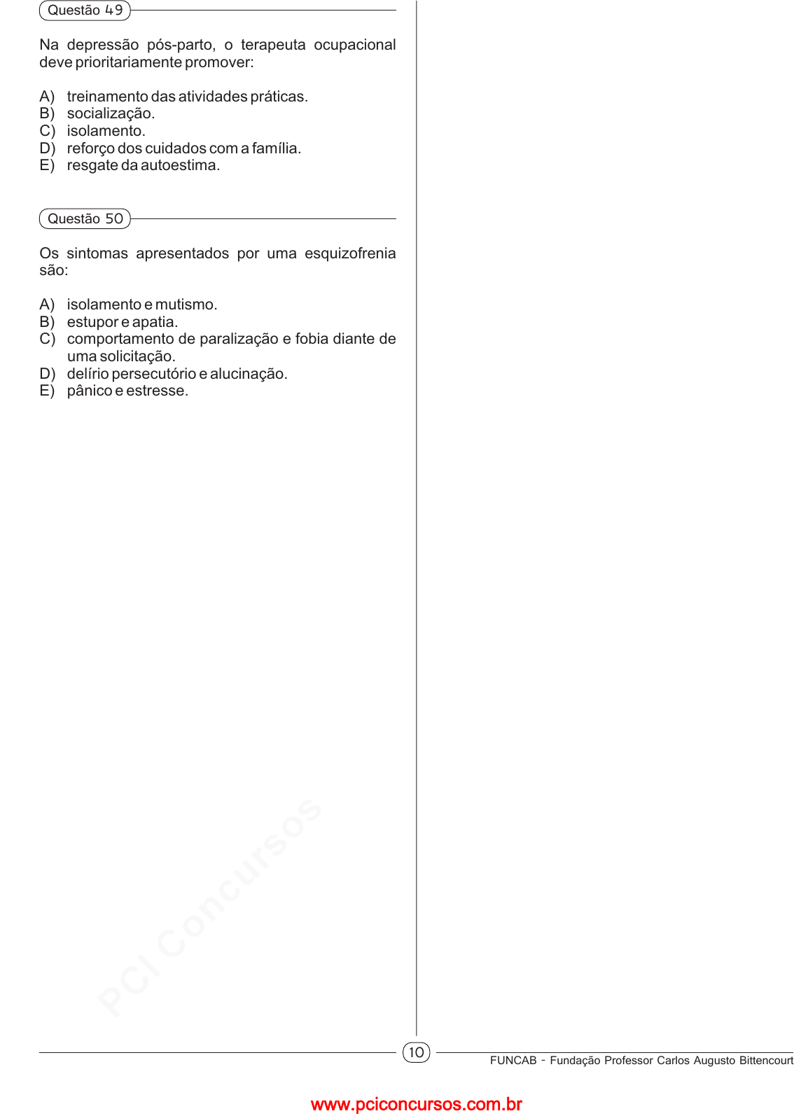 pcimarkpci MDAwMDowMDAwOjAwMDA6MDAwMDowMDAwOmZmZmY6ZDhlZTo3Njk1:U2F0LCAyOSBNYXIgMjAyNSAxNToyMDo1NSAtMDMwMA== www.pciconcursos.com.br 10 FUNCAB - Fundação Professor Carlos Augusto Bittencourt Na depressão pós-parto, o terapeuta ocupacional deve prioritariamente promover: A) treinamento das atividades práticas. B) socialização. C) isolamento. D) reforço dos cuidados com a família. E) resgate da autoestima. Questão 49 Os sintomas apresentados por uma esquizofrenia são: A) isolamento e mutismo. B) estupor e apatia. C) comportamento de paralização e fobia diante de uma solicitação. D) delírio persecutório e alucinação. E) pânico e estresse. Questão 50 www.pciconcursos.com.br 1 www.objetivas.com.br PORTUGUÊS Muitas bebidas esportivas usam glicose na composição, um açúcar simples. Essas bebidas são importantes para exercícios de longa duração, principalmente porque previnem a queda do glicogênio no fígado, que pode resultar em hipoglicemia. Glicogênio é carboidrato armazenado. Se o estoque diminuir, haverá menos energia para quem está realizando a atividade física. A pesquisa realizada na Universidade de Bath, na Inglaterra, apontou que a ingestão de carboidratos tanto na forma de glicose como sacarose (o açúcar comum), cumpre a função de manter os níveis de glicogênio constantes. Só que a glicose pode irritar o intestino e prejudicar seu desempenho físico. As pessoas que fizeram parte do estudo disseram que o exercício ficava mais fácil depois de tomarem bebidas com sacarose. O líder do estudo, Javier Gonzales, disse: “Isso sugere que, se a sua meta é maximizar a disponibilidade de carboidratos, a sacarose provavelmente é uma melhor opção que a glicose”. A grande diferença entre os dois carboidratos é que cada molécula de sacarose é composta por uma de glicose e uma de frutose unidas. Segundo os resultados da pesquisa, combinar diferentes fontes de açúcares aumenta a velocidade com que elas são absorvidas no intestino. A sacarose, composta por duas moléculas, sai na frente da glicose, formada por apenas uma. Se a sua intenção é otimizar a performance de um exercício que vai durar mais de duas horas e meia, os autores do estudo recomendam o consumo de 90g de açúcar por hora - cada colher de chá rasa de açúcar deve ser diluída em 100mL de água. http://super.abril.com.br/ciencia/bebidas-isotonicas-... - adaptado. 1) Analisar os itens abaixo quanto ao texto: I - Bebidas esportivas que usam glicose na composição são importantes na prática de atividades físicas porque previnem a queda do glicogênio no fígado. II - Segundo o estudo, o exercício tornava-se mais fácil com a ingestão de bebidas que contivessem sacarose. a) Os itens I e II estão corretos. b) Os itens I e II estão incorretos. c) Somente o item I está correto. d) Somente o item II está correto. 2) Sobre o texto, é INCORRETO afirmar que: a) Cada molécula de sacarose é constituída por uma de glicose e uma de frutose. b) A glicose é formada por apenas uma molécula. c) As bebidas que contêm glicose na composição ajudam a manter estáveis os níveis de glicogênio no fígado, ou seja, previnem a queda do glicogênio no fígado, evitando hipoglicemia. d) A ingestão de sacarose contribui para irritar o intestino e prejudicar o desempenho físico. 3) Sobre o emprego do acento indicativo de crase, analisar a sentença abaixo: A festa de confraternização dos funcionários será realizada à qualquer tempo (1ª parte). Reunir-nos-emos à tempo de combinar o presente (2ª parte). A sentença está: a) Totalmente correta. b) Correta somente em sua 1ª parte. c) Correta somente em sua 2ª parte. d) Totalmente incorreta. 4) Quanto à colocação dos pronomes, analisar os itens abaixo: I - Frequentemente sujeita-se a humilhações. II - Há que se considerar sua situação financeira. III - Estabelecem-se regras para que sejam cumpridas. Está(ão) CORRETO(S): a) Somente o item I. b) Somente o item III. c) Somente os itens II e III. d) Todos os itens. 5) Assinalar a alternativa que preenche as lacunas abaixo CORRETAMENTE: Não assistiu _____ jogo? Não me lembro ____ seu nome. Todos os candidatos devem obedecer _____ regulamento. a) o - o - o b) ao - do - ao c) o - do - o d) ao - o - ao www.pciconcursos.com.br http://www.ncbi.nlm.nih.gov/pubmedhealth/behindtheheadlines/news/2015-11-30-sugar-and-water-as-good-as-a-sports-drink-says-study/ Médico Clínico Geral_M2 até 30