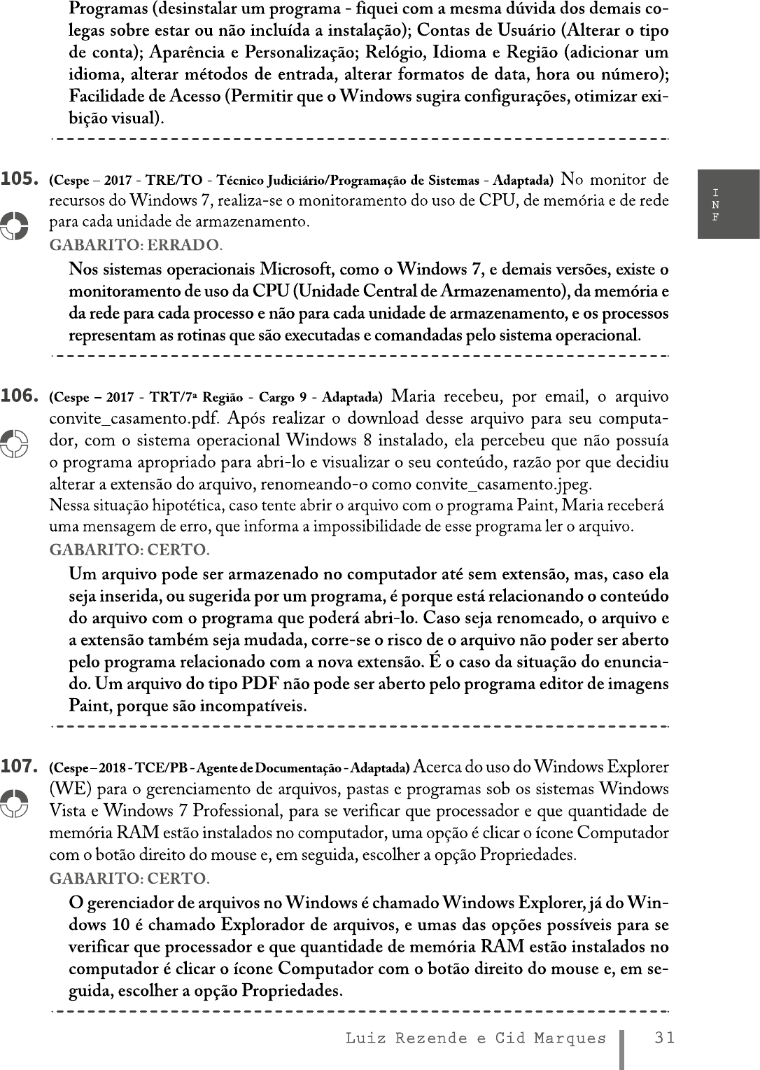 Programas (desinstalar um programa fiquei com a mesma dúvida dos demais co- legas sobre estar ou não incluída a instalação); Contas de Usuário (Alterar o tipo de conta); Aparência e Personalização; Relógio, Idioma e Região (adicionar um idioma, alterar métodos de entrada, alterar formatos de data, hora ou número); Facilidade de Acesso (Permitir que o Windows sugira configurações, otimizar exi- bição visual). 105. (Cespe 2017 TRE/TO Técnico Judiciário/Programação de Sistemas Adaptada) No monitor de I recursos do Windows 7, realiza-se o monitoramento do uso de CPU, de memória e de rede N para cada unidade de armazenamento. F GABARITO: ERRADO. Nos sistemas operacionais Microsoft, como o Windows 7, e demais versões, existe o monitoramento de uso da CPU (Unidade Central de Armazenamento), da memória e da rede para cada processo e não para cada unidade de armazenamento, e os processos representam as rotinas que são executadas e comandadas pelo sistema operacional. 106. (Cespe 2017 Região Cargo 9 Adaptada) Maria recebeu, por email, o arquivo convite_casamento.pdf. Após realizar o download desse arquivo para seu computa- dor, com o sistema operacional Windows 8 instalado, ela percebeu que não possuía o programa apropriado para abri-lo e visualizar o seu conteúdo, razão por que decidiu alterar a extensão do arquivo, renomeando-o como convite_casamento.jpeg. Nessa situação hipotética, caso tente abrir arquivo com o programa Paint, Maria receberá uma mensagem de erro, que informa a impossibilidade de esse programa ler o arquivo. GABARITO: CERTO. Um arquivo pode ser armazenado no computador até sem extensão, mas, caso ela seja inserida, ou sugerida por um programa, é porque está relacionando o conteúdo do arquivo com o programa que poderá abri-lo. Caso seja renomeado, o arquivo e a extensão também seja mudada, corre-se o risco de o arquivo não poder ser aberto pelo programa relacionado com a nova extensão. É o caso da situação do enuncia- do. Um arquivo do tipo PDF não pode ser aberto pelo programa editor de imagens Paint, porque são incompatíveis. 107. (Cespe-2018-TCE/PB-Agente de Acerca do uso do Windows Explorer (WE) para o gerenciamento de arquivos, pastas e programas sob os sistemas Windows Vista e Windows 7 Professional, para se verificar que processador e que quantidade de memória RAM estão instalados no computador, uma opção é clicar o ícone Computador com o botão direito do mouse e, em seguida, escolher a opção Propriedades. GABARITO: CERTO. gerenciador de arquivos no Windows é chamado Windows Explorer, já do Win- dows 10 é chamado Explorador de arquivos, e umas das opções possíveis para se verificar que processador e que quantidade de memória RAM estão instalados no computador é clicar o ícone Computador com o botão direito do mouse e, em se- guida, escolher a opção Propriedades. Luiz Rezende e Cid Marques 31