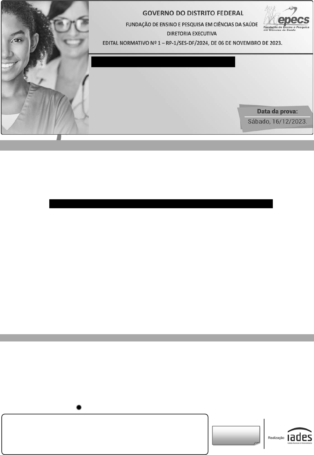 PROVA APLICADA Tipo “U” PROGRAMA 163 - Multiprofissional em Terapia Intensiva ENFERMAGEM I N S T R U Ç Õ E S • Você recebeu do fiscal: o 1 (um) caderno de questões da prova objetiva contendo 100 (cem) questões de múltipla escolha, com 4 (quatro) alternativas de resposta cada uma e apenas 1 (uma) alternativa correta; e o 1 (uma) folha de respostas personalizada da prova objetiva. • Quando autorizado pelo fiscal do IADES, no momento da identificação, escreva no espaço apropriado da folha de respostas da prova objetiva, com a sua caligrafia usual, a seguinte frase: Nada é permanente no mundo. • Verifique se estão corretas a numeração das questões e a paginação do caderno de questões, bem como a codificação da folha de respostas da prova objetiva. • Você dispõe de 4 (quatro) horas para fazer a prova objetiva e deve controlar o tempo, pois não haverá prorrogação desse prazo. Esse tempo inclui a marcação da folha de respostas da prova objetiva. • Somente 1 (uma) hora após o início da prova, você poderá entregar sua folha de respostas da prova objetiva e o caderno de questões, bem como retirar-se da sala. • Somente quando faltarem 30 (trinta) minutos para o término do tempo fixado para realização da prova, você poderá deixar o local levando consigo o caderno de questões. • Após o término da prova, entregue ao fiscal do IADES a folha de respostas da prova objetiva, devidamente assinada. • Deixe sobre a carteira apenas o documento de identidade e a caneta esferográfica de tinta preta, fabricada com material transparente. • Não é permitida a utilização de nenhum aparelho eletrônico ou de comunicação. • Não é permitida a consulta a livros, dicionários, apontamentos e (ou) apostilas. • Você somente poderá sair e retornar à sala de aplicação da prova na companhia de um fiscal do IADES. • Não será permitida a utilização de lápis em nenhuma etapa da prova. • Os três últimos candidatos só poderão deixar a sala após entregarem suas folhas de respostas e assinarem o termo de fechamento do envelope, no qual serão acondicionadas as folhas de respostas da sala. I N S T R U Ç Õ E S P A R A A P R O V A O B J E T I V A • Verifique se os seus dados estão corretos na folha de respostas da prova objetiva. Caso haja algum dado incorreto, comunique ao fiscal. • Leia atentamente cada questão e assinale, na folha de respostas da prova objetiva, uma única alternativa. • A folha de respostas da prova objetiva não pode ser dobrada, amassada, rasurada ou manchada e nem pode conter nenhum registro fora dos locais destinados às respostas. • O candidato deverá transcrever, com caneta esferográfica de tinta preta, as respostas da prova objetiva para a folha de respostas. • A maneira correta de assinalar a alternativa na folha de respostas da prova objetiva é cobrir, fortemente, com caneta esferográfica de tinta preta, o espaço a ela correspondente. • Marque as respostas assim: PROVA APLICADA PROCESSO SELETIVO RP-1/SES-DF/2024 163 - MULTIPROFISSIONAL EM TERAPIA INTENSIVA ENFERMAGEM – TIPO “U” PÁGINA 2/19 P R O V A O B J E T I V A ENFERMAGEM Questões de 1 a 100 QUESTÃO 1 _______________________ O músculo deltoide origina-se na margem inferior da crista da espinha da escápula, margem lateral do acrômio e margem anterior do terço lateral da clavícula e insere-se na tuberosidade para o músculo deltoide no úmero. Assinale a alternativa que indica a função do músculo deltoide. (A) Abduzir o braço com discreta rotação lateral. (B) Rodar lateralmente, aduzir fracamente e estender o braço. (C) Levantar e rodar a escápula durante abdução horizontal do úmero; suas fibras médias retraem, e as fibras mais baixas abaixam a escápula. (D) Abduzir o braço além dos 15° iniciais determinados pelo supraespinal (principal abdutor do braço); suas fibras claviculares auxiliam na flexão do braço, as fibras posteriores auxiliam na extensão. QUESTÃO 2 _______________________ O fêmur é um osso par, longo, o maior e o mais forte osso do corpo humano. Localiza-se na coxa, e seu tamanho é referente a um terço do tamanho do indivíduo adulto. Assinale a alternativa que corresponde à estrutura da epífise distal do fêmur. (A) Fóvea (B) Trocanter maior (C) Côndilo femoral (D) Trocanter menor QUESTÃO 3 _______________________ Disponível em: . Acesso em: 8 dez. 2023. O esqueleto do pé, assim como o da mão, constitui-se de ossos curtos, articulados entre si, chamados tarsais e de ossos longos, que são os metatarsais e as falanges, assim classificados, apesar de seu tamanho reduzido. As articulações do pé são quase todas do tipo sinovial, as quais conferem, dessa forma, mobilidade suficiente para se adaptar a forças longitudinais aplicadas sobre o pé. Nesse sentido, assinale a alternativa que corresponde aos ossos identificados pelos números na imagem. (A) I – Cuboide; II – Navicular; III – Talus. (B) I – Cuboide; II Talus; III – Navicular. (C) I – Talus; II – Navicular; III – Cuboide. (D) I – Talus; II – Cuboide; III – Navicular. QUESTÃO 4 ________________________ Nas sindesmoses, o tecido conjuntivo fibroso também se interpõe nas suturas, mas não ocorre entre ossos do crânio. É exemplo desse tipo de articulação a sindesmose (A) isquiotibial. (B) femorocrural. (C) radioulnar. (D) esternoclavicular. QUESTÃO 5 ________________________ Os leucócitos são elementos figurados do sangue, que estão envolvidos no sistema de defesa do organismo contra doenças e infecções. Por meio de fagocitose, eles defendem os tecidos contra a invasão de organismos ou de substâncias estranhas. Removem, também, os restos decorrentes da morte ou de ferimentos celulares. Acerca dos leucócitos, assinale a alternativa correta. (A) São células grandes que possuem um único núcleo, formado por monoblastos. São capazes de entrar no tecido conjuntivo frouxo, onde se desenvolve