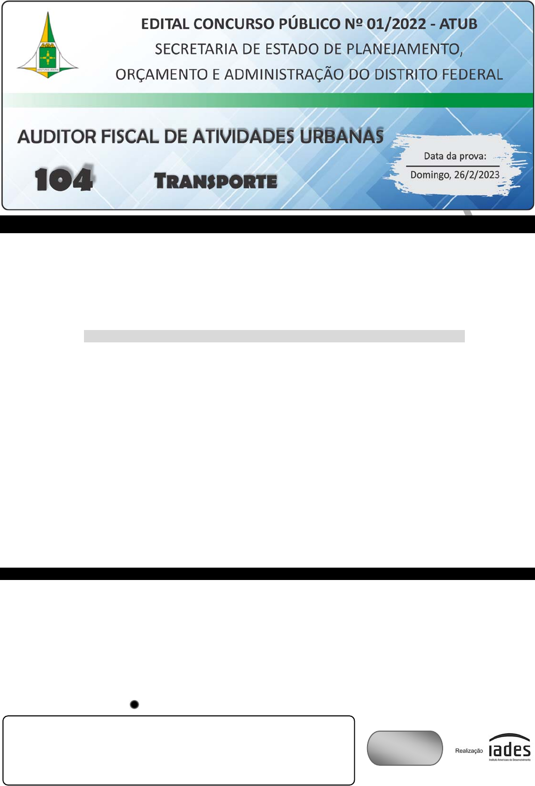 PROVA APLIC ADA Tipo “A” I N S T R U Ç Õ E S Você receberá do fiscal: o 1 (um) caderno de questões das provas objetiva e discursiva contendo 60 (sessenta) questões de múltipla escolha, com 5 (cinco) alternativas de resposta cada uma e apenas 1 (uma) alternativa correta, e 1 (uma) questão discursiva; o 1 (uma) folha de respostas personalizada da prova objetiva; e o 1 (uma) folha de texto definitivo da prova discursiva. Quando autorizado pelo fiscal do IADES, no momento da identificação, escreva no espaço apropriado da folha de respostas da prova objetiva, com a sua caligrafia usual, a seguinte frase: Otimismo é esperar pelo melhor. Verifique se estão corretas a numeração das questões e a paginação do caderno de questões, bem como a codificação da folha de respostas da prova objetiva e da folha de texto definitivo da prova discursiva. Você dispõe de 4 (quatro) horas e 30 (minutos) para fazer as provas objetiva e discursiva e deve controlar o tempo, pois não haverá prorrogação desse prazo. Esse tempo inclui a marcação da folha de respostas da prova objetiva e o preenchimento da folha de texto definitivo da prova discursiva. Somente 1 (uma) hora após o início da prova, você poderá entregar sua folha de respostas da prova objetiva, a folha de texto definitivo da prova discursiva e o caderno de questões, bem como retirar-se da sala. Você somente poderá retirar-se do local de aplicação das provas levando o caderno de questões quando faltar 1 (uma) hora para o final do tempo destinado à realização das provas objetiva e discursiva. Após o término da prova, entregue ao fiscal do IADES a folha de respostas da prova objetiva, devidamente assinada, e a folha de texto definitivo da prova discursiva. Deixe sobre a carteira apenas o documento de identidade e a caneta esferográfica de tinta preta, fabricada com material transparente. Não é permitida a utilização de nenhum aparelho eletrônico ou de comunicação. Não é permitida a consulta a livros, dicionários, apontamentos e (ou) apostilas. Você somente poderá sair e retornar à sala de aplicação de provas na companhia de um fiscal do IADES. Não será permitida a utilização de lápis em nenhuma etapa da prova. I N S T R U Ç Õ E S P A R A A S P R O V A S O B J E T I V A E D I S C U R S I V A Verifique se os seus dados estão corretos na folha de respostas da prova objetiva e na folha de texto definitivo da prova discursiva. Caso haja algum dado incorreto, comunique ao fiscal. Leia atentamente cada questão e assinale, na folha de respostas da prova objetiva, uma única alternativa. A folha de respostas da prova objetiva e a folha de texto definitivo da prova discursiva não podem ser dobradas, amassadas, rasuradas ou manchadas e nem podem conter nenhum registro fora dos locais destinados às respostas. O candidato deverá transcrever, com caneta esferográfica de tinta preta, as respostas da prova objetiva para a folha de respostas e o texto definitivo da prova discursiva para a folha de texto definitivo. A maneira correta de assinalar a alternativa na folha de respostas da prova objetiva é cobrir, fortemente, com caneta esferográfica de tinta preta, o espaço a ela correspondente. Marque as respostas assim: PROVA APLIC ADA PÁGINA 2/17 AUDITOR FISCAL DE ATIVIDADES URBANAS 104 – TRANSPORTE – TIPO “A” CONCURSO PÚBLICO – ATUB P R O V A O B J E T I V A CONHECIMENTOS GERAIS Questões de 1 a 25 LÍNGUA PORTUGUESA E REDAÇÃO OFICIAL Questões de 1 a 8 QUESTÃO 1 _______________________ A importância da acessibilidade para a inclusão de pessoas com deficiência ou mobilidade reduzida Será que podemos falar em inclusão e, principalmente, em igualdade, se um usuário de cadeira de rodas necessita ser carregado por um terceiro para adentrar um local para tomar uma vacina H1N1 porque o local possui escadas? E se ele precisa da ajuda de um estranho para que possa adentrar um transporte público que não está acessível? E se uma pessoa com deficiência visual necessita ser conduzida pelo braço de estranhos para caminhar pelas vias públicas ou por outros espaços públicos que se encontram em situações que impeçam a livre e segura circulação? E se as calçadas estão mal cuidadas ou com buracos? As pessoas que necessitam do auxílio de outras para alcançar seus objetivos não vivenciam a essência do conceito de acessibilidade universal em nenhum momento. Por isso, só há que se falar em inclusão das pessoas com deficiência ou mobilidade reduzida se houver acessibilidade com autonomia e independência. Disponível em: . Acesso em: 29 jan. 2023, com adaptações. De acordo com o texto, assinale a alternativa correta. (A) As situações hipotéticas enfrentadas, respectivamente, pelo “usuário de cadeira de rodas” e pela “pessoa com deficiência visual” servem para ilustrar casos em que não ocorre a acessibilidade com autonomia e independência. (B) A inclusão das pessoas com deficiência ou mobilidade reduzida pode acontecer independentemente da forma como elas conseguem acessar um transporte público ou circular pelas vias públicas. (C) No texto, pressupõe-se que a inclusão acontece, por exemplo, quando um deficiente visual depende de outra pessoa para se locomover por uma calçada com buracos. (D) A falta de acessibilidade nos espaços públicos afeta mais os cadeirantes do que as pessoas com deficiência visual. (E) O conceito de “acessibilidade universal” abrange apenas as pessoas com deficiência. Área livre QUESTÃO 2 ________________________ Alunos da rede pública aprendem sobre ocupação do solo e descarte de lixo Programa DF Legal nas Escolas promove a cidadania entre estudantes e também orienta sobre edificações ilegais, entre outros assuntos Com cerca de 5 mil alunos já atendidos na rede pública, o programa DF Legal nas Escolas será retomado em 2023 para promover cidadania e noções de como preservar a ordem urbanística do Distrito Fed