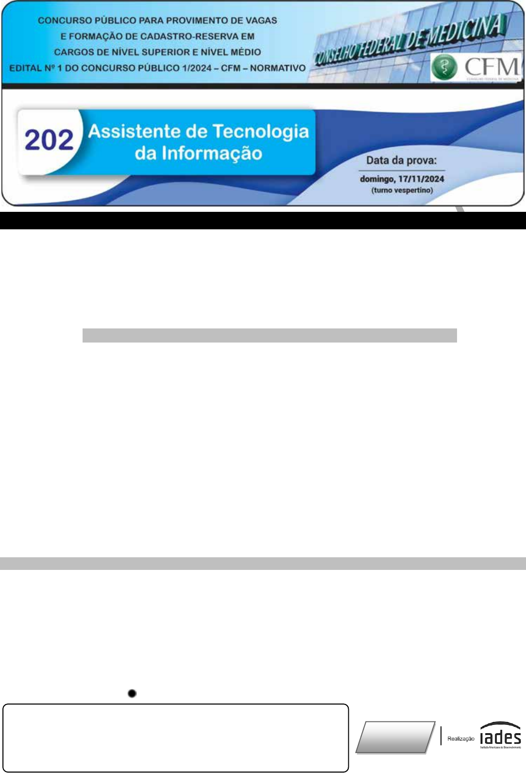 PROVA APLIC ADA Tipo “A” I N S T R U Ç Õ E S • Você recebeu do fiscal: o 1 (um) caderno contendo as provas objetiva e redação. A prova objetiva é composta por 50 (cinquenta) questões de múltipla escolha, com 5 (cinco) alternativas de resposta cada uma e apenas 1 (uma) alternativa correta; o 1 (uma) folha de respostas personalizada da prova objetiva; e o 1 (uma) folha de texto definitivo da prova de redação. • Quando autorizado pelo fiscal do IADES, no momento da identificação, escreva no espaço apropriado da folha de respostas da prova objetiva, com a sua caligrafia usual, a seguinte frase: Então vamos construí-la! • Verifique se estão corretas a numeração das questões e a paginação do caderno de provas, bem como a codificação da folha de respostas da prova objetiva e da folha de texto definitivo da prova de redação. • Você dispõe de 4 (quatro) horas para fazer as provas objetiva e redação e deve controlar o tempo, pois não haverá prorrogação desse prazo. Esse tempo inclui a marcação da folha de respostas da prova objetiva e o preenchimento da folha de texto definitivo da prova de redação. • Somente 1 (uma) hora após o início das provas, você poderá entregar sua folha de respostas da prova objetiva, a folha de texto definitivo da prova de redação, o caderno de provas e retirar-se da sala. • Você poderá deixar o local levando consigo o caderno de provas somente quando faltarem 30 (trinta) minutos para o término do tempo fixado para a realização das provas. • Após o término das provas, entregue ao fiscal do IADES a folha de respostas da prova objetiva, devidamente assinada, e a folha de texto definitivo da prova de redação. • Deixe sobre a carteira apenas o documento de identidade e a caneta esferográfica de tinta preta, fabricada com material transparente. • Não é permitida a utilização de nenhum aparelho eletrônico ou de comunicação. • Não é permitida a consulta a livros, dicionários, apontamentos e (ou) apostilas. • Você somente poderá sair e retornar à sala de aplicação das provas na companhia de um fiscal do IADES. • Não será permitida a utilização de lápis em nenhum momento das provas. I N S T R U Ç Õ E S P A R A A S P R O V A S O B J E T I V A E P A R A A R E D A Ç Ã O • Verifique se os seus dados estão corretos na folha de respostas da prova objetiva e na folha de texto definitivo da redação. Caso haja algum dado incorreto, comunique ao fiscal. • Leia atentamente cada questão e assinale, na folha de respostas da prova objetiva, uma única alternativa. • A folha de respostas da prova objetiva e a folha de texto definitivo da redação não podem ser dobradas, amassadas, rasuradas ou manchadas e nem podem conter nenhum registro fora dos locais destinados às respostas. • O candidato deverá transcrever, com caneta esferográfica de tinta preta, as respostas da prova objetiva para a folha de respostas e o texto definitivo da redação para a folha de texto definitivo. • A maneira correta de assinalar a alternativa na folha de respostas da prova objetiva é cobrir, fortemente, com caneta esferográfica de tinta preta, o espaço a ela correspondente. • Marque as respostas assim: PROVA APLIC ADA CONCURSO PÚBLICO CONSELHO FEDERAL DE MEDICINA – CFM 202 – ASSISTENTE DE TECNOLOGIA DA INFORMAÇÃO TIPO “A” PÁGINA 2/13 P R O V A O B J E T I V A CONHECIMENTOS GERAIS Questões de 1 a 20 LÍNGUA PORTUGUESA E REDAÇÃO OFICIAL Questões de 1 a 8 QUESTÃO 1 Conselho Federal de Medicina O Conselho Federal de Medicina (CFM) foi fundado, em 1951, por uma necessidade perceptível: fiscalizar e normatizar a prática médica no Brasil. Com sede em Brasília, busca exercer o seu ofício de maneira transparente, ética e profissional. Porém, com a constante transformação da categoria médica no País, novos desafios foram surgindo e, com isso, a necessidade de ir além. A autarquia desenvolveu novas competências e aprimorou sua gestão, impactando de forma positiva a qualidade do serviço médico prestado à população. Disponível em: . Acesso em: 20 set. 2024, com adaptações. Considerando os mecanismos responsáveis pela coesão do texto, assinale a alternativa correta. (A) O conectivo sublinhado no trecho “por uma necessidade perceptível” introduz a consequência da ação mencionada na oração anterior. (B) A forma verbal “busca” e o pronome “seu” retomam o termo “sede”. (C) A construção “com a” poderia ser substituída pela locução em razão da, pois a relação de sentido original seria mantida. (D) A redação A autarquia não só desenvolveu novas competências, mas também aprimorou sua gestão estabelece uma relação de sentido oposta à que é expressa no trecho “A autarquia desenvolveu novas competências e aprimorou sua gestão”. (E) Caso a estrutura “prestado à população” fosse substituída pela oração que ela presta à população, o último período ficaria sem coesão. QUESTÃO 2 A importância dos Conselhos de Medicina A população ganha com o trabalho dos Conselhos de Medicina, pois recebe deles o apoio na luta por melhor qualidade no atendimento e por ampliação no acesso aos diferentes serviços. Por outro lado, é esse sistema que estabelece os critérios para uma relação médico-paciente equilibrada e com respeito às autonomias para ambas as partes. Além disso, cabe à autarquia validar os procedimentos médicos com base na sua segurança e eficácia, o que significa, em outras palavras, reduzir os riscos de sequelas e de mortes. GALLO. José Hiran da Silva. Disponível em: . Acesso em: 20 set. 2024, com adaptações. A informação veiculada pelo título é justificada (A) apenas no primeiro período do texto. (B) apenas no segundo período do texto. (C) apenas nos dois primeiros períodos do texto. (D) apenas nos dois últimos períodos do texto. (E) em todos os períodos do texto. QUESTÃO 3 assisten