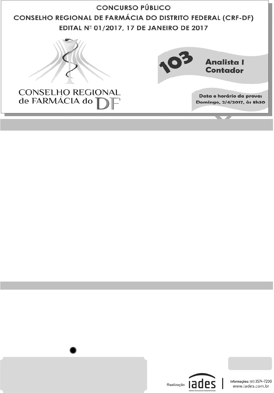 PROVA A PLIC ADA PROVA A PLIC ADA TIPO “A” I N S T R U Ç Õ E S • Você receberá do fiscal: o um caderno de questões da prova objetiva e discursiva contendo 50 (cinquenta) questões de múltipla escolha, com 5 (cinco) alternativas de resposta cada uma, e apenas uma alternativa correta, e 1 (uma) questão discursiva; o um cartão ótico de respostas personalizado; e, o uma folha de resposta da prova discursiva. • Quando autorizado pelo fiscal do IADES, no momento da identificação, escreva no espaço apropriado do cartão ótico de respostas, com a sua caligrafia usual, a seguinte frase: O jardim do semelhante. • Verifique se a numeração das questões, a paginação do caderno de questões e a codificação do cartão ótico de respostas e da folha de resposta da prova discursiva estão corretas. • Você dispõe de 4 (quatro) horas para fazer a prova objetiva e discursiva, devendo controlar o tempo, pois não haverá prorrogação desse prazo. Esse tempo inclui a marcação do cartão ótico de respostas e o preenchimento da folha de resposta da prova discursiva. • Somente após decorrida 1 (uma) hora do início da prova, você poderá entregar seu cartão ótico de respostas, a folha de resposta da prova discursiva e o caderno de provas e retirar-se da sala. • Somente será permitido levar o caderno de questões da prova objetiva e discursiva após 3 (três) horas e 30 (trinta) minutos do início da prova. • Após o término da prova, entregue ao fiscal do IADES a folha de resposta da prova discursiva e o cartão ótico de respostas devidamente assinado. • Deixe sobre a carteira apenas o documento de identidade e a caneta esferográfica de tinta preta, fabricada de material transparente. • Não é permitida a utilização de qualquer aparelho eletrônico ou de comunicação. • Não é permitida a consulta a livros, dicionários, apontamentos e apostilas. • Você somente poderá sair e retornar à sala de aplicação de provas na companhia de um fiscal do IADES. • Não será permitida a utilização de lápis em nenhuma etapa da prova. I NSTRUÇÕES PARA A PROVA OBJETI VA E D I SCURSI VA • Verifique se os seus dados estão corretos no cartão ótico de respostas da prova objetiva e na folha de resposta da prova discursiva. Caso haja algum dado incorreto, escreva apenas no(s) campo(s) a ser(em) corrigido(s), conforme instruções no cartão ótico de respostas. • Leia atentamente cada questão e assinale, no cartão ótico de respostas, uma única alternativa. • O cartão ótico de respostas e a folha de resposta da prova discursiva não podem ser dobrados, amassados, rasurados ou manchados e nem podem conter nenhum registro fora dos locais destinados às respostas. • O candidato deverá transcrever, com caneta esferográfica de tinta preta, as respostas da prova objetiva para o cartão ótico de respostas, e o texto definitivo da prova discursiva para a respectiva folha de resposta. • A maneira correta de assinalar a alternativa no cartão ótico de respostas é cobrir, fortemente, com caneta esferográfica de tinta preta, o espaço a ela correspondente. • Marque as respostas assim: PROVA A PLIC ADA PROVA A PLIC ADA CONCURSO PÚBLICO – CRF-DF 103 – ANALISTA I – CONTADOR – TIPO “A” PÁGINA 2/13 CONHECIMENTOS BÁSICOS Questões de 1 a 25 LÍNGUA PORTUGUESA Questões de 1 a 5 Texto 1 para responder as questões 1 e 2. 1 4 7 10 11 A era radiofônica conquista a indústria farmacêutica Os anos 1930 marcam a ascensão do rádio como veículo de propaganda no Brasil. Os laboratórios não perderam a oportunidade, investindo verbas cada vez mais polpudas nas publicidades de remédios. Unindo o útil ao agradável, começaram a pagar para que seus anúncios, tal e qual impressos, fossem lidos ao vivo no rádio entre um programa e outro. Em um segundo momento, quando entrou em cena a moda dos jingles, os reclames vinham em tons já mais criativos e elaborados especialmente para esse meio de comunicação – e melhor, cantados pelos próprios ídolos da era radiofônica. Disponível em: . Acesso em: 20 jan. 2017. QUESTÃO 1 _______________________ Considerando as informações e as sequências discursivas do texto, é correto afirmar que (A) a mensagem expressa pelo título, relacionada ao conteúdo de todo o parágrafo, indica que o principal anseio do rádio, na respectiva fase de maior popularidade, era atrair os anunciantes de remédios. (B) o rádio, assim que chega ao Brasil nos anos 1930, transforma-se no mais importante veículo de propaganda, por isso desperta o interesse dos laboratórios. (C) o autor, com o propósito principal de analisar a qualidade dos anúncios de remédio na era radiofônica do Brasil, utiliza-se predominantemente da dissertação, pois, por meio da relação de causa e consequência, defende a própria opinião a respeito do papel do rádio como importante veículo de propaganda. (D) os primeiros anúncios pagos pelos laboratórios, durante a era radiofônica no Brasil, consistiam na simples leitura integral e ao vivo no rádio do texto, que também serviria para a divulgação impressa dos remédios. (E) a publicidade de remédios no rádio só passou a chamar a atenção do público quando os anúncios passaram a ser cantados pelo próprios ídolos da era radiofônica. QUESTÃO 2 _______________________ De acordo com a norma-padrão e as questões gramaticais que envolvem o texto, assinale a alternativa correta. (A) Se o termo sublinhado no trecho “investindo verbas cada vez mais polpudas nas publicidades de remédios” (linhas 3 e 4) fosse substituído pelo vocábulo vultosas, o sentido original do texto estará preservado. (B) O período “Os laboratórios não perderam a oportunidade, investindo verbas cada vez mais polpudas nas publicidades de remédios.” (linhas de 2 a 4) não poderia ser substituído corretamente pela redação Os laboratórios não perderam a oportunidade: investiram verbas c