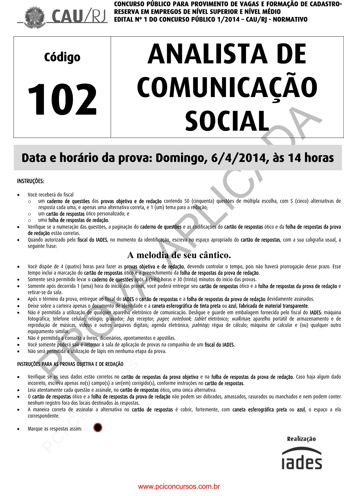 pcimarkpci MDAwMDowMDAwOjAwMDA6MDAwMDowMDAwOmZmZmY6OTU0ZTpiOTcy:U2F0LCAyOSBNYXIgMjAyNSAwMjoxMTo1OSAtMDMwMA== www.pciconcursos.com.br PROVA A PLIC ADA CONCURSO PÚBLICO PARA PROVIMENTO DE VAGAS E FORMAÇÃO DE CADASTRO- RESERVA EM EMPREGOS DE NÍVEL SUPERIOR E NÍVEL MÉDIO EDITAL Nº 1 DO CONCURSO PÚBLICO 1/2014 – CAU/RJ - NORMATIVO Código 102 ANALISTA DE COMUNICAÇÃO SOCIAL Data e horário da prova: Domingo, 6/4/2014, às 14 horas INSTRUÇÕES: • Você receberá do fiscal o um caderno de questões das provas objetiva e de redação contendo 50 (cinquenta) questões de múltipla escolha, com 5 (cinco) alternativas de resposta cada uma, e apenas uma alternativa correta, e 1 (um) tema para a redação; o um cartão de respostas ótico personalizado; e o uma folha de respostas de redação. • Verifique se a numeração das questões, a paginação do caderno de questões e as codificações do cartão de respostas ótico e da folha de respostas da prova de redação estão corretas. • Quando autorizado pelo fiscal do IADES, no momento da identificação, escreva no espaço apropriado do cartão de respostas, com a sua caligrafia usual, a seguinte frase: A melodia de seu cântico. • Você dispõe de 4 (quatro) horas para fazer as provas objetiva e de redação, devendo controlar o tempo, pois não haverá prorrogação desse prazo. Esse tempo inclui a marcação do cartão de respostas ótico e o preenchimento da folha de respostas da prova de redação. • Somente será permitido levar o caderno de questões após 3 (três) horas e 30 (trinta) minutos do início das provas. • Somente após decorrida 1 (uma) hora do início das provas, você poderá entregar seu cartão de respostas ótico e a folha de respostas da prova de redação e retirar-se da sala. • Após o término da prova, entregue ao fiscal do IADES o cartão de respostas e a folha de respostas da prova de redação devidamente assinados. • Deixe sobre a carteira apenas o documento de identidade e a caneta esferográfica de tinta preta ou azul, fabricada de material transparente. • Não é permitida a utilização de qualquer aparelho eletrônico de comunicação. Desligue e guarde em embalagem fornecida pelo fiscal do IADES: máquina fotográfica; telefone celular; relógio; gravador; bip; receptor; pager; notebook; tablet eletrônico; walkman; aparelho portátil de armazenamento e de reprodução de músicas, vídeos e outros arquivos digitais; agenda eletrônica; palmtop; régua de cálculo; máquina de calcular e (ou) qualquer outro equipamento similar. • Não é permitida a consulta a livros, dicionários, apontamentos e apostilas. • Você somente poderá sair e retornar à sala de aplicação de provas na companhia de um fiscal do IADES. • Não será permitida a utilização de lápis em nenhuma etapa da prova. INSTRUÇÕES PARA AS PROVAS OBJETIVA E DE REDAÇÃO • Verifique se os seus dados estão corretos no cartão de respostas da prova objetiva e na folha de respostas da prova de redação. Caso haja algum dado incorreto, escreva apenas no(s) campo(s) a ser(em) corrigido(s), conforme instruções no cartão de respostas. • Leia atentamente cada questão e assinale, no cartão de respostas ótico, uma única alternativa. • O cartão de respostas ótico e a folha de respostas da prova de redação não podem ser dobrados, amassados, rasurados ou manchados e nem podem conter nenhum registro fora dos locais destinados às respostas. • A maneira correta de assinalar a alternativa no cartão de respostas é cobrir, fortemente, com caneta esferográfica preta ou azul, o espaço a ela correspondente. • Marque as respostas assim: www.pciconcursos.com.br pcimarkpci MDAwMDowMDAwOjAwMDA6MDAwMDowMDAwOmZmZmY6OTU0ZTpiOTcy:U2F0LCAyOSBNYXIgMjAyNSAwMjoxMTo1OSAtMDMwMA== www.pciconcursos.com.br PROVA A PLIC ADA CONCURSO PÚBLICO CAU/RJ Código 102 – Analista de Comunicação Social Página 2/14 CONHECIMENTOS BÁSICOS Questões de 1 a 25 LÍNGUA PORTUGUESA Questões de 1 a 10 Texto 1 para responder as questões de 1 a 4. 1 4 7 10 13 16 18 Amante das curvas, dos traçados livres e do espaço vazio, Oscar Niemeyer projetou o Congresso Nacional. Arquiteto renomado, criou uma planta única, inovadora, que destoava de todos os palácios tradicionais − de famílias reais − que marcavam a época, na década de 1950. Pela primeira vez no Brasil, parlamentares da Câmara e do Senado seriam unidos em um só prédio. E teriam que aprender ali a circular pelo mesmo espaço. Oscar Niemeyer previa uma ocupação adensada no Congresso. Antes mesmo da inauguração, estudou a ampliação da construção para comportar − à época, em meados de 1957 a 1960 − os 389 parlamentares: 63 senadores e 326 deputados. Construiu o anexo 4, ligado ao principal edifício, em grande estilo, com luxuosa passagem entre as casas. Só não conseguiu antecipar que a medida não seria suficiente para tantos cargos e que os vãos, típicos das obras dele, acabariam ocupados por salas de lideranças, reuniões, postos médicos, gabinetes, lojas. TRINDADE, Naira. Gambiarras no Congresso ao projeto de Niemeyer (fragmento). In: Correio Braziliense, Brasília, 16/3/2014, p. 6, com adaptações. QUESTÃO 1 _______________________ Com relação à pontuação de trechos do texto, assinale a alternativa correta. (A) No trecho “Arquiteto renomado, criou uma planta única” (linha 3), para se garantir a correção gramatical, a vírgula deve ser retirada, pois esse sinal não pode separar o sujeito e o verbo. (B) Os sinais de pontuação que isolam a expressão “de famílias reais” (linhas 4 e 5) podem ser retirados, desde que o primeiro travessão seja substituído por dois pontos. (C) No trecho “seriam unidos em um só prédio. E teriam que aprender ali a circular pelo mesmo espaço.” (linhas 7 e 8), caso o ponto final seja retirado, fazendo-se as devidas adequações, mantém-se a correção gramatical do período. (D) Na linh