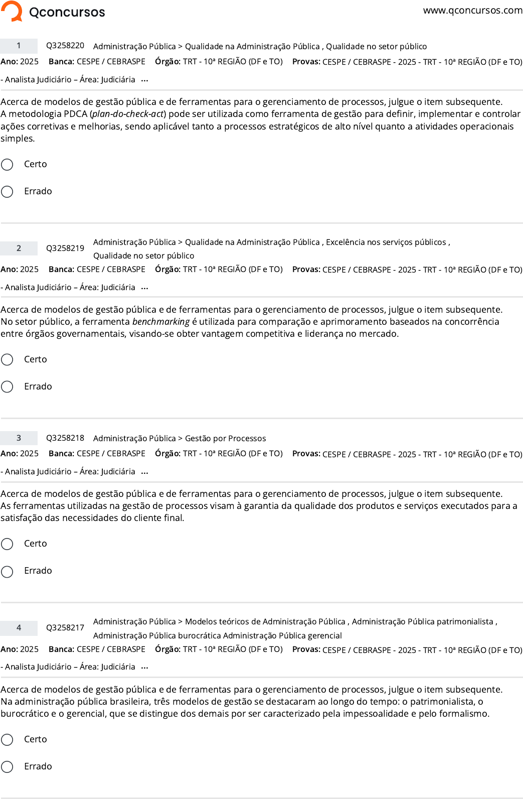 www.qconcursos.com Ano: 2025 Banca: CESPE / CEBRASPE Órgão: TRT - 10ª REGIÃO (DF e TO) Acerca de modelos de gestão pública e de ferramentas para o gerenciamento de processos, julgue o item subsequente. A metodologia PDCA (plan-do-check-act) pode ser utilizada como ferramenta de gestão para definir, implementar e controlar ações corretivas e melhorias, sendo aplicável tanto a processos estratégicos de alto nível quanto a atividades operacionais simples. Certo Errado Ano: 2025 Banca: CESPE / CEBRASPE Órgão: TRT - 10ª REGIÃO (DF e TO) Acerca de modelos de gestão pública e de ferramentas para o gerenciamento de processos, julgue o item subsequente. No setor público, a ferramenta benchmarking é utilizada para comparação e aprimoramento baseados na concorrência entre órgãos governamentais, visando-se obter vantagem competitiva e liderança no mercado. Certo Errado Ano: 2025 Banca: CESPE / CEBRASPE Órgão: TRT - 10ª REGIÃO (DF e TO) Acerca de modelos de gestão pública e de ferramentas para o gerenciamento de processos, julgue o item subsequente. As ferramentas utilizadas na gestão de processos visam à garantia da qualidade dos produtos e serviços executados para a satisfação das necessidades do cliente final. Certo Errado Ano: 2025 Banca: CESPE / CEBRASPE Órgão: TRT - 10ª REGIÃO (DF e TO) Acerca de modelos de gestão pública e de ferramentas para o gerenciamento de processos, julgue o item subsequente. Na administração pública brasileira, três modelos de gestão se destacaram ao longo do tempo: o patrimonialista, o burocrático e o gerencial, que se distingue dos demais por ser caracterizado pela impessoalidade e pelo formalismo. Certo Errado 1 Q3258220 >Administração Pública Qualidade na Administração Pública , Qualidade no setor público Provas: CESPE / CEBRASPE - 2025 - TRT - 10ª REGIÃO (DF e TO) - Analista Judiciário – Área: Judiciária ... 2 Q3258219 >Administração Pública Qualidade na Administração Pública , Excelência nos serviços públicos , Qualidade no setor público Provas: CESPE / CEBRASPE - 2025 - TRT - 10ª REGIÃO (DF e TO) - Analista Judiciário – Área: Judiciária ... 3 Q3258218 >Administração Pública Gestão por Processos Provas: CESPE / CEBRASPE - 2025 - TRT - 10ª REGIÃO (DF e TO) - Analista Judiciário – Área: Judiciária ... 4 Q3258217 >Administração Pública Modelos teóricos de Administração Pública , Administração Pública patrimonialista , Administração Pública burocrática Administração Pública gerencial Provas: CESPE / CEBRASPE - 2025 - TRT - 10ª REGIÃO (DF e TO) - Analista Judiciário – Área: Judiciária ... https://www.qconcursos.com/ https://www.qconcursos.com/questoes-de-concursos/bancas/cespe-cebraspe https://www.qconcursos.com/questoes-de-concursos/institutos/trt-10-regiao-df-e-to https://www.qconcursos.com/questoes-de-concursos/bancas/cespe-cebraspe https://www.qconcursos.com/questoes-de-concursos/institutos/trt-10-regiao-df-e-to https://www.qconcursos.com/questoes-de-concursos/bancas/cespe-cebraspe https://www.qconcursos.com/questoes-de-concursos/institutos/trt-10-regiao-df-e-to https://www.qconcursos.com/questoes-de-concursos/bancas/cespe-cebraspe https://www.qconcursos.com/questoes-de-concursos/institutos/trt-10-regiao-df-e-to https://www.qconcursos.com/questoes-de-concursos/questoes/1ac9c98e-08 https://www.qconcursos.com/questoes-de-concursos/disciplinas/administracao-administracao-publica https://www.qconcursos.com/questoes-de-concursos/disciplinas/administracao-administracao-publica/qualidade-na-administracao-publica https://www.qconcursos.com/questoes-de-concursos/disciplinas/administracao-administracao-publica/qualidade-no-setor-publico https://www.qconcursos.com/questoes-de-concursos/provas/cespe-cebraspe-2025-trt-10-regiao-df-e-to-analista-judiciario-area-judiciaria https://www.qconcursos.com/questoes-de-concursos/provas/cespe-cebraspe-2025-trt-10-regiao-df-e-to-analista-judiciario-area-judiciaria https://www.qconcursos.com/questoes-de-concursos/questoes/1ac7415e-08 https://www.qconcursos.com/questoes-de-concursos/disciplinas/administracao-administracao-publica https://www.qconcursos.com/questoes-de-concursos/disciplinas/administracao-administracao-publica/qualidade-na-administracao-publica https://www.qconcursos.com/questoes-de-concursos/disciplinas/administracao-administracao-publica/excelencia-nos-servicos-publicos https://www.qconcursos.com/questoes-de-concursos/disciplinas/administracao-administracao-publica/qualidade-no-setor-publico https://www.qconcursos.com/questoes-de-concursos/provas/cespe-cebraspe-2025-trt-10-regiao-df-e-to-analista-judiciario-area-judiciaria https://www.qconcursos.com/questoes-de-concursos/provas/cespe-cebraspe-2025-trt-10-regiao-df-e-to-analista-judiciario-area-judiciaria https://www.qconcursos.com/questoes-de-concursos/questoes/1ac4c078-08 https://www.qconcursos.com/questoes-de-concursos/disciplinas/administracao-administracao-publica https://www.qconcursos.com/questoes-de-concursos/disciplinas/administracao-administracao-publica/gestao-por-processos https://www.qconcursos.com/questoes-de-concursos/provas/cespe-cebraspe-2025-trt-10-regiao-df-e-to-analista-judiciario-area-judiciaria https://www.qconcursos.com/questoes-de-concursos/provas/cespe-cebraspe-2025-trt-10-regiao-df-e-to-analista-judiciario-area-judiciaria https://www.qconcursos.com/questoes-de-concursos/questoes/1ac23bd1-08 https://www.qconcursos.com/questoes-de-concursos/disciplinas/administracao-administracao-publica https://www.qconcursos.com/questoes-de-concursos/disciplinas/administracao-administracao-publica/modelos-teoricos-de-administracao-publica https://www.qconcursos.com/questoes-de-concursos/disciplinas/administracao-administracao-publica/administracao-publica-patrimonialista https://www.qconcursos.com/questoes-de-concursos/disciplinas/administracao-administracao-publica/administracao-publica-burocratica https://www.qconcursos.com/questoes-de-concursos/discip