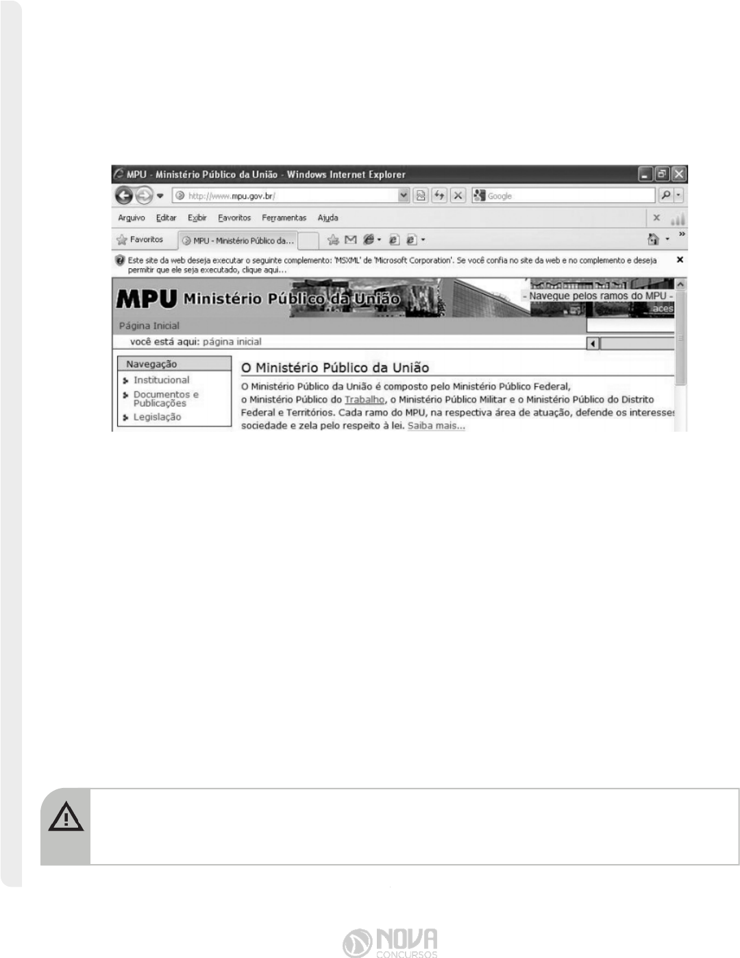 30 CO N H EC IM EN TO S D E IN FO RM ÁT IC A Com base na figura acima, que apresenta um texto em edição no Microsoft Word 2007 (MS Word 2007), julgue os próximos itens, relativos à edição de textos e planilhas. ( ) CERTO ( ) ERRADO Resposta: CERTO O complemento MSXML 5.0 na verdade não é instalado no computador, ele apenas é executado. Observando-se que em momento nenhum a mensagem de alerta pede a instalação do complemento; ela pede apenas permissão para que o complemento seja executado. Alguns complementos precisam ser instalados, outros não, e o MSXML 5.0 não precisa. Instalação e execução são conceitos diferentes que a banca acabou confundindo. Considerando a situação mostrada na figura acima, que reproduz parte de uma janela do MPU no Internet Explorer, julgue os itens seguintes. 3. (Questão 27 - MPU Técnico: Especialidade Administração CESPE 2013). O complemento MSXML, exibido como alerta na página acima, indica a existência de vírus, não devendo, portanto, ser executado. ( ) CERTO ( ) ERRADO Resposta: ERRADO O alerta é apenas relativo à existência de conteúdo na página em questão que precisa ser executado por meio do plugin (complemento) de execução de XML (linguagem de marcação estendida, que deu origem ao HTML). Json (ECMA-404) Pode-se definir JSON (Javascript Object Notation) como um modelo para armazenamento e transmissão de informações no formato texto, independente de qualquer linguagem de programação. Este formato é nativo do Javascript e é de uso extremamente fácil. Podemos utilizar este formato em diversas plataformas de desenvolvimento, sendo que o mais usual seria por aplicações Web, devido a sua capacidade de estruturar informações de uma forma bem mais compacta do que o modelo XML, tornando mais rápido o “parsing” (processo de analisar uma sequência de entrada dessas informações) dessas informações. FIQUE ATENTO! É importante lembrarmos que existem uma variedade de opções de protocolos abertos padronizados, tais como SOAP, XML, entre outros, que podem ser adotados e isso vai depender da finalidade e dos requisitos da sua aplicação.