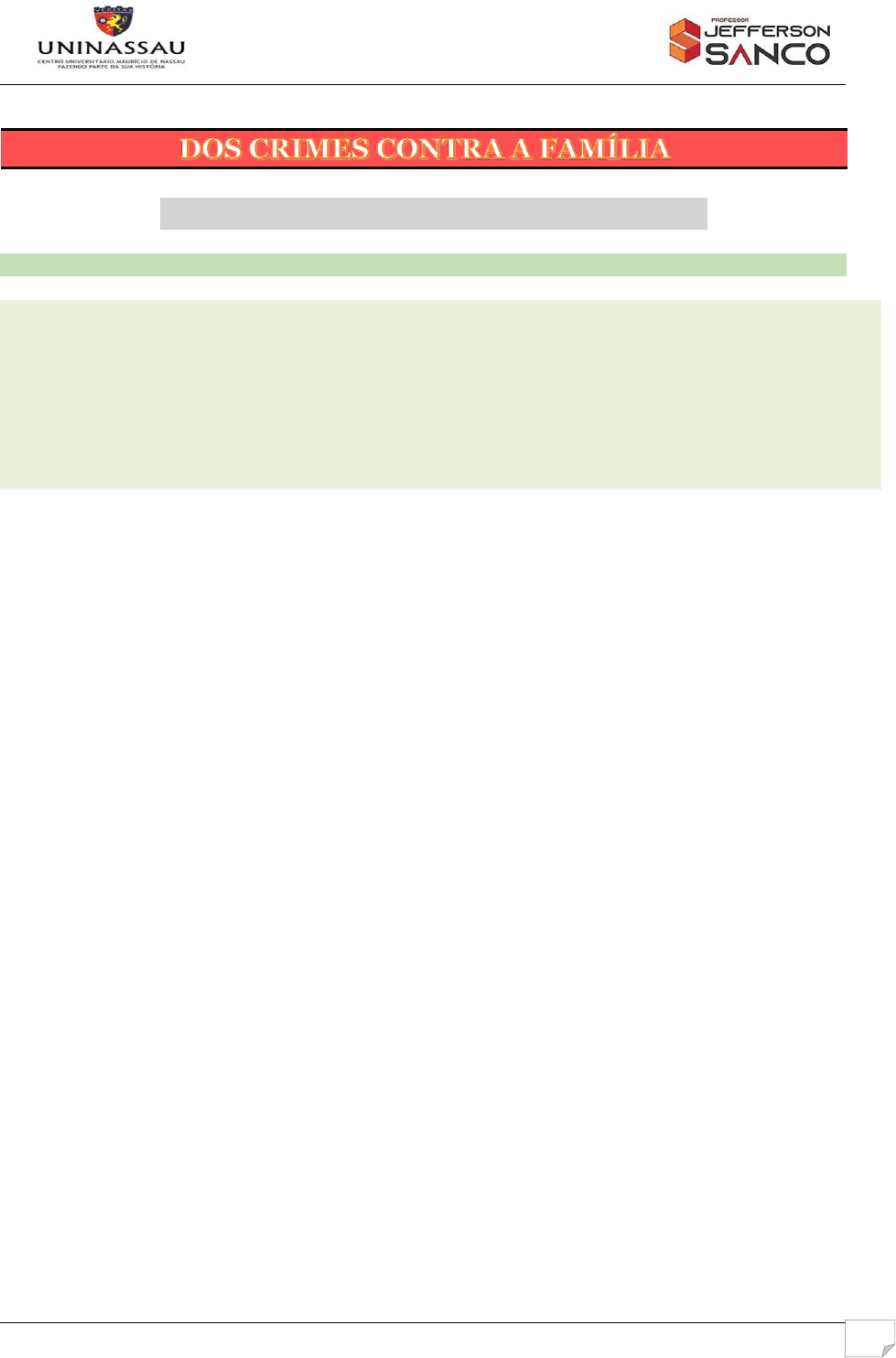 CRIMES EM ESPÉCIE II 5º BLOCO – DIREITO – MATUTINO/NOTURNO 2025.1 11 DOS CRIMES CONTRA O CASAMENTO Bigamia Art. 235 – Contrair alguém, sendo casado, novo casamento: Pena – reclusão, de dois a seis anos. § 1º – Aquele que, não sendo casado, contrai casamento com pessoa casada, conhecendo essa circunstância, é punido com reclusão ou detenção, de um a três anos. § 2º – Anulado por qualquer motivo o primeiro casamento, ou o outro por motivo que não a bigamia, considera-se inexistente o crime. Classificação doutrinária: crime simples (ofensa somente a um bem jurídico), próprio (só pode ser praticado por pessoas casadas), material (exige resultado naturalístico para a sua consumação), de dano (causa lesão ao casamento), de forma vinculada (o meio de execução está agregado ao que determina a lei civil), comissivo (exige uma ação), instantâneo de efeitos permanentes (consuma-se no momento em que homologado o casamento, mas seus efeitos se arrastam no tempo), plurissubjetivo (exige a presença de duas pessoas) e plurissubsistente (a execução pode ser fracionada). Núcleo do tipo: o crime consiste em contrair, ou seja, formalizar novas núpcias quando já se está casado. Segundo o Código Civil, não podem casar (art. 1.521): I – os ascendentes com os descendentes, seja o parentesco natural ou civil; II – os afins em linha reta; III – o adotante com quem foi cônjuge do adotado e o adotado com quem o foi do adotante; IV – os irmãos, unilaterais ou bilaterais, e demais colaterais, até o terceiro grau inclusive; V – o adotado com o filho do adotante; VI – as pessoas casadas; VII – o cônjuge sobrevivente com o condenado por homicídio ou tentativa de homicídio contra o seu consorte. Caso, em qualquer das hipóteses, ciente do impedimento que gere a nulidade, a pessoa vier a se casar, o crime será o do art. 237 do CP (conhecimento prévio de impedimento), exceto na hipótese do inciso VI (as pessoas casadas), quando o crime será o do art. 235 (bigamia), por força do princípio da especialidade. Evidentemente, a poligamia também configura o delito em estudo – ou seja, a contração de três ou mais casamentos pela mesma pessoa. Nesta hipótese, no entanto, não haverá um único crime de bigamia, mas vários, em concurso (em continuidade delitiva, se atendidos os requisitos do art. 71 do CP, ou em concurso material, residualmente). União estável: não configurará o crime em hipótese alguma. Duas uniões estáveis, um casamento prévio e uma união estável posterior ou vice-versa. Não importa! A união estável jamais será relevante para o crime de bigamia. Somente ocorrerá o delito quando houver um casamento válido prévio. Por isso, trata-se de crime de forma vinculada, pois só pode CRIMES EM ESPÉCIE II 5º BLOCO – DIREITO – MATUTINO/NOTURNO 2025.1 12 ser praticado mediante a contração de segundo casamento, o qual depende do cumprimento de diversas formalidades legais. Da mesma forma, se o casamento religioso não observar o que dispõe os arts. 1.515 e 1.516 do CC, não haverá o que se falar em bigamia. Sujeito ativo: trata-se de crime próprio (para o caput do art.235). Tanto o homem quanto a mulher podem praticá- lo, mas é essencial que já sejam casados. Ademais, trata-se de crime plurissubjetivo, plurilateral ou de concurso necessário, pois o tipo penal exige a presença de duas pessoas. Sujeito passivo: imediatamente, o Estado. O cônjuge enganado é sujeito passivo mediato do delito. Elemento subjetivo: é o dolo. O crime não é punido se praticado a título de culpa. Erro de tipo: Como o dolo, no âmbito do crime de bigamia, deve necessariamente abranger a ciência da existência de impedimento para o matrimônio, o desconhecimento do agente acerca de tal circunstância caracteriza erro de tipo (CP, art. 20), acarretando a atipicidade do fato. Exemplo: Uma pessoa vem a se casar após ser enganada pelo seu advogado, que lhe cobra honorários sob o argumento de que prestou serviços correspondentes à decretação judicial do seu divórcio. Nesse exemplo, o agente incidiu em falsa percepção acerca de uma situação fática, nota marcante do erro de tipo, excludente do dolo. Vale destacar, porém, que a dúvida do agente no tocante ao seu estado civil configura o delito, a título de dolo eventual. (MASSON, Cleber. Direito Penal Esquematizado, vol. 3). Objeto jurídico: protege-se a instituição do casamento, constitucionalmente prevista e tutelada, e a organização familiar que dele decorre, estrutura fundamental do Estado, que são colocados em risco com o novo casamento. Consumação: por ser crime material, é essencial, para a sua consumação, que o segundo casamento venha a, de fato, ocorrer. Trata-se de crime instantâneo, que se consuma no momento do casamento, mas com efeitos permanentes, que se arrastam no tempo. A tentativa é possível. No entanto, há discussão sobre o momento em que é iniciada a execução do delito. Para uma primeira corrente, a execução do crime inicia com o consentimento do agente (ou seja, logo após o “sim”). Portanto, a tentativa só seria possível entre o “sim” e a homologação do casamento. Para uma segunda corrente, todavia, a execução é iniciada junto à celebração. Questão prejudicial: as questões prejudiciais são classificadas em: a) homogêneas: são as pertencentes ao mesmo ramo do direito. É o exemplo da receptação, em que, para a sua caracterização, é necessário que se prove que a coisa é oriunda de outro crime (roubo, furto etc.). Portanto, cabe o juiz criminal a solução desta questão prejudicial; b) heterogêneas: são as pertencentes a outro ramo do direito. É o caso da bigamia. O juiz criminal não pode decidir se o réu era ou não casado anteriormente, devendo remeter o debate ao juízo cível para sanar a dúvida. Nas heterogêneas, nas hipóteses do art. 93 do CPP, é possível a suspensão do processo criminal e