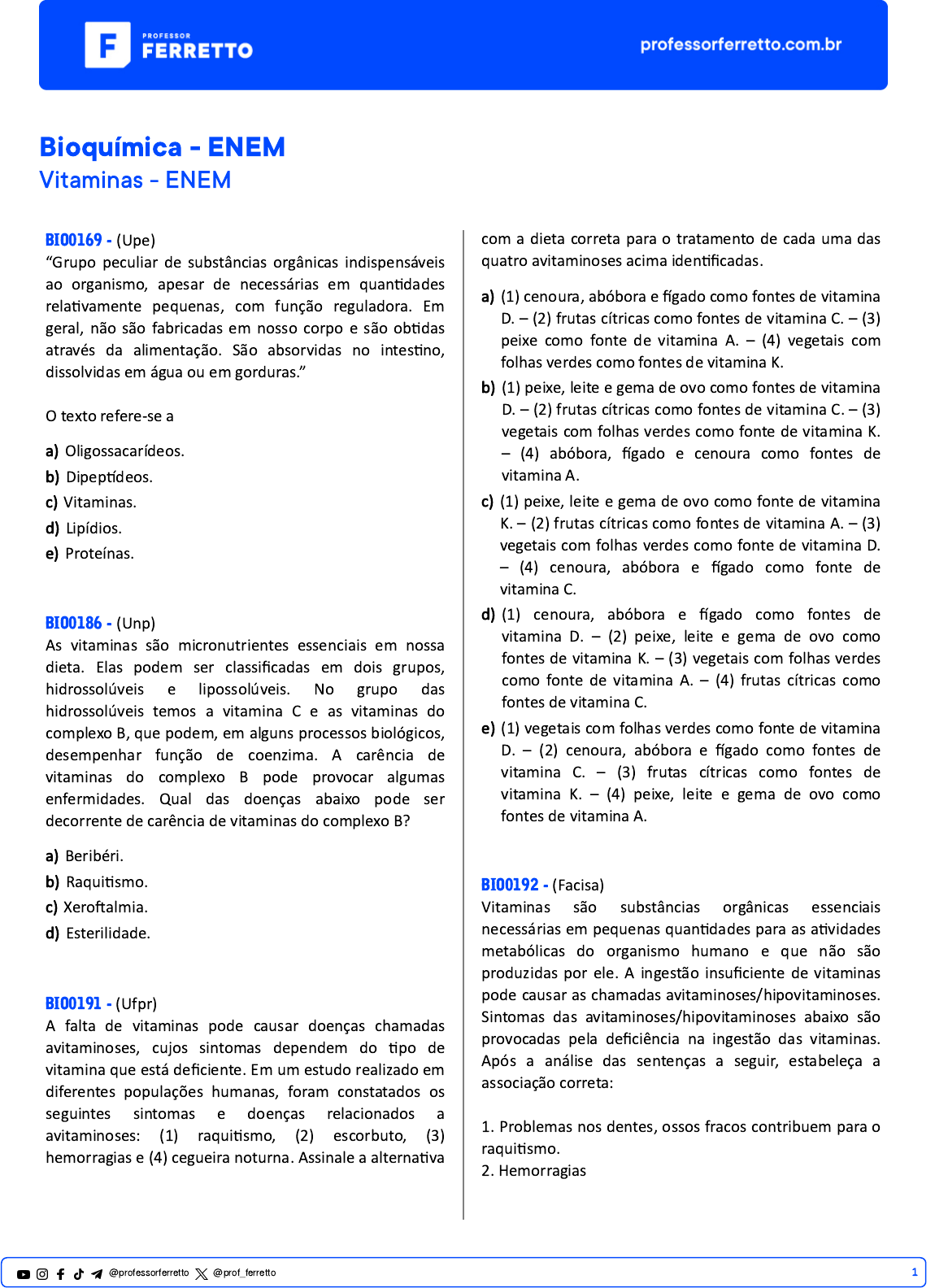 Bioquímica - ENEM Vitaminas - ENEM BIO0169 - (Upe) “Grupo peculiar de substâncias orgânicas indispensáveis ao organismo, apesar de necessárias em quantidades relativamente pequenas, com função reguladora. Em geral, não são fabricadas em nosso corpo e são obtidas através da alimentação. São absorvidas no intestino, dissolvidas em água ou em gorduras.” O texto refere-se a a) Oligossacarídeos. b) Dipeptídeos. c) Vitaminas. d) Lipídios. e) Proteínas. BIO0186 - (Unp) As vitaminas são micronutrientes essenciais em nossa dieta. Elas podem ser classificadas em dois grupos, hidrossolúveis e lipossolúveis. No grupo das hidrossolúveis temos a vitamina C e as vitaminas do complexo B, que podem, em alguns processos biológicos, desempenhar função de coenzima. A carência de vitaminas do complexo B pode provocar algumas enfermidades. Qual das doenças abaixo pode ser decorrente de carência de vitaminas do complexo B? a) Beribéri. b) Raquitismo. c) Xeroftalmia. d) Esterilidade. BIO0191 - (Ufpr) A falta de vitaminas pode causar doenças chamadas avitaminoses, cujos sintomas dependem do tipo de vitamina que está deficiente. Em um estudo realizado em diferentes populações humanas, foram constatados os seguintes sintomas e doenças relacionados a avitaminoses: (1) raquitismo, (2) escorbuto, (3) hemorragias e (4) cegueira noturna. Assinale a alternativa com a dieta correta para o tratamento de cada uma das quatro avitaminoses acima identificadas. a) (1) cenoura, abóbora e fígado como fontes de vitamina D. – (2) frutas cítricas como fontes de vitamina C. – (3) peixe como fonte de vitamina A. – (4) vegetais com folhas verdes como fontes de vitamina K. b) (1) peixe, leite e gema de ovo como fontes de vitamina D. – (2) frutas cítricas como fontes de vitamina C. – (3) vegetais com folhas verdes como fonte de vitamina K. – (4) abóbora, fígado e cenoura como fontes de vitamina A. c) (1) peixe, leite e gema de ovo como fonte de vitamina K. – (2) frutas cítricas como fontes de vitamina A. – (3) vegetais com folhas verdes como fonte de vitamina D. – (4) cenoura, abóbora e fígado como fonte de vitamina C. d) (1) cenoura, abóbora e fígado como fontes de vitamina D. – (2) peixe, leite e gema de ovo como fontes de vitamina K. – (3) vegetais com folhas verdes como fonte de vitamina A. – (4) frutas cítricas como fontes de vitamina C. e) (1) vegetais com folhas verdes como fonte de vitamina D. – (2) cenoura, abóbora e fígado como fontes de vitamina C. – (3) frutas cítricas como fontes de vitamina K. – (4) peixe, leite e gema de ovo como fontes de vitamina A. BIO0192 - (Facisa) Vitaminas são substâncias orgânicas essenciais necessárias em pequenas quantidades para as atividades metabólicas do organismo humano e que não são produzidas por ele. A ingestão insuficiente de vitaminas pode causar as chamadas avitaminoses/hipovitaminoses. Sintomas das avitaminoses/hipovitaminoses abaixo são provocadas pela deficiência na ingestão das vitaminas. Após a análise das sentenças a seguir, estabeleça a associação correta: 1. Problemas nos dentes, ossos fracos contribuem para o raquitismo. 2. Hemorragias 1@professorferretto @prof_ferretto 3. Doenças da pele, distúrbios nervosos, inércia e extrema apatia. 4. Perda de apetite, fadiga muscular, nervosismo. 5. Anemia perniciosa, distúrbios nervosos. (_) vitamina D (_) vitamina K (_) vitamina B6 (_) vitamina B1 (_) vitamina B12 A sequência correta de associação e: a) 2, 3, 4, 5, 1. b) 1, 3, 2, 4, 5. c) 1, 2, 3, 4, 5. d) 2, 5, 1, 3, 4. e) 1, 2, 5, 3, 4. BIO0179 - (Upe) BEBÊ ANENCÉFALO COMPLETA NOVE MESES E ESTÁ BEM DE SAÚDE (...) Superando todas as expectativas médicas, a menina M. de J. F. chegou ao seu nono mês de vida. Ela nasceu portadora de anencefalia. Ao nascer, segundo os médicos, a garotinha teria apenas algumas horas de vida, mas ela continua crescendo e se desenvolvendo (...) Fonte: CN Notícias – Patrocínio Paulista, SPnoticias.cancaonova.com/noticia.LucianoBatista (...) Anencefalia é uma desordem cerebral, que resulta de defeito no tubo neural... Acredita-se que a dieta da mãe e sua ingestão de vitaminas possam ter alguma influência. Estudos recentes têm mostrado que a suplementação de vitamina _____ ou _____ na dieta da mulher em idade reprodutiva possa reduzir significativamente a incidência de defeitos no tubo neural (...). Fonte: www.revistaneurociencias.com.br/edicoes/2010. Assinale a alternativa que preenche corretamente as lacunas que contêm a vitamina envolvida na formação do tubo neural. a) Vitamina A ou retinol. b) Vitamina B3 ou niacina. c) Vitamina B5 ou ácido pantotênico. d) Vitamina B9 ou ácido fólico. e) Vitamina C ou ácido ascórbico. BIO0182 - (Ufrgs) Observe a tira abaixo. Fonte: Iotti. Zero Hora. 11 abr. 2014. Se o filho do Radicci tornar-se vegetariano do tipo que não utiliza produtos derivados de animais, ficará impossibilitado de obter, em sua dieta, a vitamina a) B12, que atua na formação de células vermelhas do sangue. b) B12, que é encontrada nos pigmentos visuais. c) D, que auxilia na formação do tecido conjuntivo. d) E, que é responsável pela absorção de cálcio. e) E, que participa da formação de nucleotídeos. BIO0173 - (Enem) A obesidade, que nos países desenvolvidos já é tratada como epidemia, começa a preocupar especialistas no Brasil. Os últimos dados da Pesquisa de Orçamentos Familiares, realizada entre 2002 e 2003 pelo IBGE, mostram que 40,6% da população brasileira estão acima do peso, ou seja, 38,8 milhões de adultos. Desse total, 10,5 milhões são considerados obesos. Várias são as dietas e os remédios que prometem um emagrecimento rápido e sem riscos. Há alguns anos foi lançado no mercado brasileiro um remédio de ação diferente dos demais, pois inibe a ação das lipases, enzimas que aceleram a reação de quebra de gorduras. Sem serem quebradas elas não são absorvidas pelo intestin