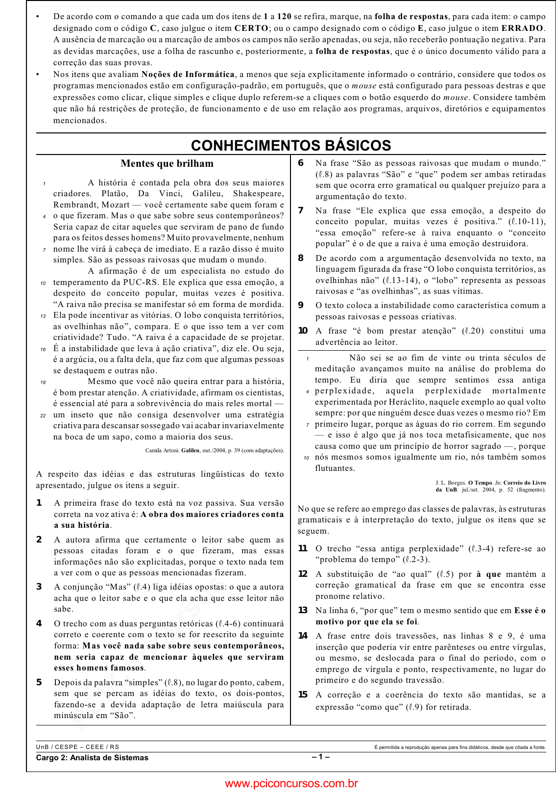 pcimarkpci MDAwMDowMDAwOjAwMDA6MDAwMDowMDAwOmZmZmY6ZDhlZTo3MGZl:U3VuLCAzMCBNYXIgMjAyNSAxMDo1NDo0NyAtMDMwMA== www.pciconcursos.com.br UnB / CESPE – CEEE / RS É permitida a reprodução apenas para fins didáticos, desde que citada a fonte. Cargo 2: Analista de Sistemas – 1 – • De acordo com o comando a que cada um dos itens de 1 a 120 se refira, marque, na folha de respostas, para cada item: o campo designado com o código C , caso julgue o item CERTO ; ou o campo designado com o código E, caso julgue o item ERRADO . A ausência de marcação ou a marcação de ambos os campos não serão apenadas, ou seja, não receberão pontuação negativa. Para as devidas marcações, use a folha de rascunho e, posteriormente, a folha de respostas, que é o único documento válido para a correção das suas provas. • Nos itens que avaliam Noções de Informática, a menos que seja explicitamente informado o contrário, considere que todos os programas mencionados estão em configuração-padrão, em português, que o mouse está configurado para pessoas destras e que expressões como clicar, clique simples e clique duplo referem-se a cliques com o botão esquerdo do mouse. Considere também que não há restrições de proteção, de funcionamento e de uso em relação aos programas, arquivos, diretórios e equipamentos mencionados. CONHECIMENTOS BÁSICOS Mentes que brilham 1 A história é contada pela obra dos seus maiores criadores. Platão, Da Vinci, Galileu, Shakespeare, Rembrandt, Mozart — você certamente sabe quem foram e 4 o que fizeram. Mas o que sabe sobre seus contemporâneos? Seria capaz de citar aqueles que serviram de pano de fundo para os feitos desses homens? Muito provavelmente, nenhum 7 nome lhe virá à cabeça de imediato. E a razão disso é muito simples. São as pessoas raivosas que mudam o mundo. A afirmação é de um especialista no estudo do 10 temperamento da PUC-RS. Ele explica que essa emoção, a despeito do conceito popular, muitas vezes é positiva. “A raiva não precisa se manifestar só em forma de mordida. 13 Ela pode incentivar as vitórias. O lobo conquista territórios, as ovelhinhas não”, compara. E o que isso tem a ver com criatividade? Tudo. “A raiva é a capacidade de se projetar. 16 É a instabilidade que leva à ação criativa”, diz ele. Ou seja, é a argúcia, ou a falta dela, que faz com que algumas pessoas se destaquem e outras não. 19 Mesmo que você não queira entrar para a história, é bom prestar atenção. A criatividade, afirmam os cientistas, é essencial até para a sobrevivência do mais reles mortal — 22 um inseto que não consiga desenvolver uma estratégia criativa para descansar sossegado vai acabar invariavelmente na boca de um sapo, como a maioria dos seus. Camila Artoni. Galileu, out./2004, p. 39 (com adaptações). A respeito das idéias e das estruturas lingüísticas do texto apresentado, julgue os itens a seguir. 1 A primeira frase do texto está na voz passiva. Sua versão correta na voz ativa é: A obra dos maiores criadores conta a sua história. 2 A autora afirma que certamente o leitor sabe quem as pessoas citadas foram e o que fizeram, mas essas informações não são explicitadas, porque o texto nada tem a ver com o que as pessoas mencionadas fizeram. 3 A conjunção “Mas” (�.4) liga idéias opostas: o que a autora acha que o leitor sabe e o que ela acha que esse leitor não sabe. 4 O trecho com as duas perguntas retóricas (�.4-6) continuará correto e coerente com o texto se for reescrito da seguinte forma: Mas você nada sabe sobre seus contemporâneos, nem seria capaz de mencionar àqueles que serviram esses homens famosos. 5 Depois da palavra “simples” (�.8), no lugar do ponto, cabem, sem que se percam as idéias do texto, os dois-pontos, fazendo-se a devida adaptação de letra maiúscula para minúscula em “São”. 6 Na frase “São as pessoas raivosas que mudam o mundo.” (�.8) as palavras “São” e “que” podem ser ambas retiradas sem que ocorra erro gramatical ou qualquer prejuízo para a argumentação do texto. 7 Na frase “Ele explica que essa emoção, a despeito do conceito popular, muitas vezes é positiva.” (�.10-11), “essa emoção” refere-se à raiva enquanto o “conceito popular” é o de que a raiva é uma emoção destruidora. 8 De acordo com a argumentação desenvolvida no texto, na linguagem figurada da frase “O lobo conquista territórios, as ovelhinhas não” (�.13-14), o “lobo” representa as pessoas raivosas e “as ovelhinhas”, as suas vítimas. 9 O texto coloca a instabilidade como característica comum a pessoas raivosas e pessoas criativas. 10 A frase “é bom prestar atenção” (�.20) constitui uma advertência ao leitor. 1 Não sei se ao fim de vinte ou trinta séculos de meditação avançamos muito na análise do problema do tempo. Eu diria que sempre sentimos essa antiga 4 perp lex id ad e , aq ue la p e rp lexidade morta lmente experimentada por Heráclito, naquele exemplo ao qual volto sempre: por que ninguém desce duas vezes o mesmo rio? Em 7 primeiro lugar, porque as águas do rio correm. Em segundo — e isso é algo que já nos toca metafisicamente, que nos causa como que um princípio de horror sagrado —, porque 10 nós mesmos somos igualmente um rio, nós também somos flutuantes. J. L. Borges. O Tempo. In: Correio do Livro da UnB. jul./set. 2004, p. 52 (fragmento). No que se refere ao emprego das classes de palavras, às estruturas gramaticais e à interpretação do texto, julgue os itens que se seguem. 11 O trecho “essa antiga perplexidade” (�.3-4) refere-se ao “problema do tempo” (�.2-3). 12 A substituição de “ao qual” (�.5) por à que mantém a correção gramatical da frase em que se encontra esse pronome relativo. 13 Na linha 6, “por que” tem o mesmo sentido que em Esse é o motivo por que ela se foi. 14 A frase entre dois travessões, nas linhas 8 e 9, é uma inse