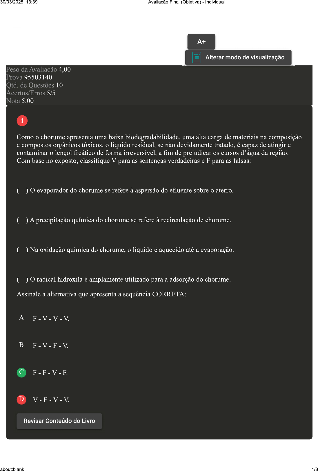 30/03/2025, 13:39 Avaliação Final (Objetiva) - Individual A+ Alterar modo de visualização Peso da Avaliação 4,00 Prova 95503140 Qtd. de Questões 10 Acertos/Erros 5/5 Nota 5,00 1 Como chorume apresenta uma baixa biodegradabilidade, uma alta carga de materiais na composição e compostos orgânicos tóxicos, líquido residual, se não devidamente tratado, é capaz de atingir e contaminar lençol freático de forma irreversível, a fim de prejudicar os cursos d'água da região. Com base no exposto, classifique V para as sentenças verdadeiras e F para as falsas: ( ) O evaporador do chorume se refere à aspersão do efluente sobre aterro. ( ) A precipitação química do chorume se refere à recirculação de chorume. ( ) Na oxidação química do chorume, líquido é aquecido até a evaporação. ( ) O radical hidroxila é amplamente utilizado para a adsorção do chorume. Assinale a alternativa que apresenta a sequência CORRETA: A - B - C D V-F-V-V Revisar Conteúdo do Livro about:blank 1/830/03/2025, 13:39 Avaliação Final (Objetiva) Individual 2 A composição do chorume pode variar devido a fatores que são influenciados a partir de condições ambientais e da forma de operação do local de descarte do resíduo. O chorume contém substâncias que não são biodegradáveis e que não servem de substratos para microrganismos, como sólidos suspensos e metais pesados. Com base nessas informações e nos seus conhecimentos a respeito do tema, assinale a alternativa CORRETA: A O pH é um parâmetro que acelera processo de decomposição de resíduos orgânicos. B Chorumes apresentam concentrações baixas de nitrogênio amoniacal. Os ácidos orgânicos voláteis são excelentes indicadores de degradabilidade e são gerados na fase acidogênica (aterros antigos). D A concentração de metais, como Fe, pode ser elevada em aterros jovens. Revisar Conteúdo do Livro 3 O biogás é uma alternativa para substituir gás natural. É resultado do processo de digestão anaeróbica de resíduos orgânicos na ausência de oxigênio, ou seja, em condições anaeróbicas. Com base no exposto, classifique V para as sentenças verdadeiras e F para as falsas: ( ) A relação (C:N) desejável é de 16:1. ( ) Quando a razão C/N é alta, aumenta-se risco de inibição do processo por amônia. ( ) Os principais micronutrientes requeridos que formam metano a partir do acetato, são ferro, cobalto, níquel e molibdênio. ( ) A temperatura psicrofilica está na faixa de 20 °C a 45 °C. Assinale a alternativa que apresenta a sequência CORRETA: about:blank 2/830/03/2025 13:39 Avaliação Final (Objetiva) - Individual A B F-V-F-V C F-V-V-V D V-V-F-F 4 Devido à diversidade de resíduos de aterros, a produção e a composição do biogás nesses aterros podem variar, sendo afetadas pelo conteúdo orgânico, pela temperatura e pela idade dos resíduos. Ainda, podem ser influenciadas pelo teor de umidade, disponibilidade de nutrientes, pH etc. Com base no exposto, associe os itens, utilizando código a seguir: I- Fica na faixa de 10% a Apresenta importância para as arqueias metanogênicas. III- A ausência interrompe a fermentação. IV- Com relação à idade do após um período de disposição de resíduos de 10 a 15 anos, a geração é aumentada. ( ) Enxofre. ( ) Fósforo. ( ) Biogás. ( ) Teor de umidade. Assinale a alternativa com a sequência CORRETA: about:blank 3/830/03/2025, 13:39 Avaliação Final (Objetiva) - Individual A II - III - IV - I. B - - C I - II - IV - III. D - Revisar Conteúdo do Livro 5 Os critérios para a localização de aterros sanitários exigem a observação de diversos aspectos. Para os aterros sanitários que recebem resíduos perigosos, alguns critérios podem ser diferenciados, tendo em vista a característica dos resíduos ali depositados. Com relação aos critérios para a localização de aterros de resíduos perigosos, analise as sentenças a seguir: I- Recomenda-se que as áreas, para a construção dos aterros de resíduos perigosos, não estejam sujeitas a inundações. II- A distância para os corpos d'água deve ser de 300 metros. III- O solo deve possuir um baixo coeficiente de permeabilidade. Assinale a alternativa CORRETA: A Somente a sentença II está correta. B As sentenças I e II estão corretas. C Somente a sentença I está correta. about:blank 4/830/03/2025, 13:39 Avaliação Final (Objetiva) - Individual D As sentenças I e III estão corretas. 6 A classificação de resíduos sólidos busca identificar processo ou atividade que deu origem, incluindo os agentes que compuseram. Para diferenciar os resíduos classificados pela ABNT NBR 10004/2004 em Classe I ou Classe II, é preciso realizar testes ou ensaios que investigam todas as características do resíduo. Com base no exposto, associe os itens, utilizando código a seguir: I- Teste de lixiviação. II- Teste de solubilidade. III- Resíduo Classe II. IV- Resíduo Classe III. ( ) biodegradabilidade ou solubilidade em água. ( ) Uma operação de separação de certas substâncias contidas nos resíduos por meio da lavagem ou percolação. ( ) Substâncias sem constituintes solubilizados. ( ) Constituintes solubilizados com ultrapassagem das concentrações superiores aos padrões já definidos. Assinale a alternativa que apresenta a sequência CORRETA: Fonte: ASOCIAÇÃO BRASILEIRA DE NORMAS ABNT NBR 10004. Resíduos sólidos Classificação. Rio de Janeiro: ABNT, 2004. Disponível em: Residuos-Solidos.pdf Acesso em: 24 out. 2022. A about:blank 5/830/03/2025, 13:39 Avaliação Final (Objetiva) Individual B II. C D 7 A compostagem se refere a um processo do tipo biológico, no qual estão envolvidos microrganismos que transformam matéria orgânica (frutas, cascas de ovo, fezes de herbívoros, restos de café etc.) em uma substância homogênea, de cor castanha, com aspecto de terra e com cheiro de floresta, conhecida como adubo Com base no exposto, assinale a alternativa CORRETA: A A temperatura 