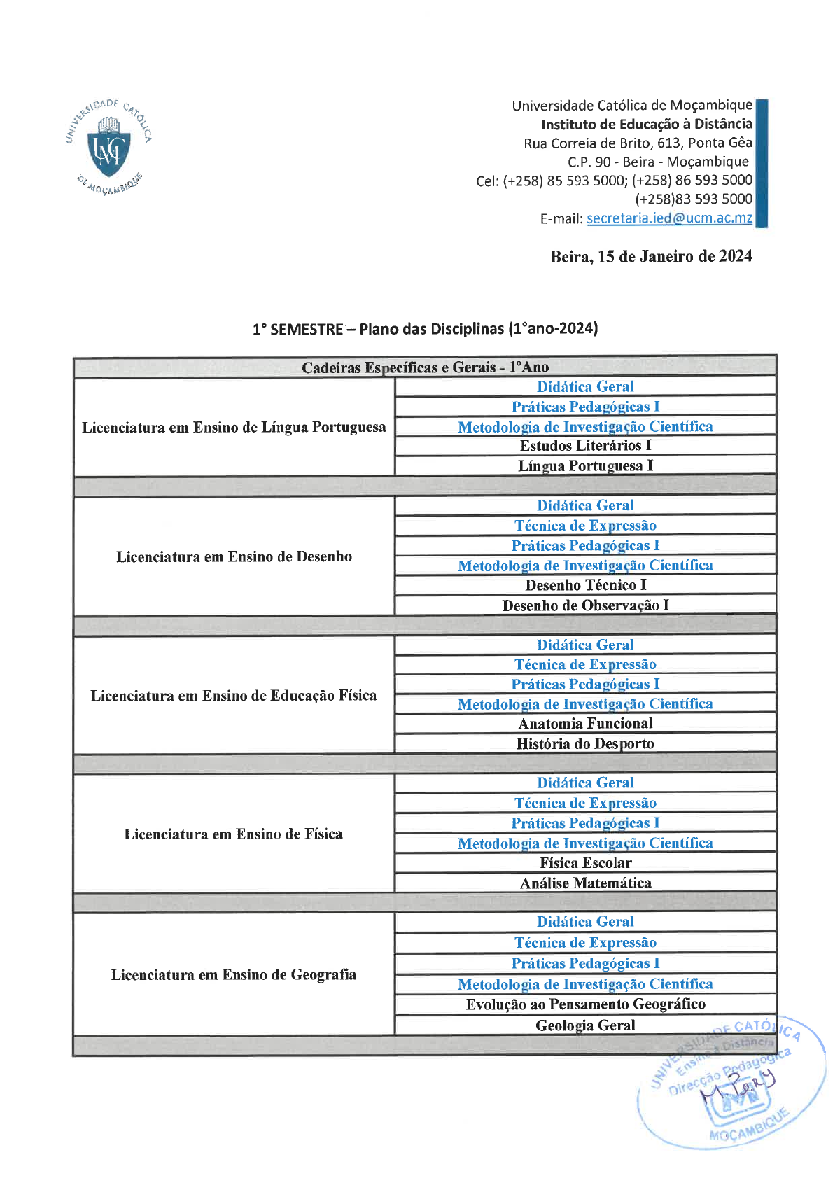 Universidade Católica de Moçambique Instituto de Educação à Distância Rua Correia de Brito, 613, Ponta Gêa C.P. 90 - Beira - Moçambique DE Cel: (+258) 85 593 5000; (+258) 86 593 5000 (+258)83 593 5000 E-mail: secretaria.ied@ucm.ac.mz Beira, 15 de Janeiro de 2024 1° SEMESTRE - Plano das Disciplinas (1°ano-2024) Cadeiras Específicas e Gerais - Didática Geral Práticas Pedagógicas I Licenciatura em Ensino de Língua Portuguesa Metodologia de Investigação Científica Estudos Literários I Língua Portuguesa I Didática Geral Técnica de Expressão Práticas Pedagógicas I Licenciatura em Ensino de Desenho Metodologia de Investigação Científica Desenho Técnico I Desenho de Observação I Didática Geral Técnica de Expressão Práticas Pedagógicas I Licenciatura em Ensino de Educação Física Metodologia de Investigação Científica Anatomia Funcional História do Desporto Didática Geral Técnica de Expressão Práticas Pedagógicas I Licenciatura em Ensino de Física Metodologia de Investigação Científica Física Escolar Análise Matemática Didática Geral Técnica de Expressão Práticas Pedagógicas I Licenciatura em Ensino de Geografia Metodologia de Investigação Científica Evolução ao Pensamento Geográfico Geologia GeralDidática Geral Técnica de Expressão Práticas Pedagógicas I Licenciatura em Ensino de Química Metodologia de Investigação Científica Matemática Básica Física básica Didática Geral Técnica de Expressão Práticas Pedagógicas I Licenciatura em Ensino de Biologia Metodologia de Investigação Científica Biologia Celular e Molecular Botânica Geral Didática Geral Técnica de Expressão Práticas Pedagógicas I Licenciatura em Ensino de História Metodologia de Investigação Científica Introdução ao estudo da História História das Sociedades I Didática Geral Técnica de Expressão Práticas Pedagógicas I Licenciatura em Ensino de Informática Metodologia de Investigação Científica Fundamentos de Sistemas de Informação Noções de Informática Técnica de Expressão Metodologia de Investigação Científica I Licenciatura em Administração Pública Teoria Geral da Administração Princípios de Direito Técnica de Expressão Metodologia de Investigação Científica Licenciatura em Gestão Ambiental Fundamentos de Estudos Ambientais Climatogeografia Higiene e Segurança no Trabalho Didática Geral Técnica de Expressão Práticas Pedagógicas I Licenciatura em Ensino de Matemática Metodologia de Investigação Científica Álgebra Linear Fundamentos de Matemática I Directora Adjunta Pedagógica MA. Manuela Pery MOCAMBIQUE