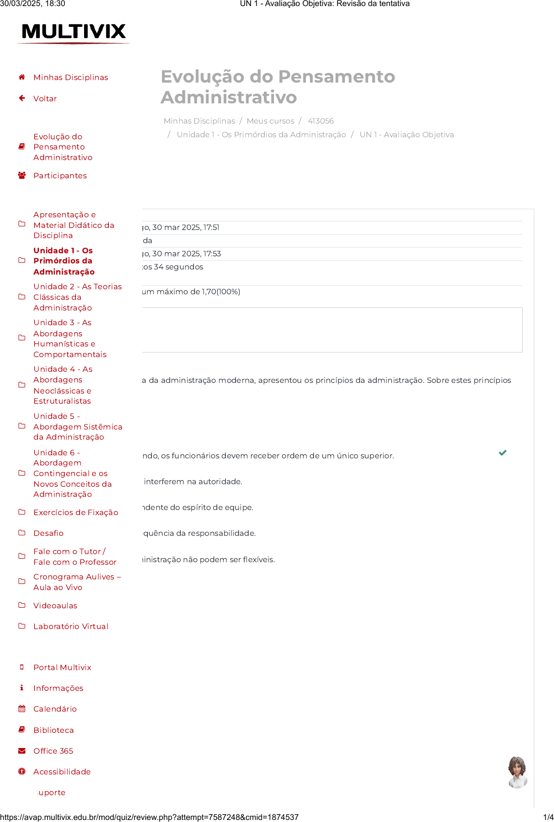 Minhas Disciplinas / Meus cursos / 413056 / Unidade 1 - Os Primórdios da Administração / UN 1 - Avaliação Objetiva Evolução do Pensamento Administrativo Iniciado em domingo, 30 mar 2025, 17:51 Estado Finalizada Concluída em domingo, 30 mar 2025, 17:53 Tempo empregado 2 minutos 34 segundos Avaliar 1,70 de um máximo de 1,70(100%) Questão 1 Correto Atingiu 0,34 de 0,34 Henri Fayol, o pai da teoria da administração moderna, apresentou os princípios da administração. Sobre estes princípios está correto afirmar: Escolha uma opção: Na unidade de comando, os funcionários devem receber ordem de um único superior. Fatores pessoais não interferem na autoridade. A autoridade é dependente do espírito de equipe. A autoridade é consequência da responsabilidade. Os princípios da administração não podem ser flexíveis. Minhas Disciplinas Voltar Evolução do Pensamento Administrativo Participantes Apresentação e Material Didático da Disciplina Unidade 1 - Os Primórdios da Administração Unidade 2 - As Teorias Clássicas da Administração Unidade 3 - As Abordagens Humanísticas e Comportamentais Unidade 4 - As Abordagens Neoclássicas e Estruturalistas Unidade 5 - Abordagem Sistêmica da Administração Unidade 6 - Abordagem Contingencial e os Novos Conceitos da Administração Exercícios de Fixação Desafio Fale com o Tutor / Fale com o Professor Cronograma Aulives – Aula ao Vivo Videoaulas Laboratório Virtual Portal Multivix Informações Calendário Biblioteca Office 365 Acessibilidade Suporte 30/03/2025, 18:30 UN 1 - Avaliação Objetiva: Revisão da tentativa https://avap.multivix.edu.br/mod/quiz/review.php?attempt=7587248&cmid=1874537 1/4 https://avap.multivix.edu.br/my/ https://avap.multivix.edu.br/course/view.php?id=32944 https://avap.multivix.edu.br/course/view.php?id=32944§ion=2 https://avap.multivix.edu.br/mod/quiz/view.php?id=1874537 https://avap.multivix.edu.br/my/ https://avap.multivix.edu.br/course/view.php?id=32944 https://avap.multivix.edu.br/user/index.php?id=32944 https://avap.multivix.edu.br/course/view.php?id=32944§ion=1 https://avap.multivix.edu.br/course/view.php?id=32944§ion=2 https://avap.multivix.edu.br/course/view.php?id=32944§ion=3 https://avap.multivix.edu.br/course/view.php?id=32944§ion=4 https://avap.multivix.edu.br/course/view.php?id=32944§ion=5 https://avap.multivix.edu.br/course/view.php?id=32944§ion=6 https://avap.multivix.edu.br/course/view.php?id=32944§ion=7 https://avap.multivix.edu.br/course/view.php?id=32944§ion=8 https://avap.multivix.edu.br/course/view.php?id=32944§ion=9 https://avap.multivix.edu.br/course/view.php?id=32944§ion=10 https://avap.multivix.edu.br/course/view.php?id=32944§ion=11 https://avap.multivix.edu.br/course/view.php?id=32944§ion=12 https://avap.multivix.edu.br/course/view.php?id=32944§ion=13 https://avap.multivix.edu.br/hooks/portal/ https://avap.multivix.edu.br/mod/page/view.php?id=1252%2F%22%20target%3D%22_blank https://avap.multivix.edu.br/calendar/view.php/ https://avap.multivix.edu.br/local/staticpage/view.php?page=biblioteca https://multivix.edu.br/office-365/ https://multivix.edu.br/acessibilidade/ https://avap.multivix.edu.br/mod/page/view.php?id=7%2F%22%20target%3D%22_blank https://docs.google.com/forms/d/e/1FAIpQLSfyH1O0KRhpI8B0cFqDv3aXT41lziF0mULzRNTBk2x0miNkNA/viewform https://avap.multivix.edu.br/ https://avap.multivix.edu.br/ https://avap.multivix.edu.br/ https://avap.multivix.edu.br/ https://avap.multivix.edu.br/ Questão 2 Correto Atingiu 0,34 de 0,34 Questão 3 Correto Atingiu 0,34 de 0,34 A empresa consiste em um conjunto de processos, que são atividades ordenadas, interligadas e delimitadas. Dentre estes processos tem-se os produtivos, que por sua vez também são classificados de acordo com suas características. Pequenos negócios ou mesmo profissionais autônomos que trabalham com restauração de móveis, alfaiates que fazem ternos sob encomenda, apresentam semelhanças que os distinguem dos demais processos produtivos. Com relação à classificação dos tipos de processos presentes nas organizações, pode-se identificar os exemplos do enunciado como processo de: Escolha uma opção: a. produção em massa. b. produção unitária. c. produção contínua. d. prestação de serviços. e. transformação de produtos. Um administrador, no desenvolvimento de suas atividades, precisa conseguir transformar os conhecimentos adquiridos em ações concretas (habilidades). O conjunto dessas habilidades formam as competências de um indivíduo, tornando-o capaz de entregar resultado para as organizações. Entre as competências necessárias para um bom administrador, destaca-se o conjunto de habilidades para o bom relacionamento interpessoal com subordinados, pares e superiores. Analise as afirmativas abaixo de acordo com o tipo de competência apresentada e depois marque a alternativa CORRETA: I – Percepção e análise da realidade para gerar informações úteis. II – Entendimento sobre processos de motivação e seu uso adequado. III – Capacidade de se comunicar adequadamente. Escolha uma opção: a. Todas as afirmativas são falsas. b. Apenas as afirmativas II e III são verdadeiras. c. Apenas as afirmativas I e II são verdadeiras. d. Todas as afirmativas são verdadeiras. e. Apenas as afirmativas I e III são verdadeiras. Minhas Disciplinas Voltar Evolução do Pensamento Administrativo Participantes Apresentação e Material Didático da Disciplina Unidade 1 - Os Primórdios da Administração Unidade 2 - As Teorias Clássicas da Administração Unidade 3 - As Abordagens Humanísticas e Comportamentais Unidade 4 - As Abordagens Neoclássicas e Estruturalistas Unidade 5 - Abordagem Sistêmica da Administração Unidade 6 - Abordagem Contingencial e os Novos Conceitos da Administração Exercícios de Fixação Desafio Fale com o Tutor / Fale com o Professor Cronograma Aulives – Aula ao Vivo Videoaulas Laboratório Virtual Portal Multivix Informações Calend
