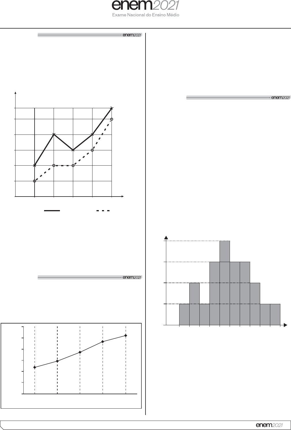 26 *020125AM26* MT - 2° dia | Caderno 5 - AMARELO - 1ª Aplicação Questão 165 A receita R�� ����� �%� ��������2�� �����> �Z��� dinheiro captado com a venda de mercadorias ou com a %� �'���� � �#�'� �� ��> $� ���� % ��D é todo o dinheiro utilizado para pagamento de salários, contas de água e luz, impostos, entre outros. O lucro mensal obtido ������2�����> �Z�����P � �'�� � � ���� � � �� ���� % �� � J� ���� � ��� �> (� �� J�?���� �%� � �� � � � � � � � � � % � $� ����2+���� �� �2$�� ����� �%� ��������2� dos cinco primeiros meses de um dado ano. Receitas e despesas Receita Despesa janeiro fevereiro março abril maio Mês 28 25 20 15 10 5 0 ��%� #� ���%����� �%�B@��� �� �Z��� ���2������ � �2� ���� "����P ��������������2������! ����� Z����> �� �����( Nessas condições, o lucro mensal para os próximos meses deve ser maior ou igual ao do mês de A janeiro. B fevereiro. C março. D abril. E maio. Questão 166 �� � %� ��� ����� ����/ � %��� ��� � ���2G!���� ��� ��G����� � � !��2(� � � � ��Y��� � � � ��� � %������� ���� respondem bem aos estímulos dos neurotransmissores. � �� �Z��� ��� ����!� ����� %� ��� >�����!" �#��� � restabelecer a química cerebral. Com o aumento gradativo � � �� � � � � � %� ��$� �� # ���� � � � ����� � � � ?� ���� � � � #�2�'��$����P��� ��2� �����J�?���( 600 500 400 300 200 100 0 236 294 370 465 519,2 2005 2006 20082007 2009 Vo lu m e de v en da s (e m m ilh ão ) Ano Veja, 10 fev. 2010 (adaptado). No período de 2005 a 2009, o aumento percentual no volume de vendas foi de A 45,4. B 54,5. C 120. D 220. E 283,2. Questão 167 Um casal está planejando comprar um apartamento de dois quartos num bairro de uma cidade e consultou a página de uma corretora de imóveis, encontrando 105 apartamentos de dois quartos à venda no bairro desejado. Eles usaram um aplicativo da corretora para J �������� ��!��'����� �%� '� �������"�� ��� ���B# � � selecionados. �� J�?���� �2� ��� �� �� ��!��'��� � � P� ��>���� � �� � preços de venda dos apartamentos dessa lista (em ��2� � �� k$�������2�� � P��@� �� �%� '�� ������� �%��� ��}}$��}}�$���}}$�&}}�$��&}}$�¹}}�$��¹}}$�¼}}�$��¼}}$�³}}�$� �³}}$��}}�$���}}$�{�}}}�$��{�}}}$�{�{}}�$��{�{}}$�{�~}}�� � �{�~}}$�{��}}�( A mesma corretora anuncia que cerca de 50% dos apartamentos de dois quartos nesse bairro, publicados em sua página, têm preço de venda inferior a 550 mil reais. ��� � �� �$� �� �� �2� ��+��� �� � �� K2 ���� ��P����'��� ���� ������%� G# 2�������J�?�����! ���( Distribuição dos preços Nú m er o de im óv ei s 0 5 10 15 20 300 400 500 600 700 800 900 1 000 1 100 1 200 1 300 Preço (em mil reais) ����!� ����J�?�����! ���$���� ����%� '�$�p (em mil reais), para o qual pelo menos 50% dos apartamentos apresenta preço inferior a p é A 600. B 700. C 800. D 900. E 1 000. Amarelo CN MT 2 Dia P1.indb 26 09/09/2021 18:52:06