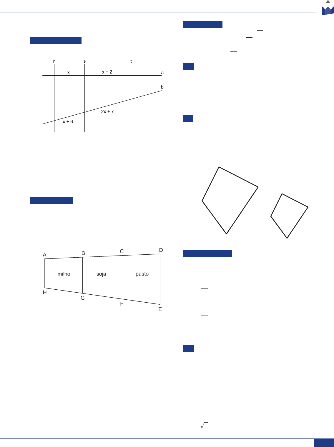 Coleção PREPARAENEM CADERNO DE MATEMÁTICA 19 12.2 SEGMENTOS PROPORCIONAIS 87. (CFTMG 2014) Considere a figura em que r // s // t . O valor de x é A 3. B 4. C 5. D 6. 88. (CPS 2012) Para melhorar a qualidade do solo, aumentando a pro- dutividade do milho e da soja, em uma fazenda é feito o rodízio entre essas culturas e a área destinada ao pasto. Com essa finalidade, a área produtiva da fazenda foi divi- dida em três partes conforme a figura. Considere que – os pontos A, B, C e D estão alinhados; – os pontos H, G, F e E estão alinhados; – os segmentos AH , BG , CF e DE são, dois a dois, pa- ralelos entre si; – AB = 500m, BC = 600 m, CD = 700 m e HE = 1980 m. Nessas condições, a medida do segmento GF é, em metros, A 665. B 660. C 655. D 650. E 645. 89. (G1 1996) Uma reta paralela ao lado BC de um triângulo ABC, de- termina sobre o lado AB segmentos de 3 cm e 12 cm. Calcule as medidas dos segmentos que esta reta determi- na sobre o lado AC , de medida 10 cm. 90. Um feixe de 4 paralelas determina sobre uma transversal três segmentos consecutivos que medem 5 cm, 6 cm, 9 cm. Calcule os comprimentos do segmentos determinados pelo feixe noutra transversal, sabendo que o segmento desta, compreendido entre a primeira e a quarta paralela é 60 cm. 91. Os quadriláteros ABCD e EFGH a seguir são semelhantes. Nessas condições determine: A razão de semelhança de ABCD e EFGH B as medidas x, y, z A 4,5 D 3,6 C 9 B 6 E H y G z F 4 x 92. (PUCRJ 2012) Considere um triângulo ABC retângulo em A, onde AB 21= e AC 20= . BD é a bissetriz do ângulo ABCU . Quanto mede AD A 5 42 B 20 21 C 21 20 D 9 E 8 93. Num triângulo retângulo, um cateto é o dobro do outro. Então a razão entre o maior e o menor dos segmentos determinados pela altura sobre a hipotenusa é: A 2 B 3 C 4 D 2 3 E 5 Coleção PREPARAENEM CADERNO DE MATEMÁTICA 20 12.3 - SEMELHANÇA DE TRIÂNGULOS 94. (IFCE 2012) Sobre os lados AB e AC do triângulo ABC, são marcados os pontos D e E, respectivamente, de tal forma, que DE // BC, AE = 6 cm, DB = 2 cm, EC = 3 cm e DE = 8 cm. Nessas condições, a soma das medidas dos segmentos AD e BC, em centímetros, vale A 12. B 16. C 18. D 24. E 30. TEXTO PARA A PRÓXIMA QUESTÃO: Considere um triângulo ABC cuja base AB mede 27dm. Traçando-se uma reta “t”, paralela à base, ela determina sobre os lados AC e BC , respectivamente, os pontos D e E. Sabe-se que DC mede 14dm, BE mede 8dm e DE mede 18dm. 95. (IFAL 2012) Assinale a alternativa falsa. A Os triângulos ABC e DEC são semelhantes. B Os triângulos ABC e CDE são semelhantes. C . .CD AD2= D A razão de semelhança é 2 3 . E O lado BC mede 24 dm. 96. (CFTMG 2014) A figura a seguir apresenta um quadrado DEFG e um triân- gulo ABC cujo lado BC mede 40 cm e a altura AH, 24 cm. A medida do lado desse quadrado é um número A par. B primo. C divisível por 4. D múltiplo de 5. 97. (UFRGS 2012) Observe os discos de raios 2 e 4, tangentes entre si e às semirretas s e t, representados na figura abaixo. A distância entre os pontos P e Q é A 9. B 10. C 11. D 12. E 13. 98. (UFPR 2011) Um telhado inclinado reto foi construído sobre três su- portes verticais de aço, colocados nos pontos A, B e C, como mostra a figura ao lado. Os suportes nas extremida- des A e C medem, respectivamente, 4 metros e 6 metros de altura. A altura do suporte em B é, então, de: A 4,2 metros. B 4,5 metros. C 5 metros. D 5,2 metros. E 5,5 metros. 99. (FUVEST 2013) Um teleférico transporta turistas entre os picos A e B de dois morros. A altitude do pico A é de 500 m, a altitude do pico B é de 800 m e a distância entre as retas verticais que passam por A e B é de 900 m. Na figura, T representa o teleférico em um momento de sua ascensão e x e y repre- sentam, respectivamente, os deslocamentos horizontal e vertical do teleférico, em metros, até este momento. Coleção PREPARAENEM CADERNO DE MATEMÁTICA 21 A Qual é o deslocamento horizontal do teleférico quan- do o seu deslocamento vertical é igual a 20 m? B Se o teleférico se desloca com velocidade constante de 1,5 m/s, quanto tempo o teleférico gasta para ir do pico A ao pico B? 100. (EPCAR (CPCAR) 2011) A figura abaixo representa o logotipo que será estampa- do em 450 camisetas de uma Olimpíada de Matemática realizada entre os alunos do “Colégio Alfa”. Essa figura é formada por um círculo de centro O inscrito num triângu- lo isósceles cuja base BC mede 24 cm e altura relativa a esse lado mede 16 cm O círculo será pintado com tinta cinza e sabe-se que é necessário, exatamente, 1 pote de tinta cinza para pintar 5400 cm2. Adote r = 3 Com base nesses dados, é correto afirmar que o número de potes necessários para pintar o círculo em todas as camisetas é igual a A 9 B 10 C 11 D 12 12.4 - ÁREAS DAS FIGURAS PLANAS 101. (ESPM 2014) Durante uma manifestação, os participantes ocuparam uma avenida de de largura numa extensão de Conside- rando-se uma taxa de ocupação de pessoas por pode- mos estimar que o número de participantes dessa mani- festação foi de aproximadamente: A 70 mil B 60 mil C 40 mil D 30 mil E 50 mil 102. (PUCRS 2014) A área ocupada pela arena do Grêmio, no bairro Humaitá, em Porto Alegre, é de 200 000m2, e o gramado do campo de futebol propriamente dito tem dimensões de 105m por 68m. A área de terreno que excede à do campo é, aproximadamente, de ______ m2. A 7000 B 70000 C 130000 D 193000 E 207000 103. (IFCE 2014) O plantio da grama de um campo de futebol retangular foi dividido entre três empresas. A primeira empresa fi- cou responsável por 7 4 da área total, a segunda empresa ficou responsável por 10 3 da área total e a última empre- sa pelos 900 m2 restantes. Sabendo-se que o comprimen- to do campo mede 100 m, sua largura é A 66 m. B 68 m. C 70 m. D 72 m. E 74 m. 104. (CFTRJ 2014) Se ABC é um triângulo tal que AB = 3cm e BC = 4cm, podemos afirmar que a sua área, em cm2, é um número: A no máximo igual a 9 B no máximo igual a 8