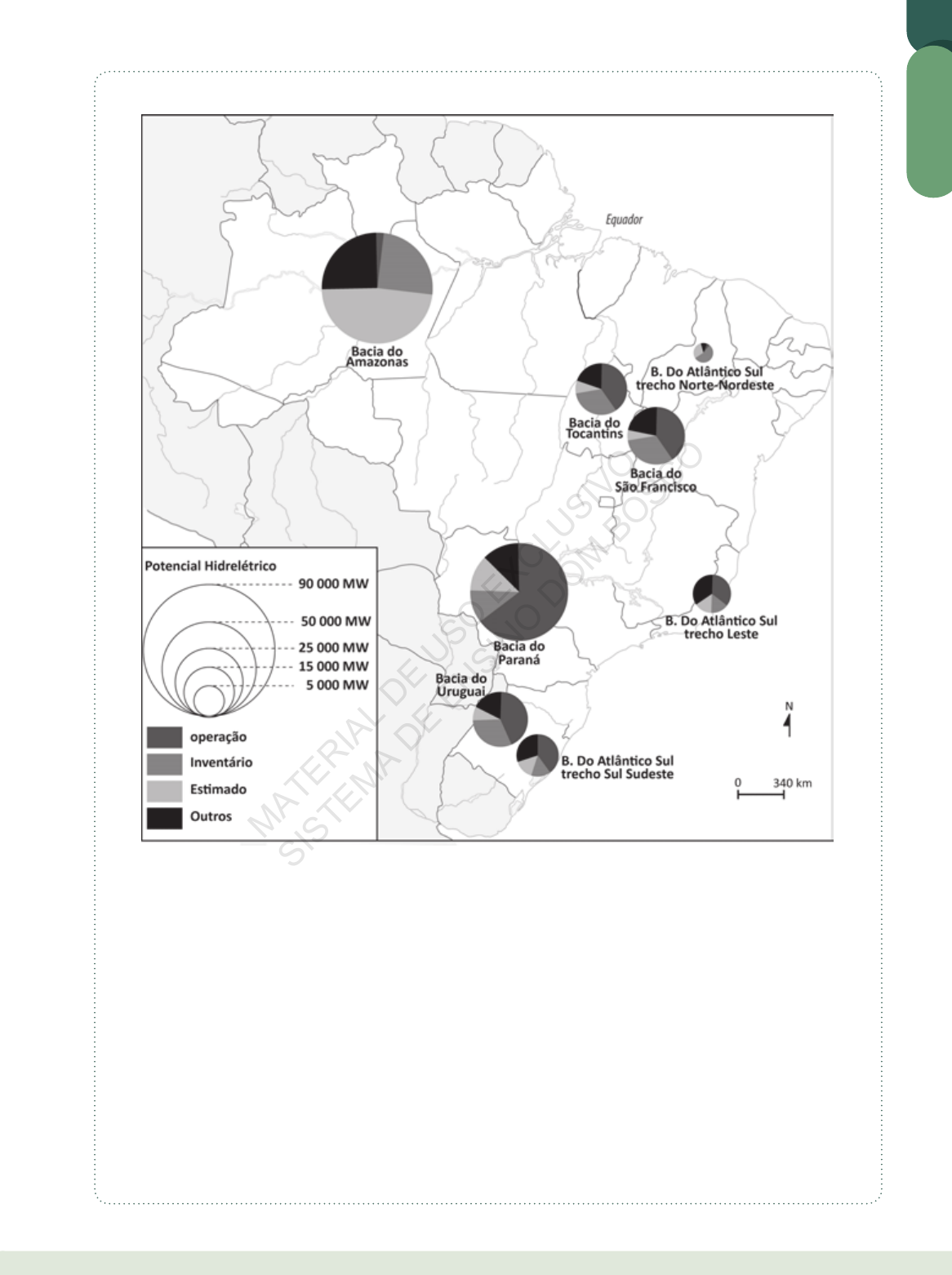 68. Analise o mapa. Pela análise do mapa, é perceptível que a) o maior potencial hidrelétrico está concentrado na bacia do Amazonas, área que concentra baixa densidade populacional. b) na bacia do Tocantins, o potencial para geração de energia já está praticamente esgotado, em rezão da produção de Tucuruí. c) a bacia do Paraná apresenta mais potencial inventariado do que potencial em operação, mesmo com a localização de Itaipu na referida bacia. d) não há produção hidrelétrica de destaque na bacia do São Francisco, visto que o referido rio é utilizado predominante- mente para navegação, por ser tipicamente um rio plano. e) a bacia do rio Uruguai é a que deve assumir em breve o destaque em nível nacional, já que seu potencial hidrelétrico é superior às demais expressas no mapa. 69. Enem – Considere o texto a seguir. No coração da floresta Amazônica, na região ao redor do rio Xingu e próxima ao município de Altamira, vem sendo cons- truída a usina hidrelétrica de Belo Monte, uma das maiores do mundo. Com capacidade instalada de 11 233 megawatts de energia elétrica, sendo 4 571 MW médios ao ano, o empreendimento a fio d’ água – quando a vazão das chuvas é pequena, ela gera menos energia – iniciou suas obras civis em junho de 2011 e deverá ter sua primeira máquina em operação em 2015 e a última até 2019. Revista Valor Econômico Estados. Fragmento. G EO G RA FI A 261 DB EM PV ENEM 91 AN LV 02 AT EXER_MIOLO.indb 261 07/02/2019 17:36 MATERIA L D E U SO E XCLU SIV O SIS TEMA D E E NSIN O D OM B OSCO Indique a alternativa que explica a sazonalidade na gera- ção de energia elétrica em Belo Monte. a) As áreas a montante da hidrelétrica apresentam ele- vado índice pluviométrico no inverno. b) O rio Xingu se forma no Brasil Central, onde predomi- na o clima tropical com invernos secos. c) O clima equatorial no Pará facilitará a geração cons- tante de energia durante o ano. d) O imenso reservatório de Belo Monte impedirá a os- cilação na geração de energia elétrica durante o ano. e) O relevo relativamente plano gera a sazonalidade na geração de energia elétrica em Belo Monte. 70. 5 0 1 4 3 2 Escala 0 620 km N No mapa sobre climas e domínios geomorfológicos bra- sileiros, podemos apontar como formações florestais apenas as de número: a) 0, 1 e 2. b) 1, 2 e 5. c) 2, 4 e 5. d) 3, 4 e 5. e) 1, 3 e 5. 71. O Brasil apresenta um sistema de drenagem anasto- masado, com uma rede gigantesca de afluência e su- bafluência. O fator climático intertropical pode ser res- ponsável por um período intenso de cheias e vazantes. Nosso relevo também contribui para uma diversificação de nascentes (mananciais), como é o caso de Minas Gerais, estado considerado a “caixa d’água” do Brasil. A justificativa para tal importância do estado de Minas Gerais está no fato de a) apresentar um sistema de drenagem nival glacial. b) este ser o estado que mais recebe influência dos rios voadores. c) ter localização privilegiada, com encontro de frentes, que convergem e formam massas. d) sofrer forte influência da massa de ar tropical atlân- tica, que adentra o território sem encontrar o relevo como obstáculo. e) apresentar domínio de climas úmidos e rochas com elevado grau de porosidade, facilitando o processo percolativo, o que facilita a formação de mananciais. 72. Nos domínios paisagísticos do Brasil, encontramos praticamente todos os biomas possíveis, desde a floresta equatorial até a caatinga. Tal diversidade está diretamente relacionada com a dimensão ter- ritorial de um país continental, que apresenta todas as condições para o gigantismo de tal ecossistema. Temos por volta de 15 mil quilômetros de fronteira continental, 8 mil quilômetros de fronteira oceânica. Uma característica marcante desse rico quadro natu- ral pode ser a) a floresta equatorial é rica em espécies, latifoliada, perenifólia, ombrófila, densa. Com tamanha seme- lhança, pode ser encontrada também no centro do continente africano e no Sudeste da Ásia. b) a presença forte da araucária na região Sul do Brasil e nos campos de altitude, já que o condicionamento para essa espécie é de ambientes mais úmidos e quentes. c) a diversidade de espécies encontradas no sertão, na caa- tinga, devido ao elevado volume de chuvas na região. d) a diversificação de extratos apresentados pelos man- gues, em toda a faixa litorânea. Extrato herbáceo, ar- bustivo e arbóreo. e) um grande domínio arbóreo na faixa litorânea, com raízes pneumatóforas, halófitas. 73. Após 20 meses de interrupção de seu uso, em razão da diminuição do nível dos reservatórios das hidrelétri- cas Três Irmãos e Ilha Solteira, no dia 27 de janeiro esta importante hidrovia foi reativada. A suspensão da navegação no trecho que fica no noroeste do estado de São Paulo atingiu principalmente o transporte de soja, milho, celulose e madeira. A retomada da navegação na hidrovia foi possível por causa da volta das chuvas re- gistradas na região. A hidrovia conecta áreas de produção aos portos maríti- mos e serve os principais centros do Mercosul, além de in- tegrar um sistema de transporte multimodal nos estados de São Paulo, do Paraná, de Mato Grosso do Sul, Goiás e Minas Gerais. Disponível em: . Adaptado. O texto está se referindo à hidrovia a) Tietê-Araguaia. b) Tietê-Paraguai. c) Tietê-Parnaíba. d) Tietê-Paraná. e) Tietê-Doce. 74. A transposição não fará reforma agrária O Fórum Nacional pela Reforma Agrária e Justiça no Campo, que congrega os movimentos sociais, organizações sindicais, pastorais e entidades de apoio, protagonistas das lutas do campo no Brasil, em reunião plenária do dia 30 de maio de 2007, em Brasília-DF, decidiu e comunica sua decisão contrária à transposição de águas do Rio São Fran- cisco para o chamado Nordeste Setentrional. Não foi suficiente todo o avanço das organizações da socie- da