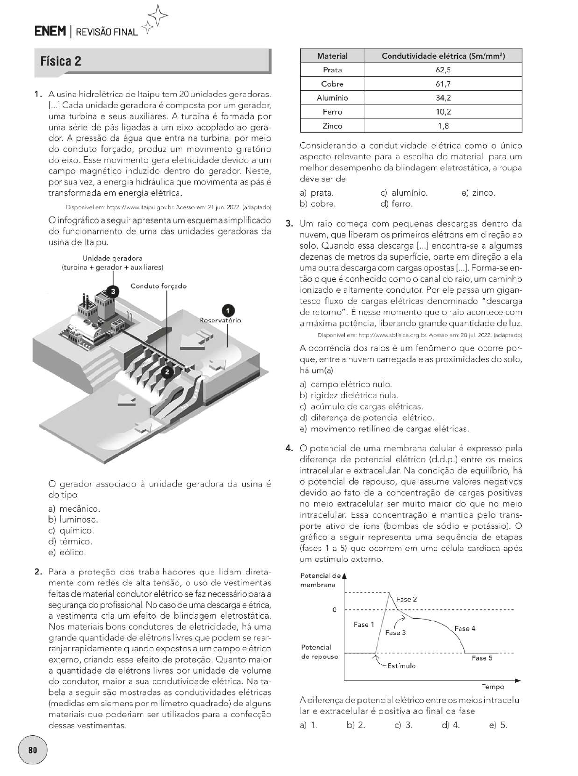 ENEM REVISÃO FINAL Física 2 Material Condutividade elétrica Prata 62,5 Cobre 61,7 1. A usina hidrelétrica de Itaipu tem 20 unidades geradoras. Alumínio 34,2 [...] Cada unidade geradora é composta por um gerador, Ferro uma turbina e seus auxiliares. A turbina é formada por 10,2 uma série de pás ligadas a um eixo acoplado ao gera- Zinco 1,8 dor. A pressão da água que entra na turbina, por meio do conduto forçado, produz um movimento giratório Considerando a condutividade elétrica como único do eixo. Esse movimento gera eletricidade devido a um aspecto relevante para a escolha do material, para um campo magnético induzido dentro do gerador. Neste, melhor desempenho da blindagem a roupa por sua vez, a energia hidráulica que movimenta as pás é deve ser de transformada em energia elétrica. a) prata. c) alumínio. e) zinco. Disponível em: Acesso 21 jun. 2022 (adaptado) b) cobre. d) ferro. infográfico a seguir apresenta um esquema simplificado 3. Um raio começa com pequenas descargas dentro da do funcionamento de uma das unidades geradoras da nuvem, que liberam os primeiros elétrons em direção ao usina de Itaipu. solo. Quando essa descarga [...] encontra-se a algumas Unidade geradora dezenas de metros da superfície, parte em direção a ela (turbina + gerador + auxiliares) uma outra descarga com cargas opostas [...]. Forma-se en- tão que é conhecido como canal do raio, um caminho Conduto forçado ionizado e altamente condutor. Por ele passa um gigan- tesco fluxo de cargas elétricas denominado "descarga 1 de É nesse momento que raio acontece com Reservatório a máxima potência, liberando grande quantidade de luz. Disponível em: Acesso em: 20 2022 (adaptado) A ocorrência dos raios é um fenômeno que ocorre por- que, entre a nuvem carregada e as proximidades do solo, há um(a) a) campo elétrico nulo. b) rigidez dielétrica nula. c) acúmulo de cargas elétricas. d) diferença de potencial elétrico. e) movimento retilíneo de cargas elétricas. 4. potencial de uma membrana celular é expresso pela diferença de potencial elétrico (d.d.p.) entre os meios intracelular e Na condição de equilíbrio, há 0 gerador associado à unidade geradora da usina é potencial de repouso, que assume valores negativos do tipo devido ao fato de a concentração de cargas positivas a) mecânico. no meio extracelular ser muito maior do que no meio b) intracelular. Essa concentração é mantida pelo trans- c) químico. porte ativo de (bombas de sódio e potássio). d) térmico. gráfico a seguir representa uma sequência de etapas e) (fases 1 a 5) que ocorrem em uma célula cardíaca após um estímulo externo. 2. Para a proteção dos trabalhadores que lidam direta- Potencial de mente com redes de alta tensão, uso de vestimentas membrana feitas de material condutor elétrico se faz necessário para a Fase 2 segurança do profissional. No caso de uma descarga elétrica, 0 a vestimenta cria um efeito de blindagem Nos materiais bons condutores de eletricidade, há uma Fase 1 Fase 4 Fase 3 grande quantidade de elétrons livres que podem se rear- ranjar rapidamente quando expostos a um campo elétrico Potencial externo, criando esse efeito de proteção. Quanto maior de repouso Fase 5 Estímulo a quantidade de elétrons livres por unidade de volume do condutor, maior a sua condutividade elétrica. Na ta- Tempo bela a seguir são mostradas as condutividades elétricas (medidas em siemens por milímetro quadrado) de alguns A diferença de potencial elétrico entre os meios intracelu- materiais que poderiam ser utilizados para a confecção lar e extracelular é positiva ao final da fase dessas vestimentas. a) 1. b) 2. c) 3. d) 4. e) 5. 80Ciências da Natureza e suas Tecnologias 5. Parte da energia elétrica transmitida das usinas geradoras até as unidades consumidoras é dissipada nos cabos de transmissão Assim, quanto mais ineficiente é esse pro- cesso, maior impacto na conta a ser paga pelo usuário Fio de torção Uma das estratégias adotadas para minimizar essa perda de energia é a transmissão sob alta Contrapeso a) tensão. b) corrente. Haste c) resistência. d) capacitância. e) potência dissipada. 6. Um técnico em eletrotécnica foi chamado para solucionar Considere que fio permanece na vertical e que ângulo um problema em uma instalação elétrica residencial. de torção é diretamente proporcional à força elétrica disjuntor principal da instalação, que suporta corrente entre as cargas. máxima de 40 A, desarma sempre que determinados Se a carga das esferas for dobrada e a distância entre elas equipamentos eletrônicos da residência são acionados for mantida, ângulo de torção no equilíbrio estático do simultaneamente, mesmo estando dentro da demanda sistema será equivalente a contratada na concessionária de energia elétrica. a a) c) a e) 4a Uma das soluções para esse problema seria 4 a) adicionar receptores elétricos aos equipamentos b) d) 2a b) instalar capacitores de alta carga no circuito elétrico 8. Ruptura dielétrica da residência. c) aumentar a resistência equivalente do circuito elétrico Quando imersos em campos elétricos muito intensos, da residência. alguns materiais isolantes podem ser ionizados, tornan- d) trocar disjuntor por outro que suporte uma menor do-se condutores. Isso é muito comum de ocorrer, por corrente elétrica. exemplo, no ar As faíscas e os e) utilizar painéis fotovoltaicos para gerar mais energia são exemplos típicos do fenômeno chamado ruptura Para ar, ele ocorre com campos elétricos da para a residência. ordem de 3 7. Em 1784, Charles Augustin de Coulomb, um físico fran- Disponível Acesso em: 12 ago 2020 cês, fez um experimento que é considerado um dos mais Considere que uma esfera de dimensões célebres já Coulomb utilizou uma balança de e de carga de 2 10-2 está no e tem constante ele- torção para verificar a interação eletrostática entre duas trostática de 9 N gerando único campo carga