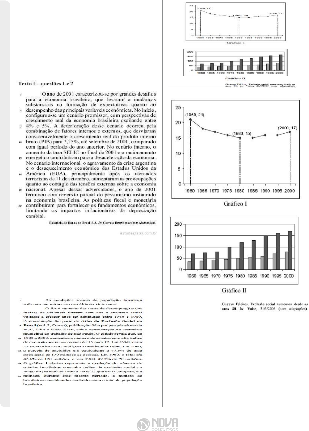 6 BA N CO D O B RA SI L Relativamente ao texto e ao assunto nele tratado, julgue os itens seguintes. O sinal indicativo de crase em “àqueles” (l.9) indica que ocorre aí uma preposição, a, por exigência do substanti- vo “agrado” (l.8), segundo as regras de regência da nor- ma culta. ( ) CERTO ( ) ERRADO 14. (BANCO DO BRASIL – ESCRITURÁRIO – CESPE – 2002) O uso do sinal indicativo de crase em “levaram a mudan- ças” (l.2) é facultativo, porque “mudanças” está no plural. ( ) CERTO ( ) ERRADO 15. (BANCO DO BRASIL – ESCRITURÁRIO – CESPE – 2003) Com relação ao texto IV e a aspectos de língua portu- guesa e de matemática nele encontrados, julgue o item que se segue. Em “a 47,3%” (L.13), seria correto introduzir o sinal indi- cativo de crase em “a”. ( ) CERTO ( ) ERRADO 7 BA N CO D O B RA SI L 16. (BANCO DO BRASIL – ESCRITURÁRIO – CESPE – 2003) Texto II 1 A sociedade brasileira clama por transformações e a esperança tornou-se palavra-chave desses novos tempos. A superação dos graves problemas que afligem o povo 4 brasileiro, como a fome e a miséria, é o principal desa- fio do novo governo. Vencer as desigualdades faz parte de uma 7 estratégia e de um novo modelo de desenvolvimento para o país, que pode dispor, para tanto, da imensa ri- queza natural de nossa Nação. 10 A construção de um novo momento histórico é um compromisso que deve estar pautado em todas as ações de governo. Nesse contexto é que afirmamos o direito da 13 sociedade brasileira à informação e à educação. O caminho, portanto, é o da inclusão social, momento em que deve ser construída uma nova cultura embasada nos direitos 16 fundamentais da vida humana, fortalecidos na con- cepção e na prática de uma nova política social e econô- mica para o país. Acerca do texto II e do tema nele abordado, julgue o item subsequente. O emprego dos sinais indicativos de crase antes de “in- formação” (L.13) e de “educação” (L.13) mostra que estes substantivos complementam “direito” (L.12). ( ) CERTO ( ) ERRADO 17. (BANCO DO BRASIL – ESCRITURÁRIO – CESPE – 2003) 1 O Centro Cultural Banco do Brasil (CCBB) chega a Pernambuco disposto a0 fomentar ainda mais a rica produção cultural do estado. Música, teatro, 4 literatura, cinema e artes plásticas se unem para formar um pólo criativo que alia tradição e modernidade em um precioso equilíbrio. Além de receber o talento local de 7 braços abertos, na antiga estação ferroviária central do Recife, o CCBB pretende, enfim, transformar em realidade o tão sonhado caminho de mão dupla entre o 10 Nordeste e as demais regiões brasileiras. Erguida des- de sempre, essa ponte imaginária insiste até hoje em bloquear o tráfego em um dos sentidos. Rodrigo Alves. Veredas — Revista de Cultura do Banco do Brasil, n.º 90, jun./2003, p. 21 (com adaptações). Em “disposto a fomentar” (L.2), se fosse empregado o sinal indicativo de crase em “a”, isso não causaria erro gramatical. ( ) CERTO ( ) ERRADO 18. (BANCO DO BRASIL – ESCRITURÁRIO – CESPE – 2007) 1 Não foi por falta de aviso. Desde 2004, a Aeronáutica vem advertindo dos riscos do desinvestimento no con- trole do tráfego aéreo. Ao apresentar suas propostas 4 orçamentárias de 2004, 2005 e 2006, o Departamento de Controle do Espaço Aéreo (DECEA) informou, por escrito, que a não liberação integral dos recursos pedidos levaria 7 à situação vivida agora no país. Mesmo assim, as verbas foram cortadas ano após ano pelo governo, em dois momentos: primeiro no orçamento, depois na liberação 10 efetiva do dinheiro. As advertências do DECEA foram feitas à Secretaria de Orçamento Federal do Ministério do 13 Planejamento, na oportunidade em que foram solicita- das verbas para “operação, manutenção, desenvolvimento e modernização do Sistema de Controle do Espaço Aéreo 16 Brasileiro (SISCEAB)”. Elas são citadas em relatório do Tribunal de Contas da União (TCU). O Estado de S.Paulo, 25/3/2007, p. C6 (com adaptações). Com referência às estruturas e às ideias do texto, bem como a aspectos associados aos temas nele tratados, jul- gue o próximo item. O sinal indicativo de crase em “à situação” (L7) justifica- -se pela regência de “pedidos” (L6) e pela presença de artigo definido, feminino, singular. ( ) CERTO ( ) ERRADO 19. (BANCO DO BRASIL – ESCRITURÁRIO – CESPE – 2007) O emprego de sinal indicativo de crase em “à Airbus” (l.13) justifica-se pela regência de “ajuda” (l.12) e pela presença de artigo definido feminino singular. ( ) CERTO ( ) ERRADO 8 BA N CO D O B RA SI L 20. (BANCO DO BRASIL – ESCRITURÁRIO – CESGRAN- RIO – 2018) De acordo com as exigências da norma- -padrão da língua portuguesa, o verbo destacado está corretamente empregado em: a) No mundo moderno, conferem-se às grandes metró- poles importante papel no desenvolvimento da eco- nomia e da geopolítica mundiais, por estarem no topo da hierarquia urbana. b) Conforme o grau de influência e importância interna- cional, classificou-se as 50 maiores cidades em três diferentes classes, a maior parte delas na Europa. c) Há quase duzentos anos, atribuem-se às cidades a responsabilidade de motor propulsor do desenvolvi- mento e a condição de lugar privilegiado para os ne- gócios e a cultura. d) Em centros com grandes aglomerações populacionais, realiza-se negócios nacionais e internacionais, além de um atendimento bastante diversificado, como jor- nais, teatros, cinemas, entre outros. e) Em todos os estudos geopolíticos, considera-se as ci- dades globais como verdadeiros polos de influência internacional, devido à presença de sedes de grandes empresas transnacionais e importantes centros de pesquisas. 21. (BANCO DO BRASIL – ESCRITURÁRIO – CESGRAN- RIO – 2015) Após ler o texto, que é uma reportagem, um funcionário do jornal decidiu enviá-lo por e-mail a um colega, mas, além do