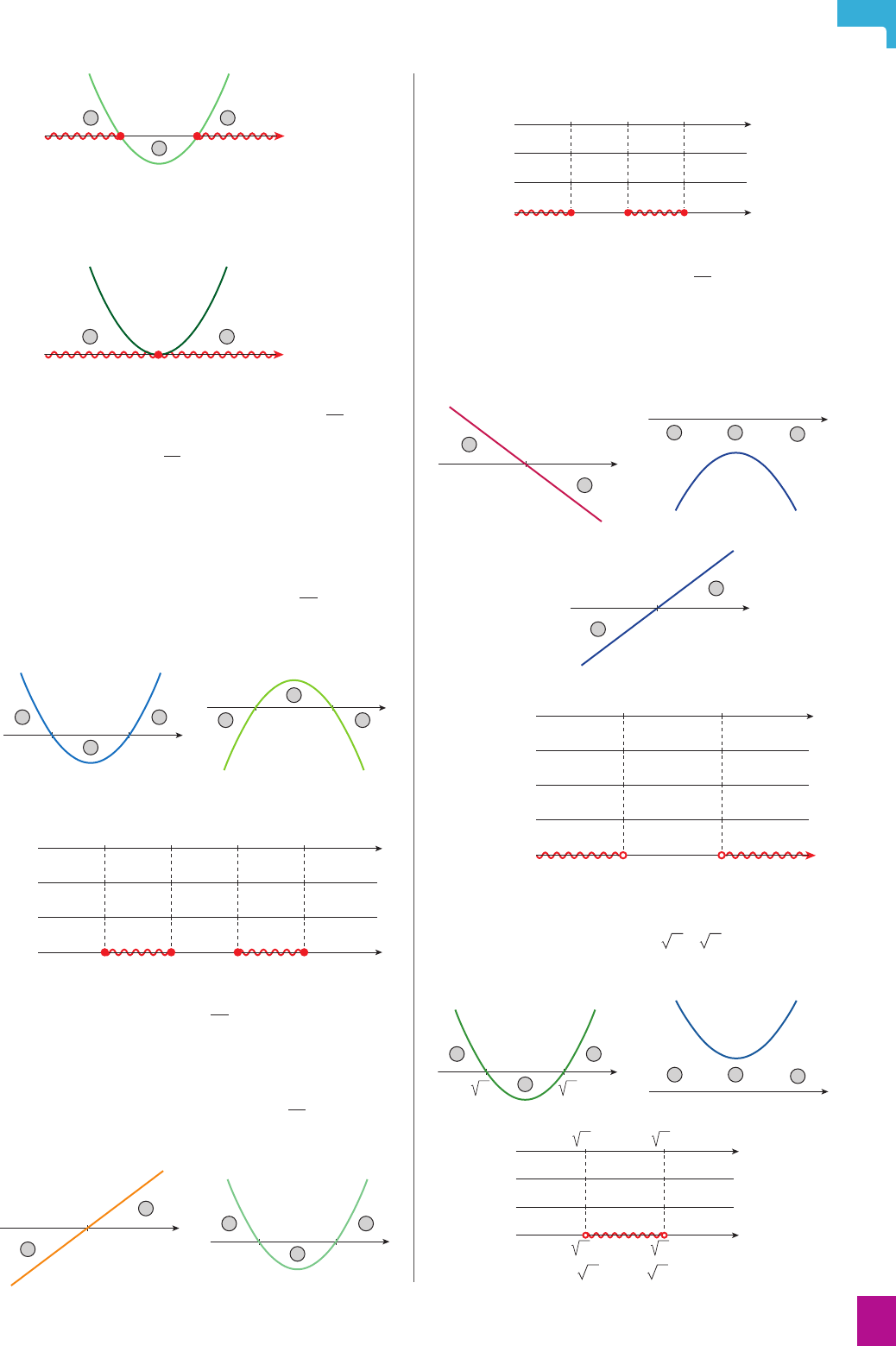 55 Resolução dos exercícios x ++ – 20 { | 0 }x 2Ñ RS x xou5 e) Æx x x x4 4 4 4 02 2 2 1> > ( )f x 2 2 \ x 2 2 4x 1 4 5 0 V x 5 2 x ++ 2 S 5 R f ) (22x 1 1)2 . 0 V 22x 1 1 i 0 V x 2 1i |Ñ R iS x x 2 15 ) 3 Nesse item, o aluno deve perceber que qualquer número real ou expressão real, elevados ao quadrado, serão sempre positivos ou nulos. 60. a) (3x 2 2 10x 1 7)(2x 2 1 4x) > 0 f (x) 5 3x 2 2 10x 1 7 : ef 1 3 7zeros dee o g(x) 5 2x 2 1 4x (zeros de g: 0 e 4) Sinal de f Sinal de g x ++ –1 7 3 — x–– +0 4 Quadro de sinais + + 1 10 0 4 4 – + + – + – g + + +–f – – + 7 3 — 7 3 — f • g |0 1Ñ RS x x x 3 7 4ou5