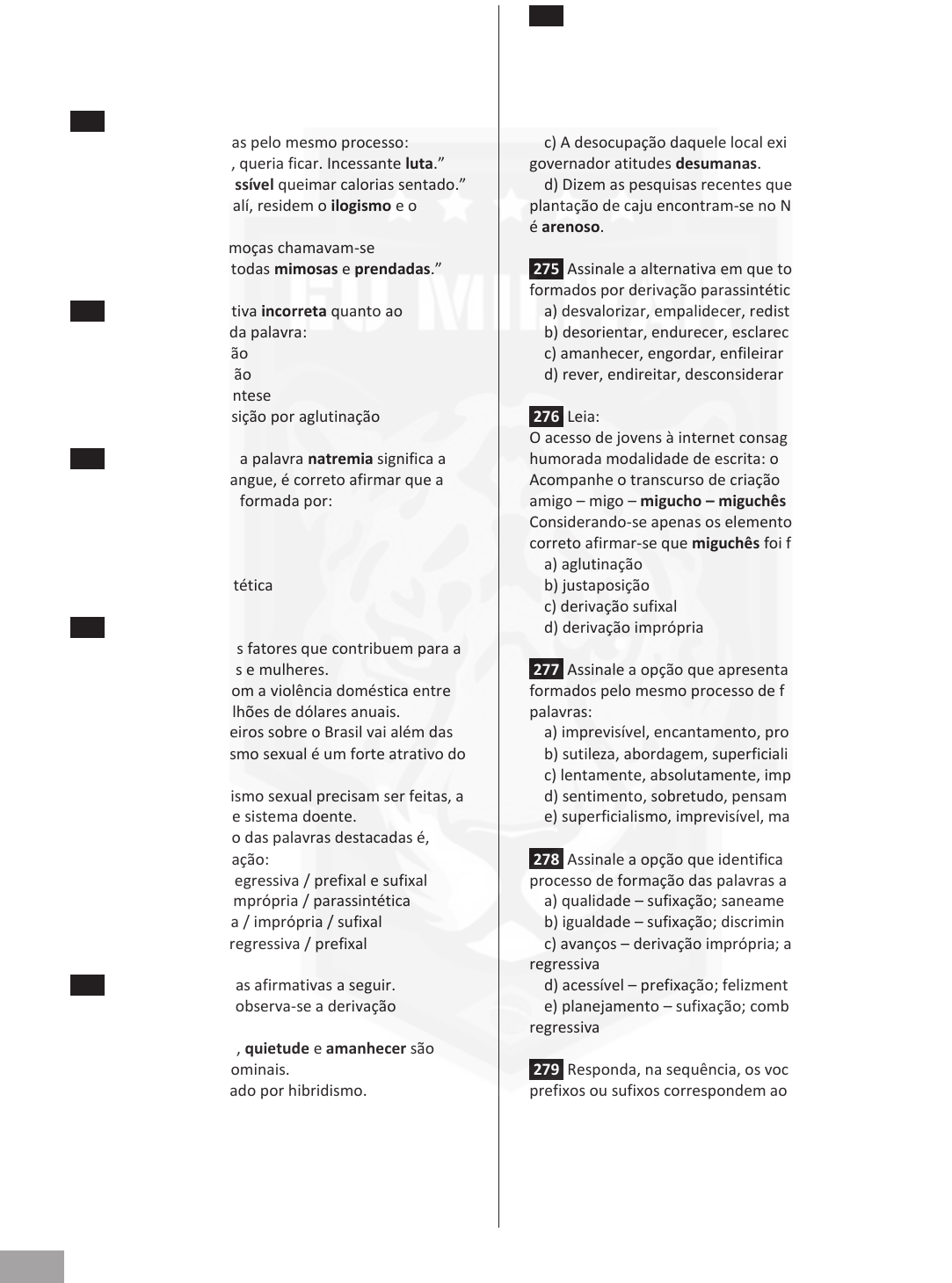 30 EU M IL IT A R - A PO ST IL A D E PO R T U G U ÊS b) “São as afeições como as vidas.” c) “Porque não há amor tão robusto.” d) “O mesmo amar é causa de não amar.” e) “Afrouxa-lhe o arco, com que já não tira.” 269 Assinale a alternativa em que todas as palavras destacadas são formadas pelo mesmo processo: a) “Queria ir embora, queria ficar. Incessante luta.” b) “Incrível, mas é possível queimar calorias sentado.” c) “Nos quadros de Dalí, residem o ilogismo e o enigmático.” d) “Antigamente, as moças chamavam-se mademoiselles e eram todas mimosas e prendadas.” 270 Assinale a alternativa incorreta quanto ao processo de formação da palavra: a) ante-sala: prefixação b) fragilidade: sufixação c) expropriar: parassíntese d) policromo: composição por aglutinação 271 Considerando que a palavra natremia significa a presença de sódio no sangue, é correto afirmar que a palavra hiponatremia é formada por: a) aglutinação b) justaposição c) derivação prefixal d) derivação parassintética 272 Leia: I. O alcoolismo é um dos fatores que contribuem para a violência contra crianças e mulheres. II. Nos EUA, os gastos com a violência doméstica entre casais ultrapassa 5,8 bilhões de dólares anuais. III. O olhar dos estrangeiros sobre o Brasil vai além das belezas naturais; o turismo sexual é um forte atrativo do país. IV. As denúncias de turismo sexual precisam ser feitas, a fim de enfraquecer esse sistema doente. O processo de formação das palavras destacadas é, respectivamente, derivação: a) sufixal / prefixal / regressiva / prefixal e sufixal b) sufixal / prefixal / imprópria / parassintética c) prefixal / regressiva / imprópria / sufixal d) prefixal / sufixal / regressiva / prefixal 273 Leia atentamente as afirmativas a seguir. I – No vocábulo alistar, observa-se a derivação parassintética. II – Os vocábulos riacho, quietude e amanhecer são formados por sufixos nominais. III – Automóvel é formado por hibridismo. Está(ão) correta(s) apenas a(s) afirmativa(s): a) I b) II c) I e III d) II e III 274 Em qual das alternativas a palavra em destaque é formada por prefixação? a) Sedentos, aqueles pobres homens caminhavam pela areia quente do deserto. b) O chefe, embora tivesse um semblante muito sisudo, possuía um enorme coração. c) A desocupação daquele local exigiu do prefeito e do governador atitudes desumanas. d) Dizem as pesquisas recentes que mais de 98% da plantação de caju encontram-se no Nordeste, cujo solo é arenoso. 275 Assinale a alternativa em que todos os verbos são formados por derivação parassintética: a) desvalorizar, empalidecer, redistribuir b) desorientar, endurecer, esclarecer c) amanhecer, engordar, enfileirar d) rever, endireitar, desconsiderar 276 Leia: O acesso de jovens à internet consagrou uma bem humorada modalidade de escrita: o miguchês. Acompanhe o transcurso de criação dessa palavra: amigo – migo – migucho – miguchês Considerando-se apenas os elementos em negrito, é correto afirmar-se que miguchês foi formada por: a) aglutinação b) justaposição c) derivação sufixal d) derivação imprópria 277 Assinale a opção que apresenta todos os vocábulos formados pelo mesmo processo de formação de palavras: a) imprevisível, encantamento, profundamente b) sutileza, abordagem, superficialismo c) lentamente, absolutamente, imprevisível d) sentimento, sobretudo, pensamento e) superficialismo, imprevisível, maleável 278 Assinale a opção que identifica corretamente o processo de formação das palavras adiante: a) qualidade – sufixação; saneamento – sufixação b) igualdade – sufixação; discriminação – parassíntese c) avanços – derivação imprópria; acesso – derivação regressiva d) acessível – prefixação; felizmente – sufixação e) planejamento – sufixação; combate – derivação regressiva 279 Responda, na sequência, os vocábulos cujos prefixos ou sufixos correspondem aos seguintes significados: QUASE; ATRAVÉS; EM TORNO DE; FORA; SIMULTANEIDADE a) hemisfério; trasladar; justapor; epiderme; parasita b) semicírculo; metamorfose; retrocesso; ultrapassar; circunavegação 31 EU M IL IT A R - A PO ST IL A D E PO R T U G U ÊS c) penumbra; diálogo; periscópio; exogamia; sintaxe d) visconde; ultrapassar; unifamiliar; programa; multinacional e) pressupor; posteridade; companhia; abdicar; ambivalente 280 Assinale a alternativa que contém um grupo de palavras cujos prefixos possuem o mesmo significado. a) compartilhar – sincronizar b) hemiciclo - endocarpo c) infeliz - encéfalo d) transparente - adjunto e) benevolente - diáfano 281 Assinale a opção em que todas as palavras correspondem à mesma origem: a) do árabe: algodão, almofada, alagamento b) do inglês: xampu, esporte, futebol c) do japonês: judô, gueixa, ameixa d) do chinês: chá, nanquim, mirim e) do francês: toalete, tricô, licor 282 Assinale a alternativa em que todas as palavras são formadas por prefixos com significação Semelhante: a) metamorfose – metáfora – meteoro – malcriado b) apogeu – aversão – apóstata – abster c) síncope – simpatia – sobreloja – sílaba d) êxodo – embarcar – engarrafar – enterrar e) débil – declive – desgraça – decapitar 283 Quanto à estrutura e à formação de palavras, assinale a alternativa correta: a) perfeição e percurso são palavras cognatas b) em combatente, ocorre derivação parassintética c) A palavra pontiagudo é formada por justaposição d) Em exportar e êxodo, os prefixos têm sentido correspondente e) Em hipótese, o prefixo indica “antes, anterioridade” 284 Em “um item insignificante utilizado brevemente antes de ser descartado”, as palavras grifadas são formadas, respectivamente, por: a) sufixação; derivação imprópria b) prefixação; derivação prefixal e sufixal c) aglutinação; hibridismo d) parassíntese; sufixação e) derivação